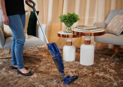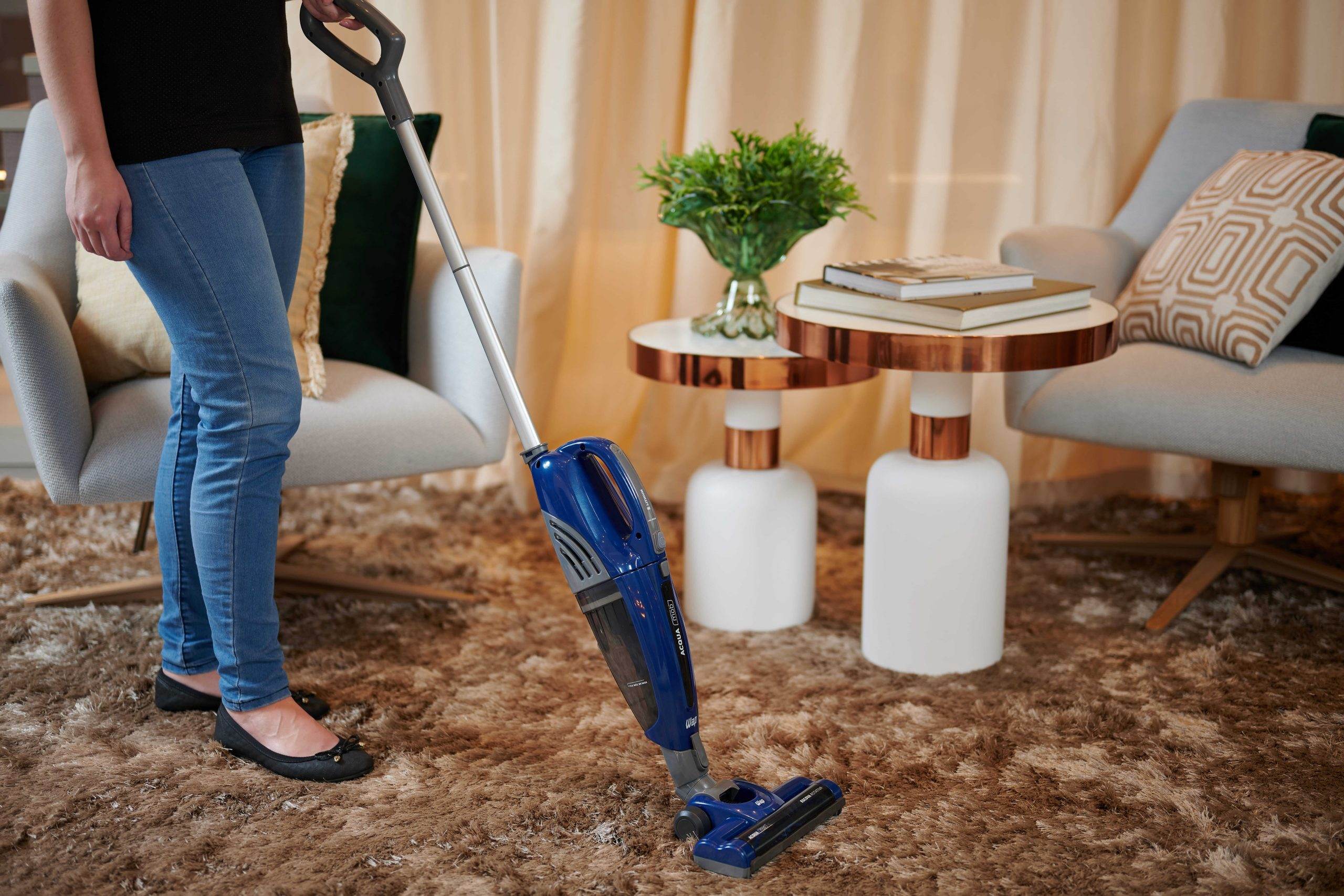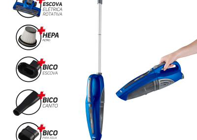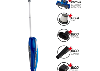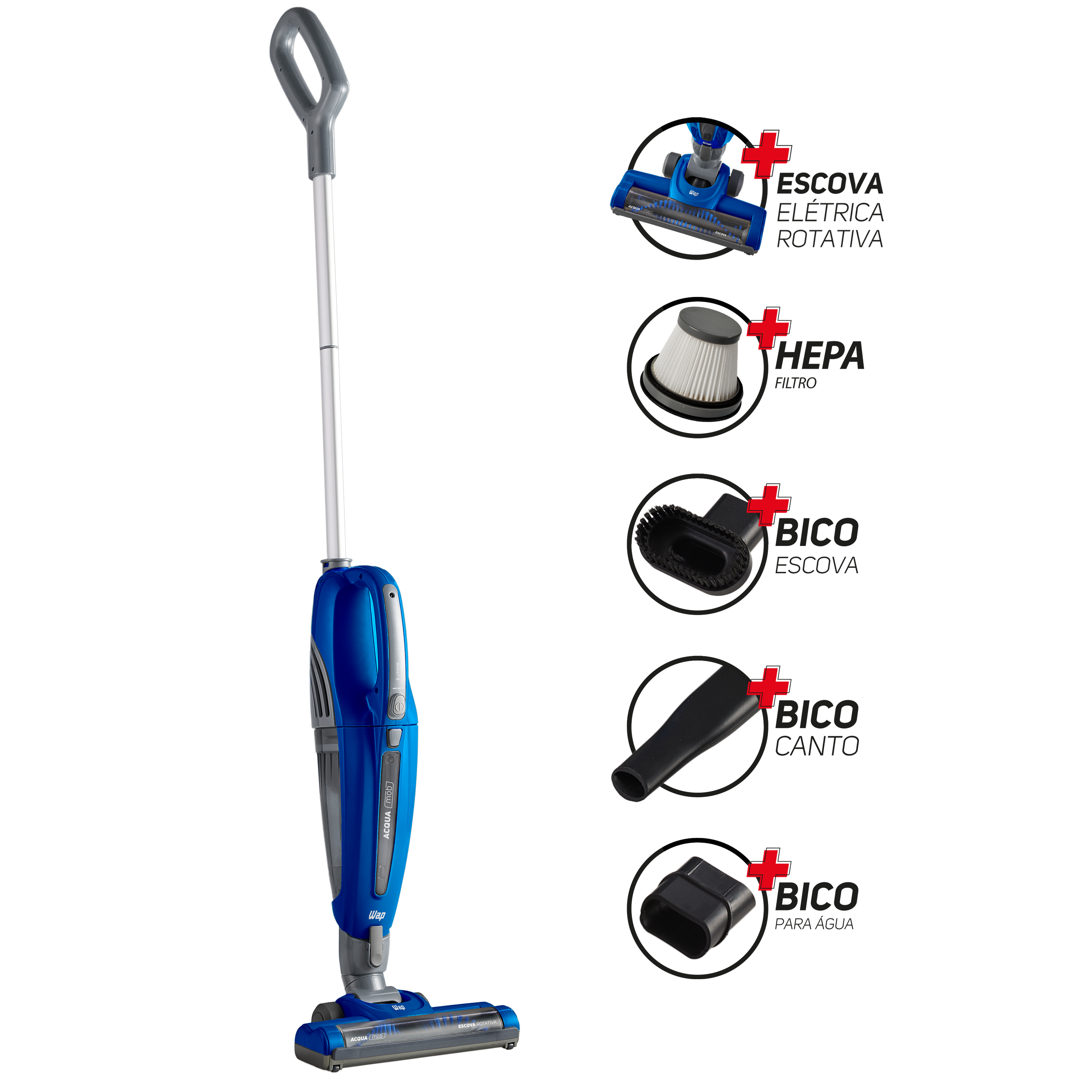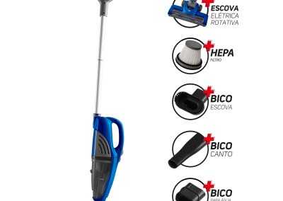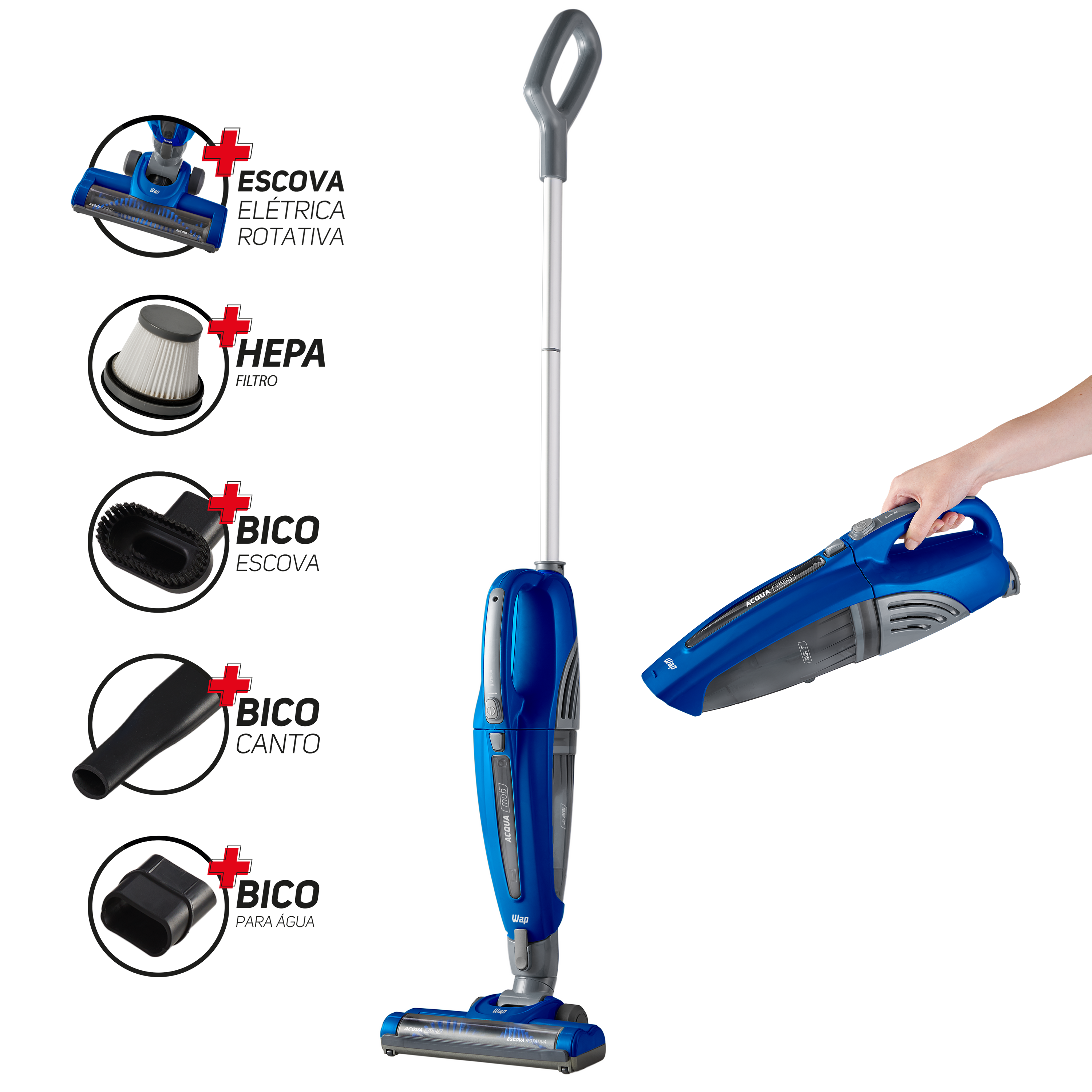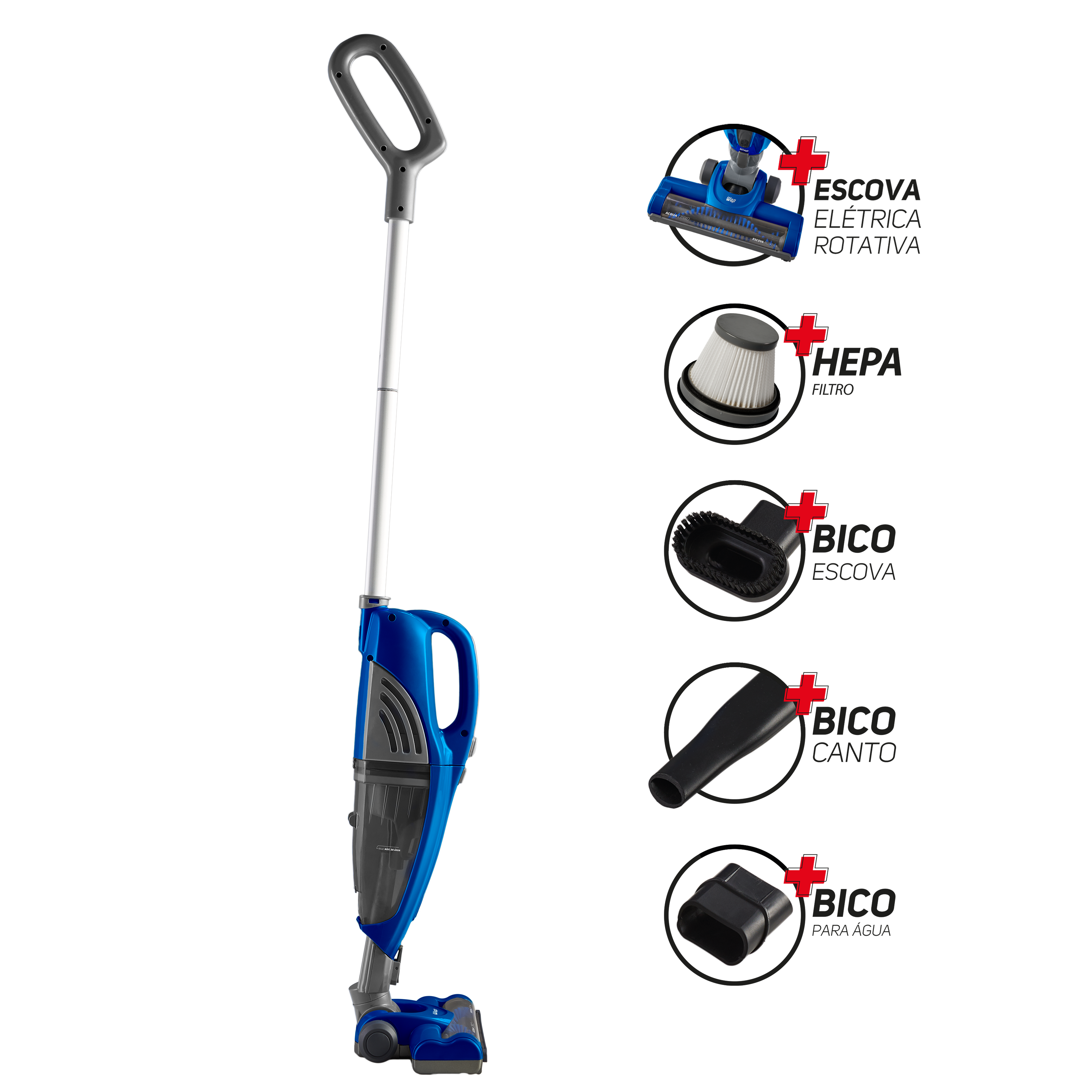 Com até 30 minutos de autonomia, conta com filtro Hepa, que retém ácaros, fungos e bactérias, e seu sistema de filtragem retorna um ar mais puro para o ambiente. Fabricado em Polipropileno nas cores azul e cinza, o produto é bivolt, possui bateria de Lithium com potência de 14,8VDC e pode ser usado no formato vertical para limpar pisos, tapetes e carpetes. Conta com a tecnologia 180° que permite mais mobilidade e facilita o trabalho para aspirar locais de difícil acesso, como embaixo de camas, sofás, mesas e cadeiras.