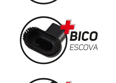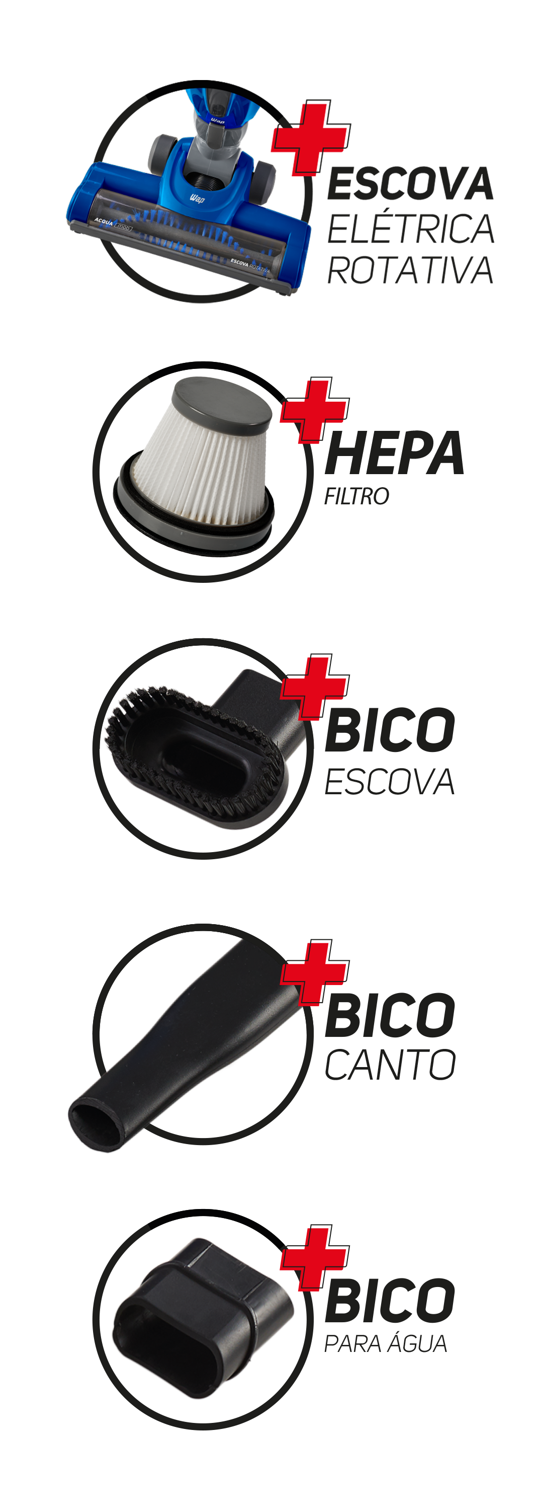 | 1 Bico para cantos e frestas. 1 Bico emborrachado para sucção de água. 1 Bico escova para estofados. 1 Bico múltiplo articulável com escova elétrica rotativa. 1 Alça extensora de alumínio para posição vertical. 1 Filtro HEPA lavável. |