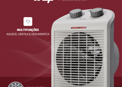 - 3 em 1: Aquecedor, Ventilador Circulador e Desumidificador.