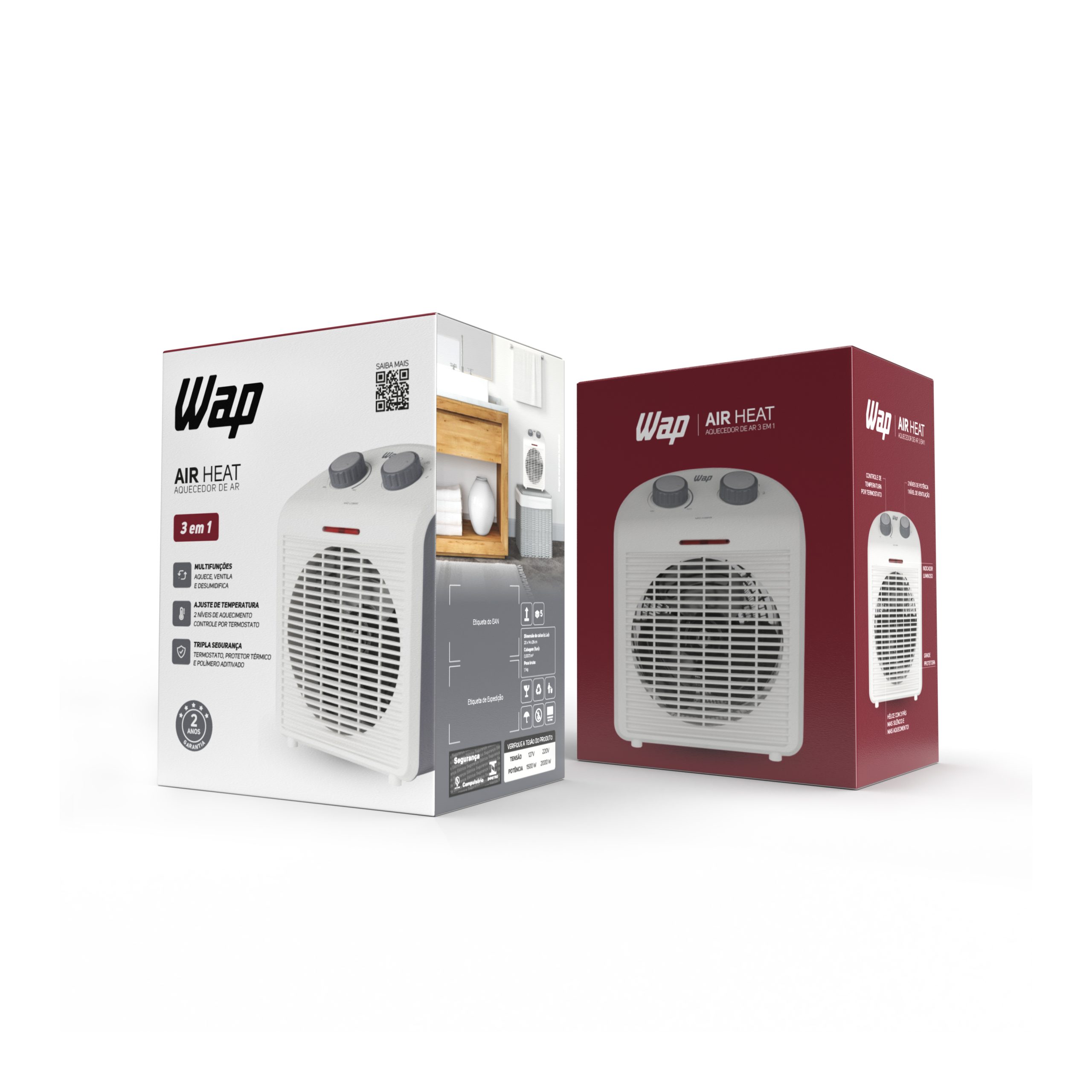 Esse produto possui um triplo sistema de segurança: Protetor térmico que desliga o aquecedor em casos de superaquecimento, Termostato que regula e controla a temperatura e Polímero Aditivado em sua produção, que oferece mais resistência e segurança ao produto. Além disso, possui grades protetoras que evitam o contato com as hélices e os dispositivos de aquecimento. Ele possui 3 funcionalidades: aquece, circula e desumidifica o ambiente. O aquecedor de ar WAP AIR HEAT, possui 1500W para 127V e 2000W de potência para 220V, deixando o seu ambiente ainda mais confortável.