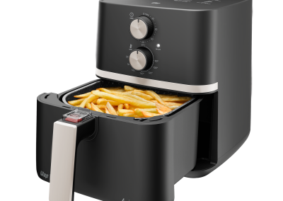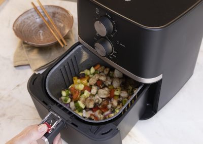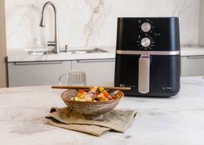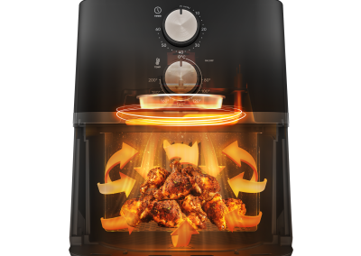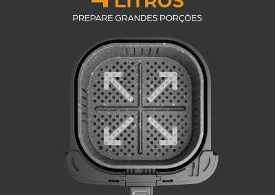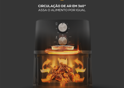 A tecnologia de circulação de ar em 360° garante um cozimento uniforme do alimento, deixando-o crocante por fora e macio por dentro, além de eliminar o óleo em excesso, proporcionando pratos mais saudáveis.