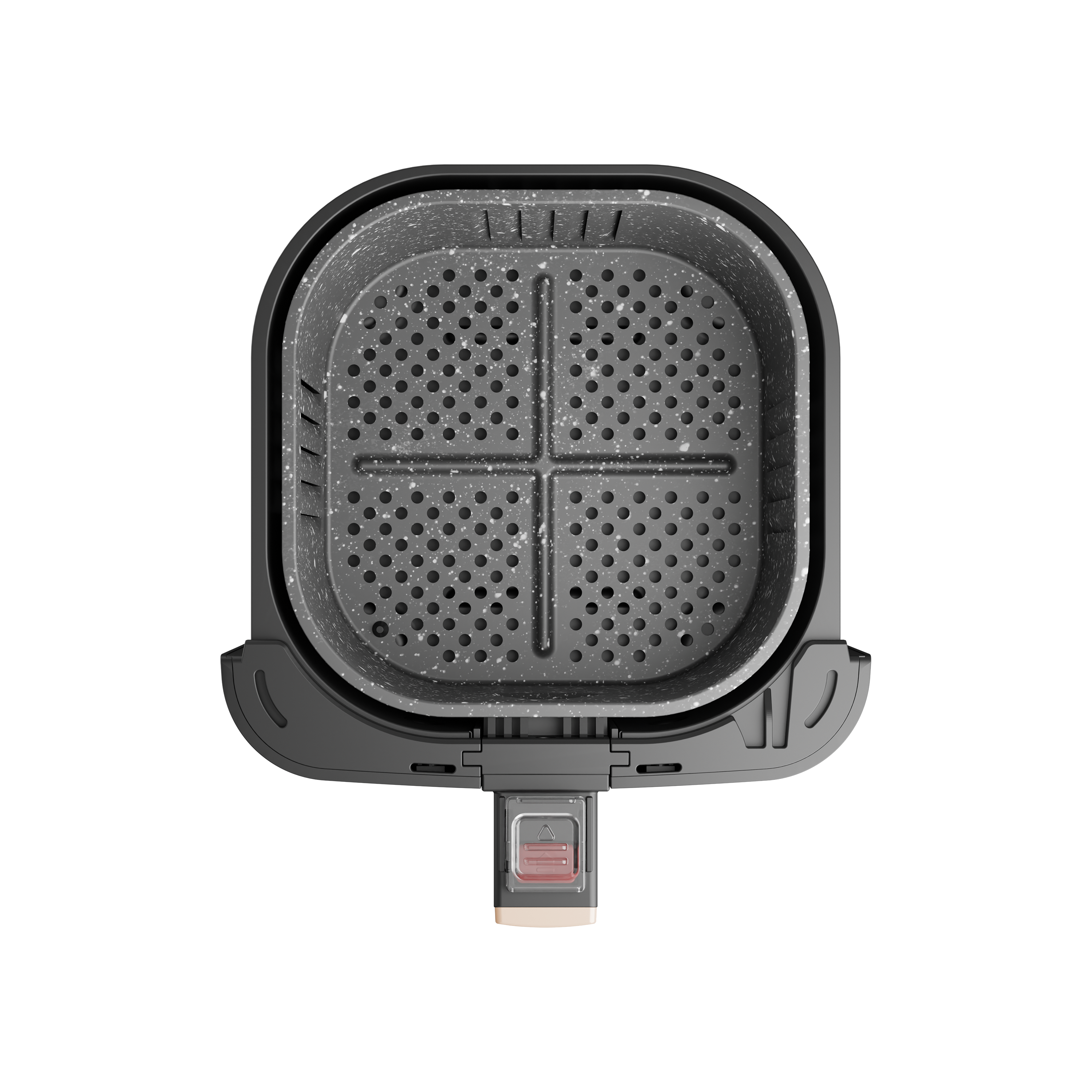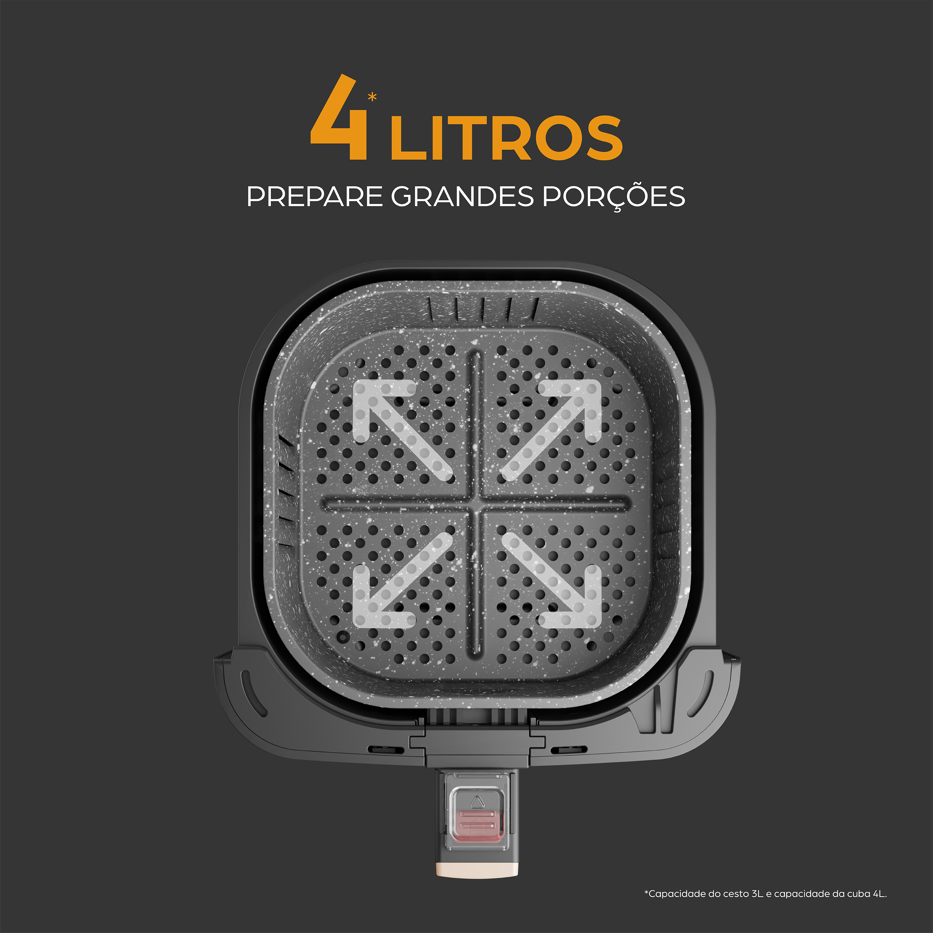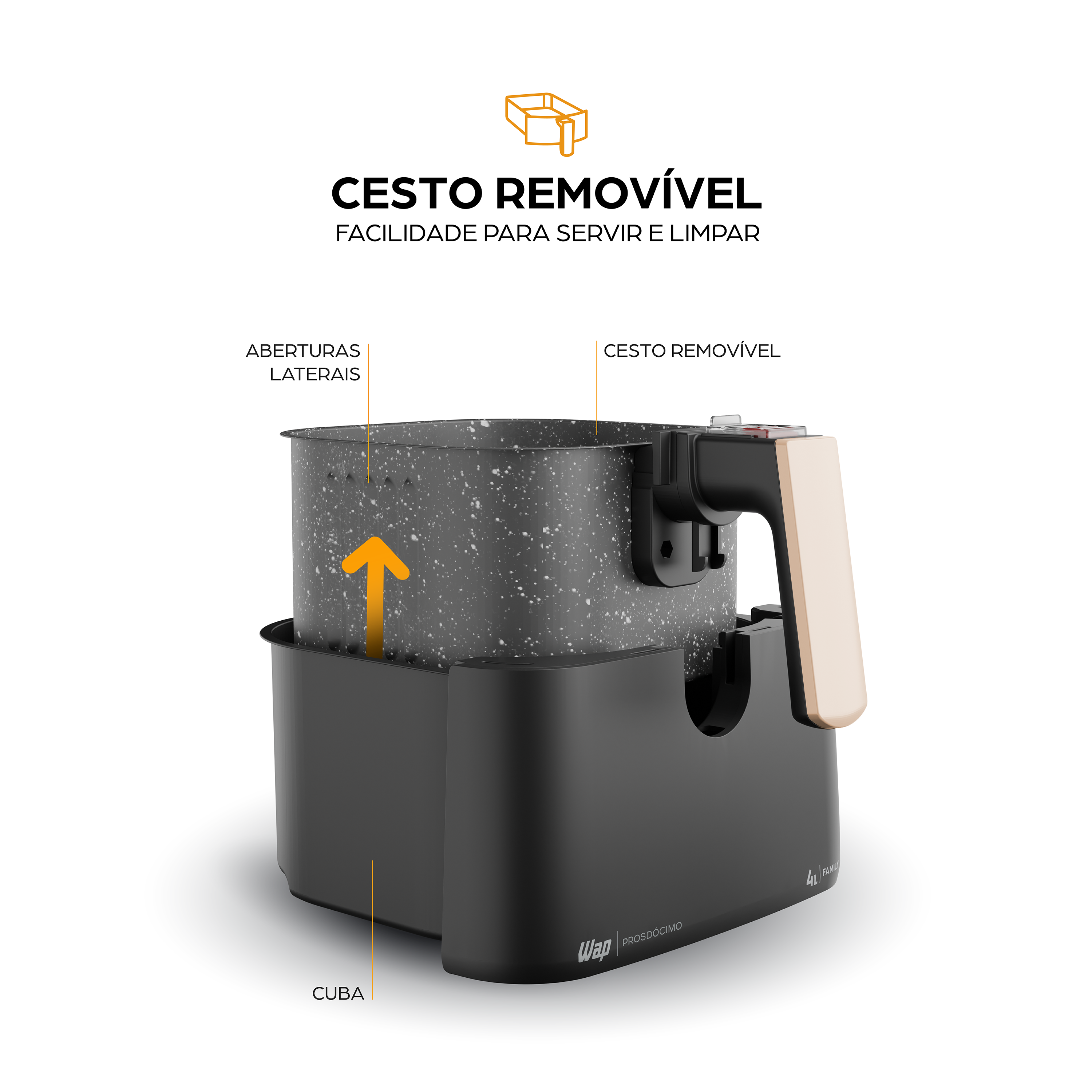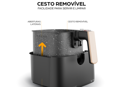 - A tecnologia antiaderente presente no cesto simplifica a limpeza, prevenindo que gordura e alimentos grudem no recipiente.