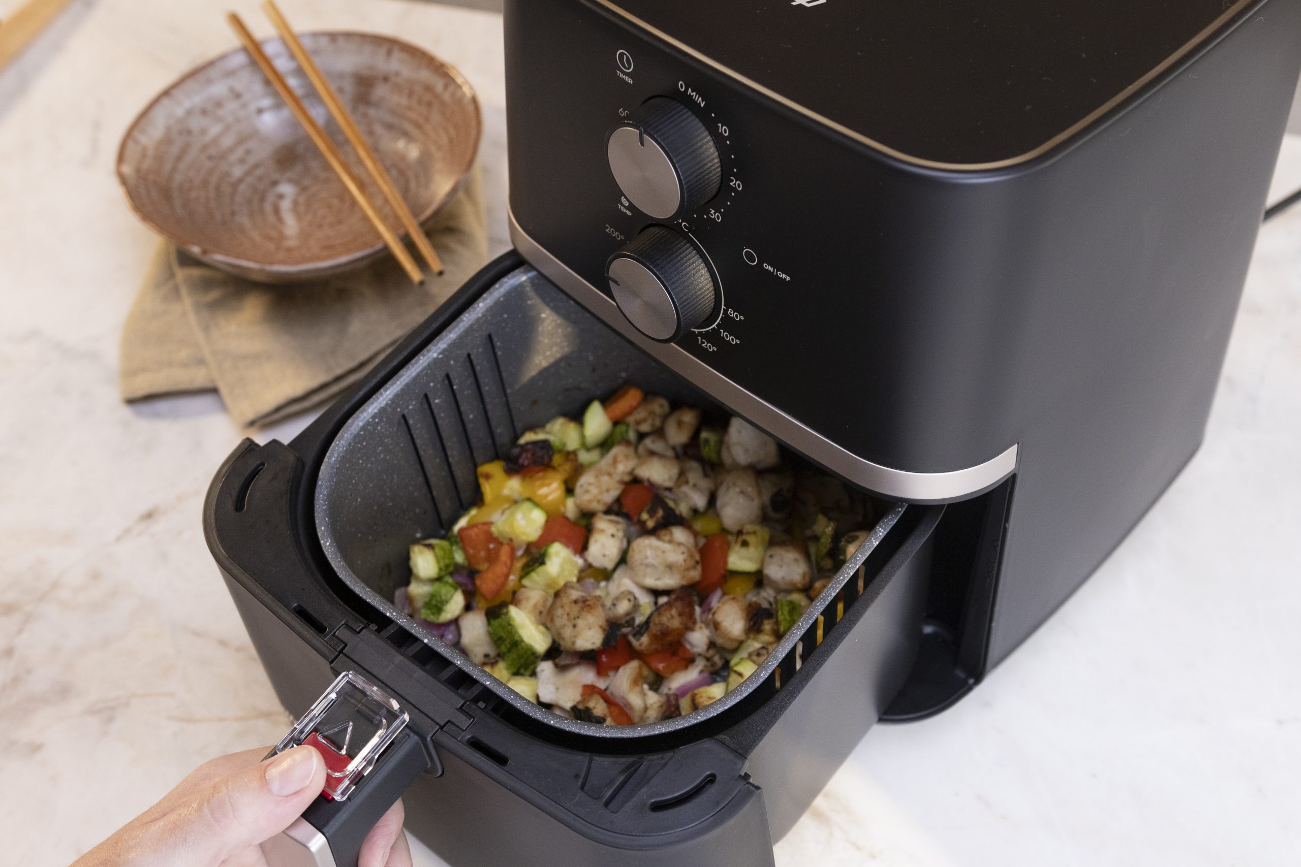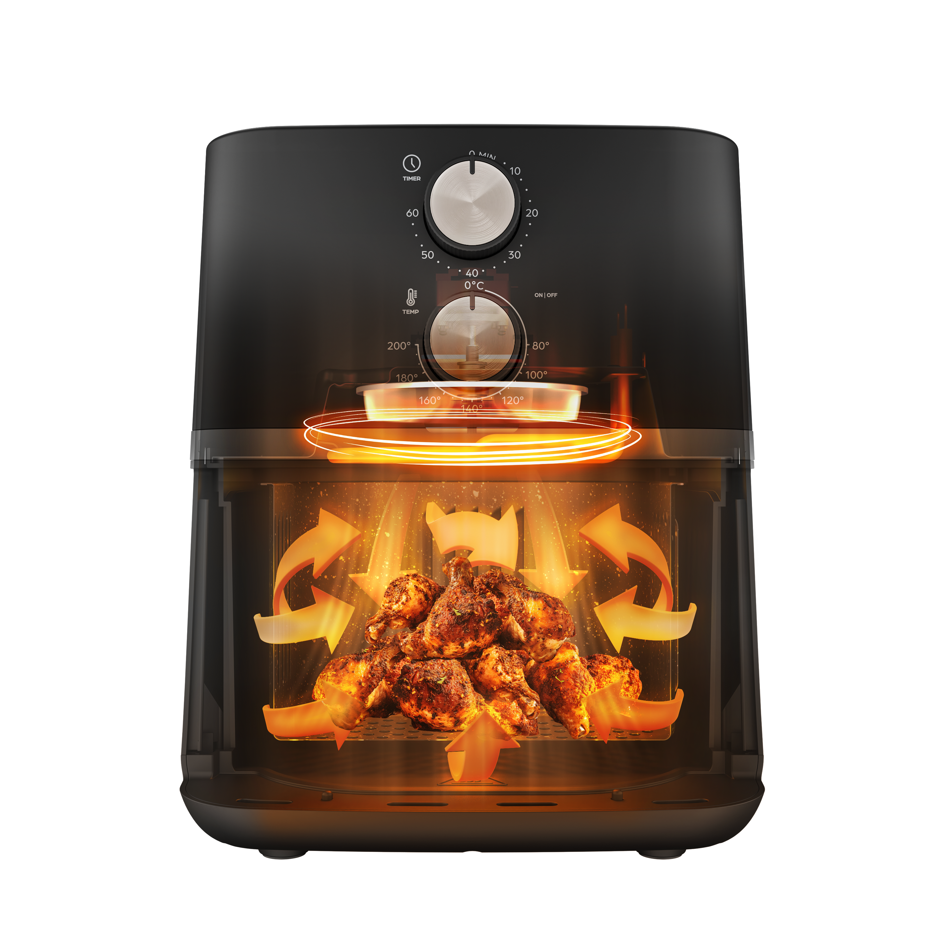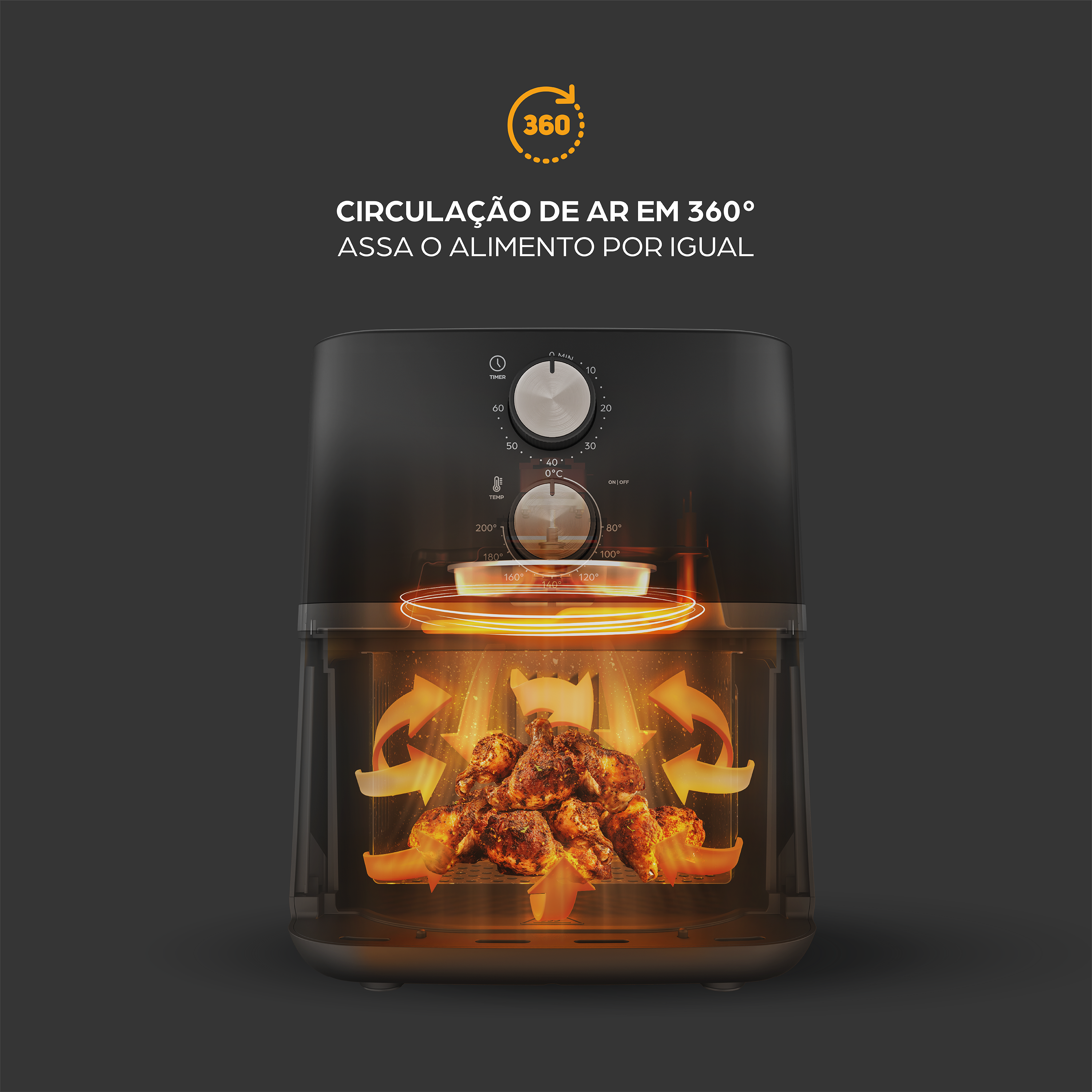 - A tecnologia de circulação de ar 360° assegura um cozimento uniforme, proporcionando alimentos crocantes por fora e macios por dentro.