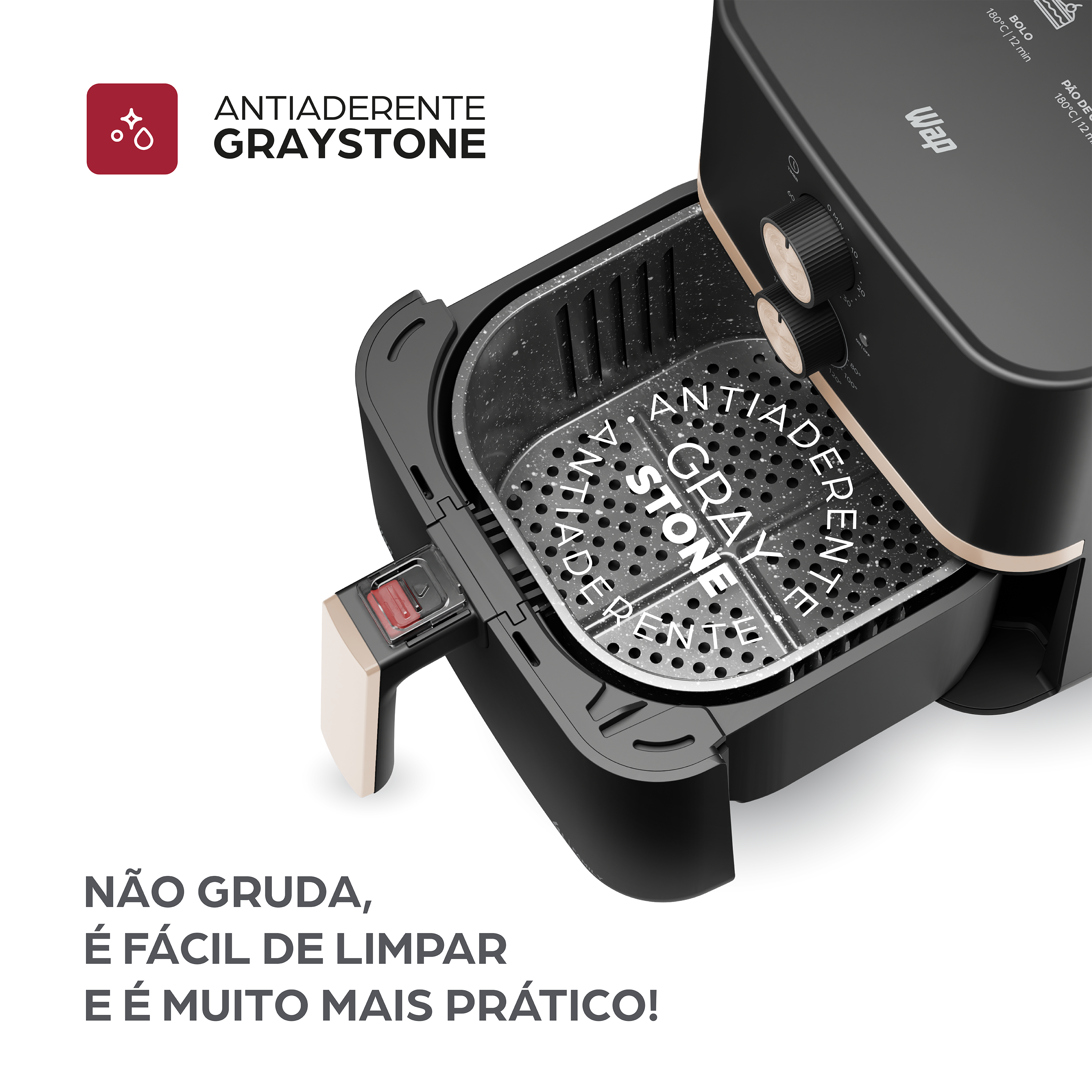 - A dupla camada antiaderente marmorizada Gray Stone confere charme à fritadeira, além de aumentar a durabilidade do cesto, evitando que os alimentos grudem.