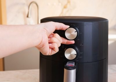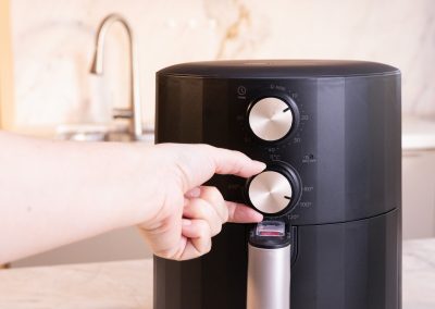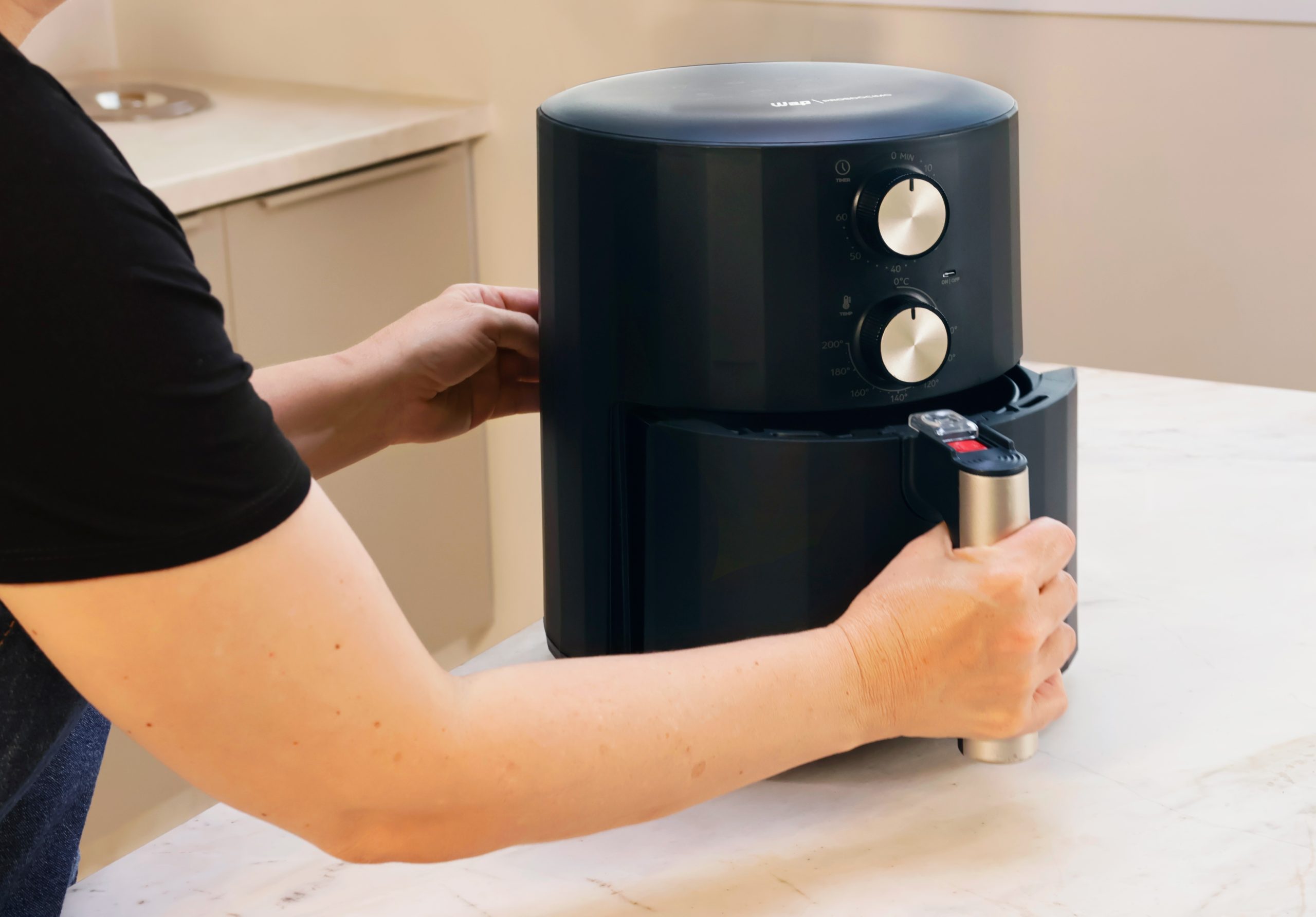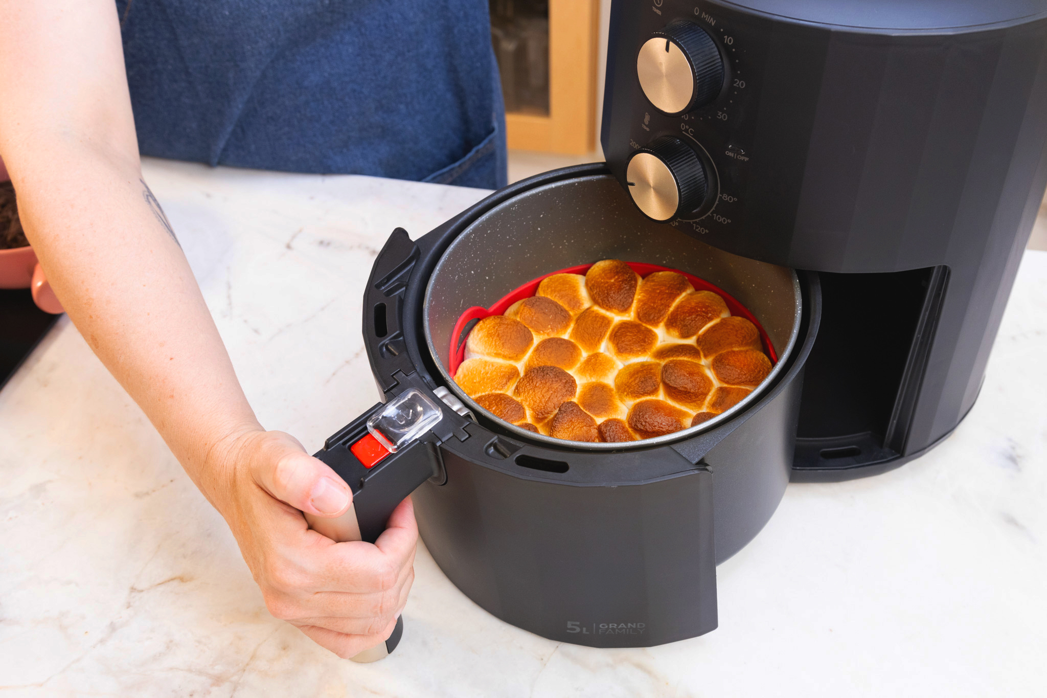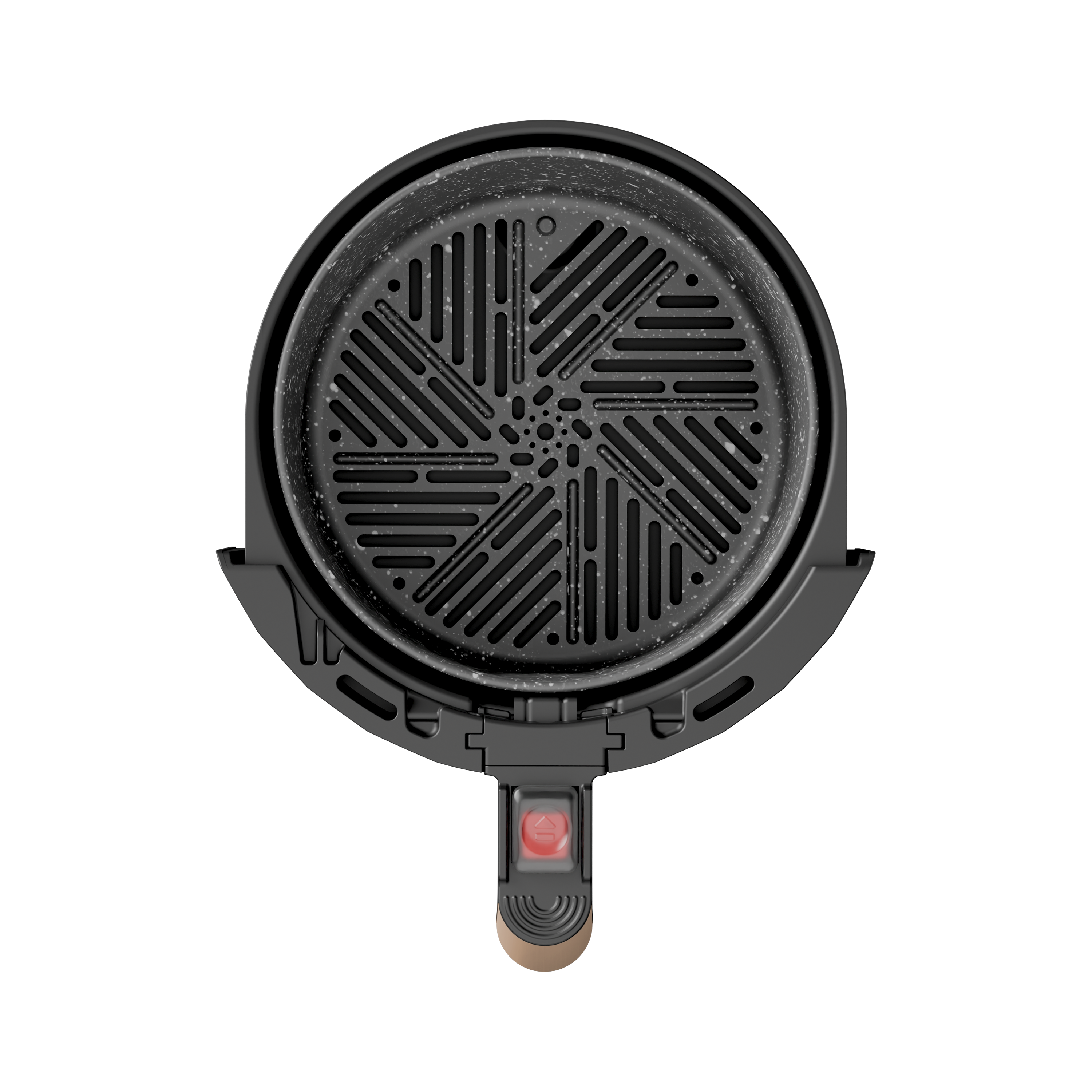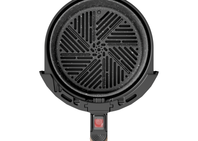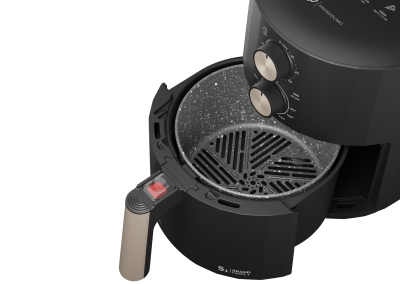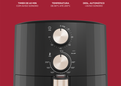 - A limpeza é descomplicada! Para limpar completamente a air fryer elétrica Grand Family, basta mover a trava, pressionar o botão e retirar o cesto antiaderente.