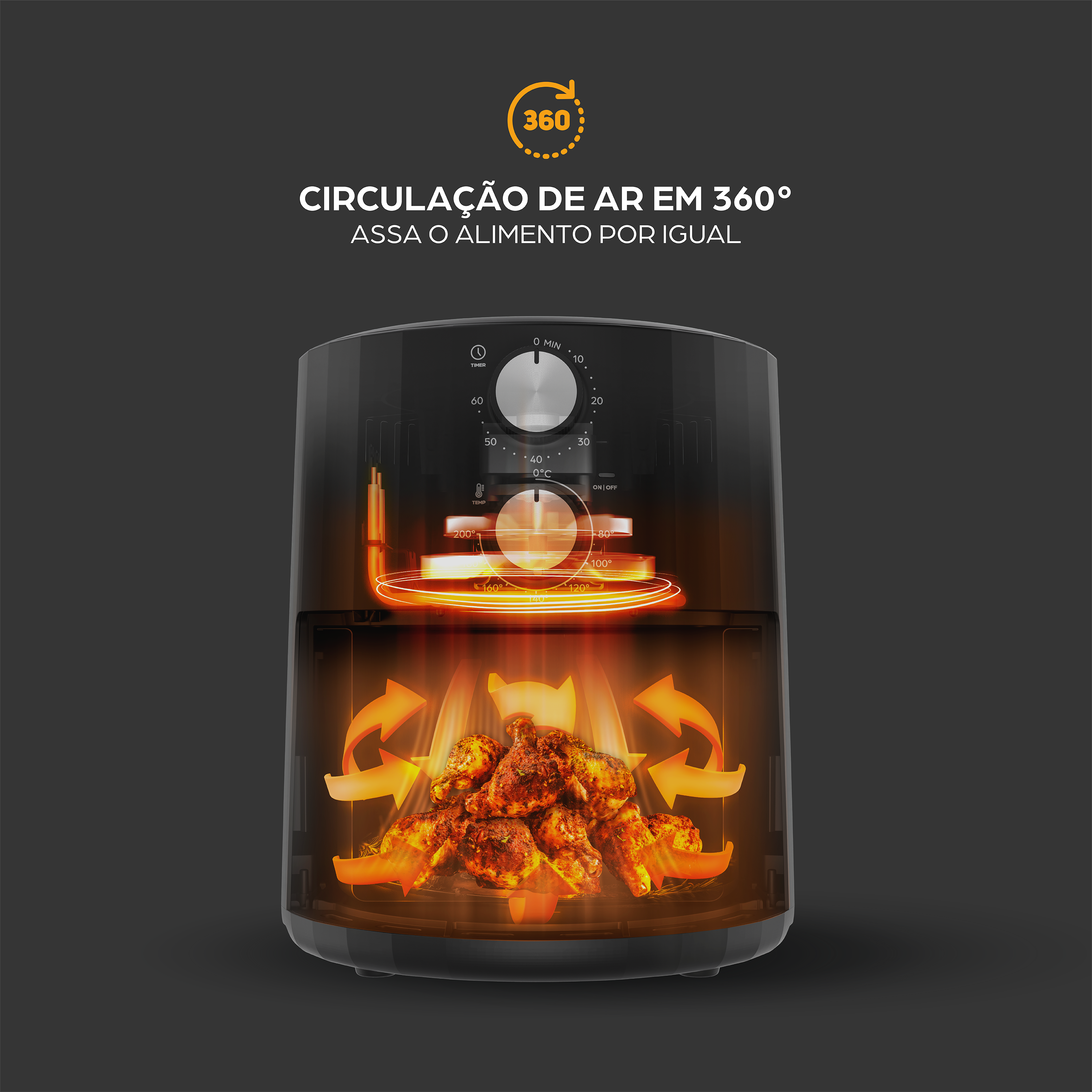 - A circulação de ar em 360° garante que os alimentos sejam cozidos de maneira uniforme, reduzindo o excesso de óleo para proporcionar pratos mais saudáveis.