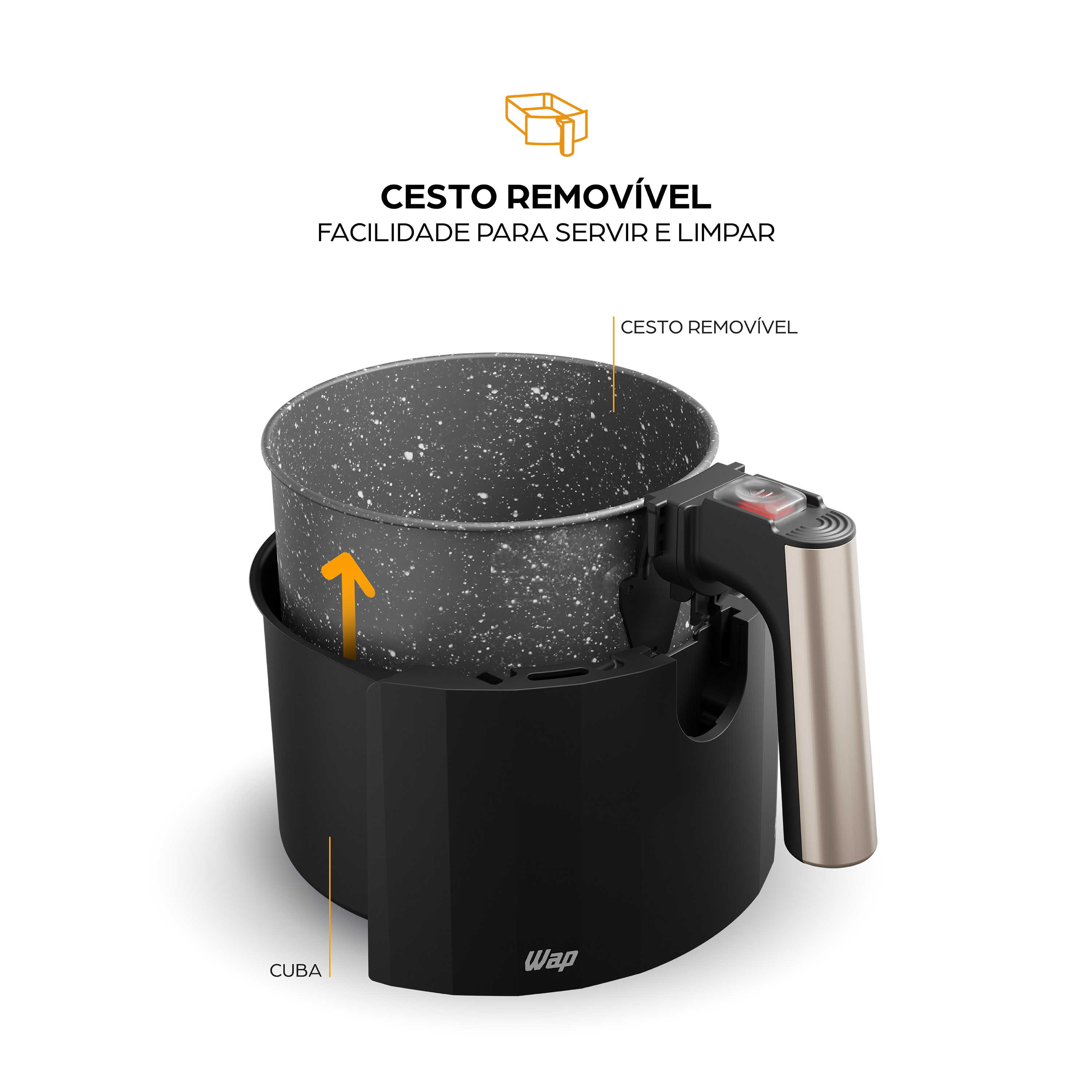 - O cesto interno removível possui dupla camada antiaderente Gray Stone. Essa tecnologia não apenas torna o recipiente mais resistente, mas também facilita a limpeza ao evitar que os ingredientes grudem.