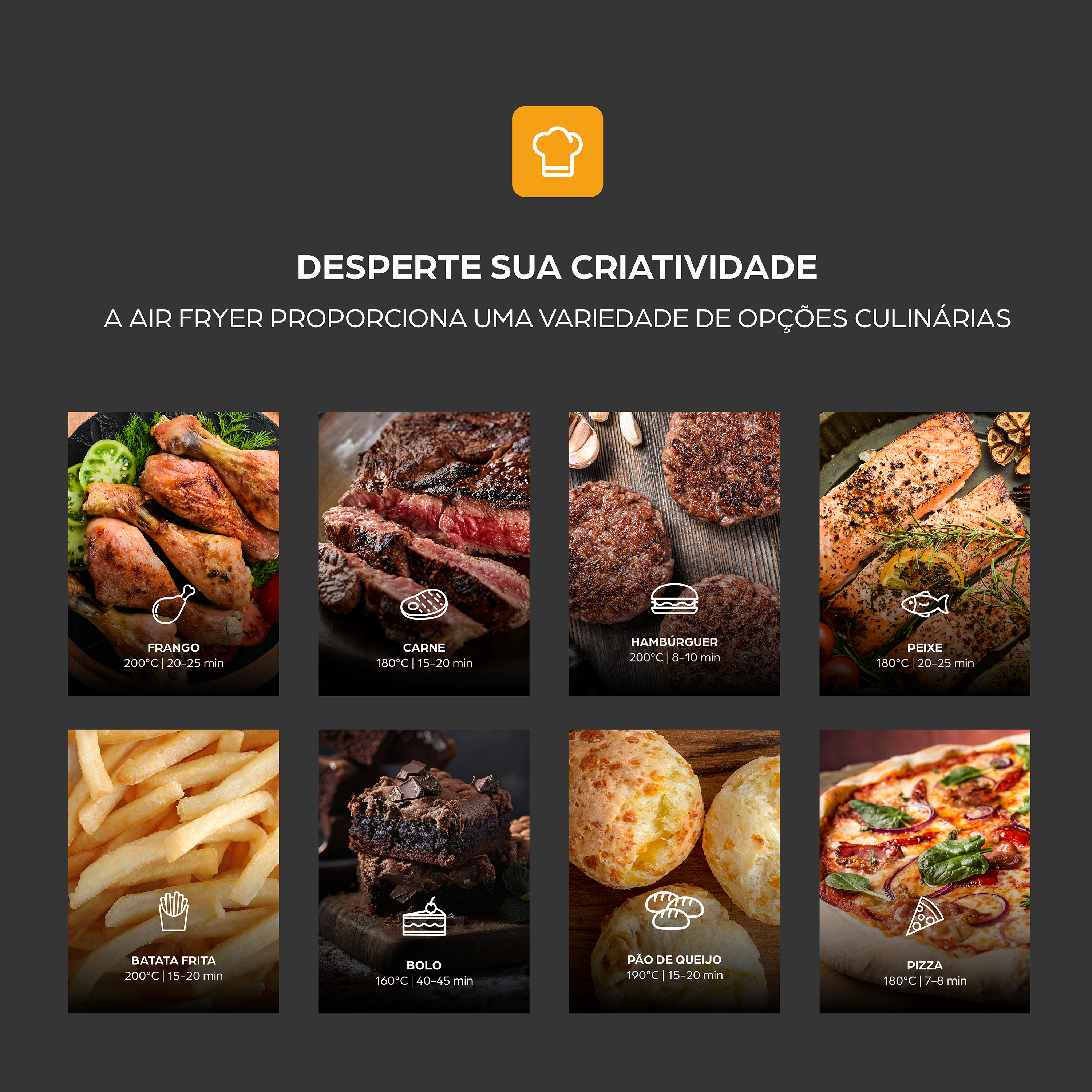 Tipos de alimentos que comporta: Prepara petiscos, massas, carnes, pastéis, pão de queijo, churros, peixes, vegetais entre outros
