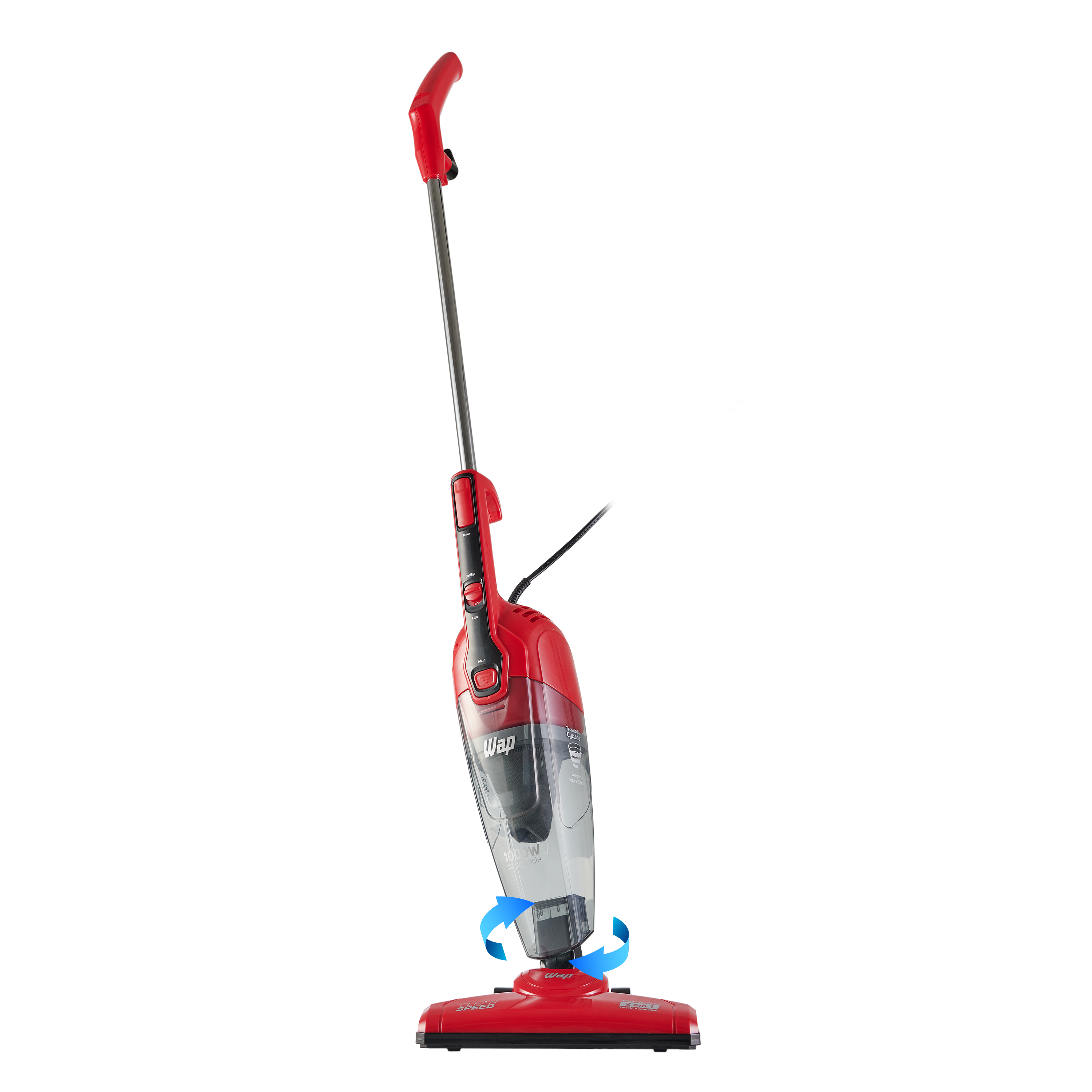 O aspirador de pó vertical WAP Clean Speed vem equipado com o exclusivo sistema 360º que aumenta os ângulos de aspiração e facilita a limpeza em locais de difícil acesso, como embaixo de camas, armários ou cantos de sofás. Além disso, ele pode ser utilizado com o bico múltiplo, para pisos e carpetes, ou com o bico canto. Por ser compacto e desmontável, o aspirador de pó vertical WAP Clean Speed é também muito prático para guardar.
