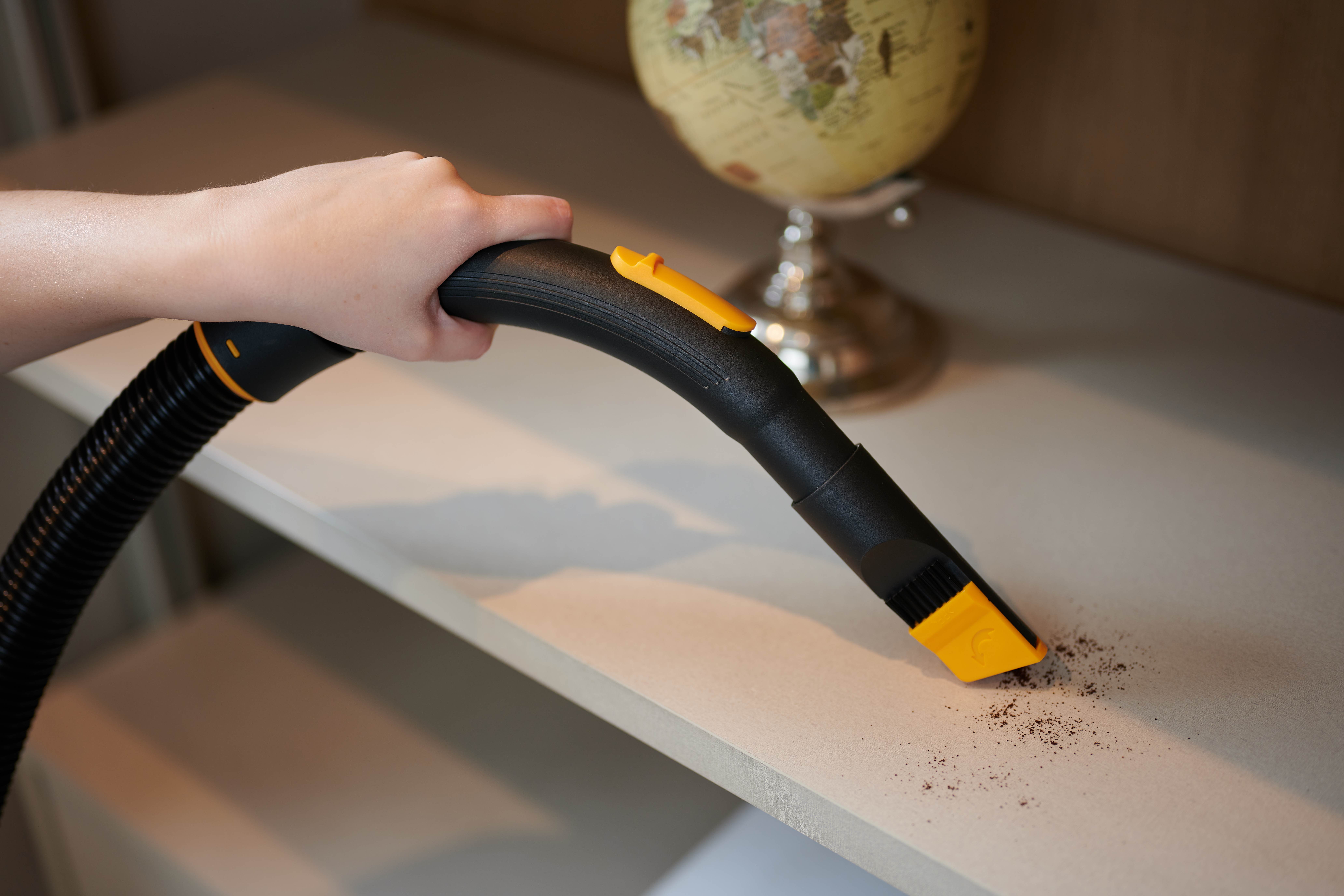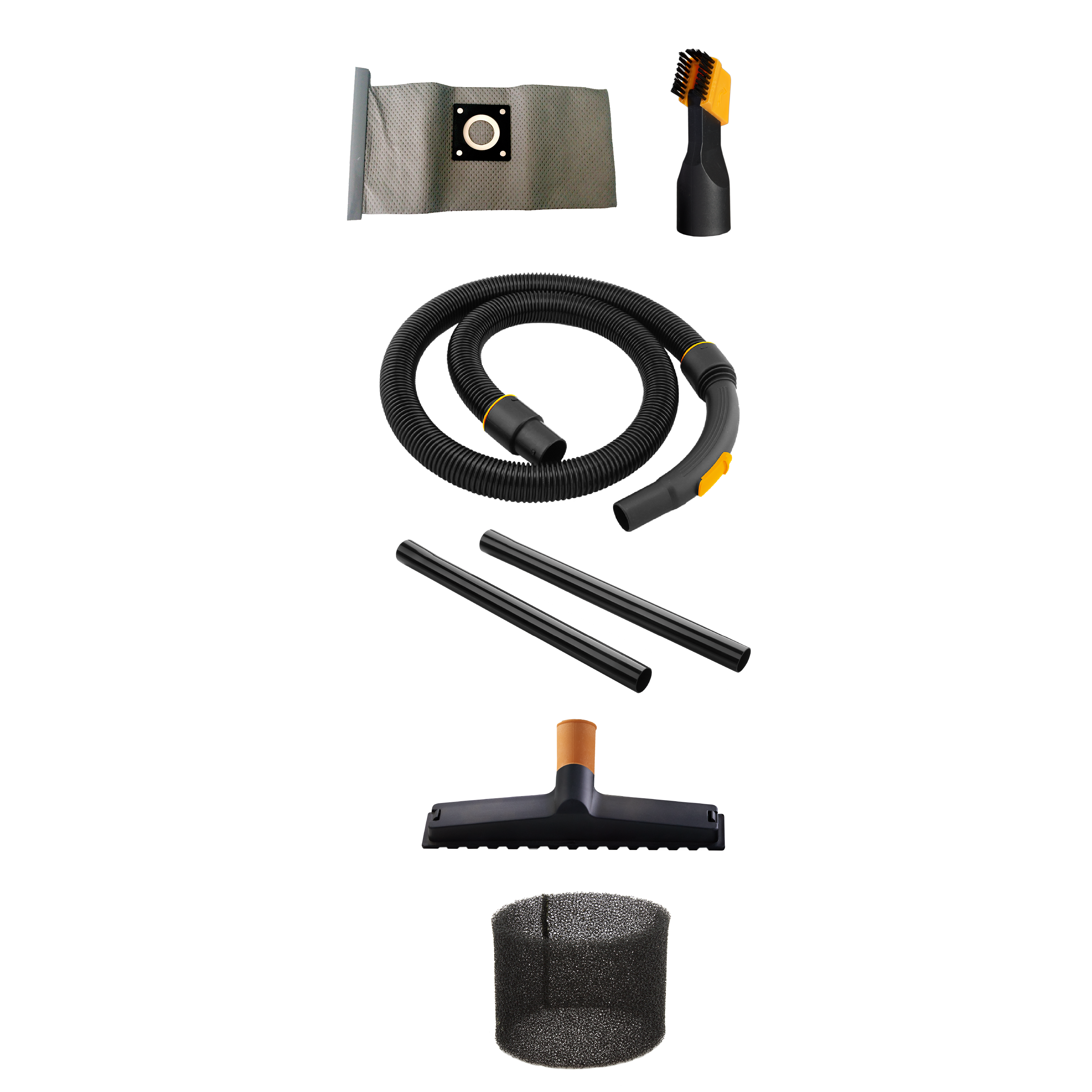 | 1 Bico canto e escova. 1 Mangueira de 1,5 m. 2 Extensores de plástico. 1 Bico múltiplo para carpetes, tapete e piso frio. 1 Saco para pó de pano lavável. 1 Filtro de espuma lavável. |