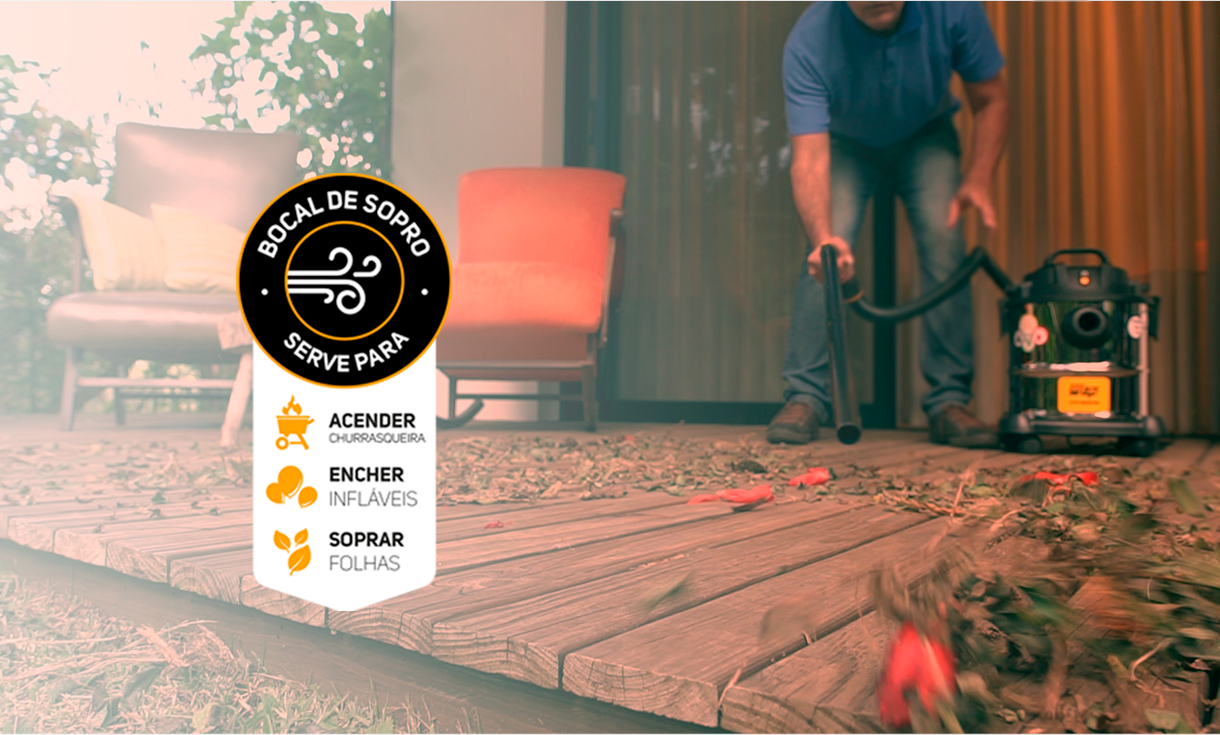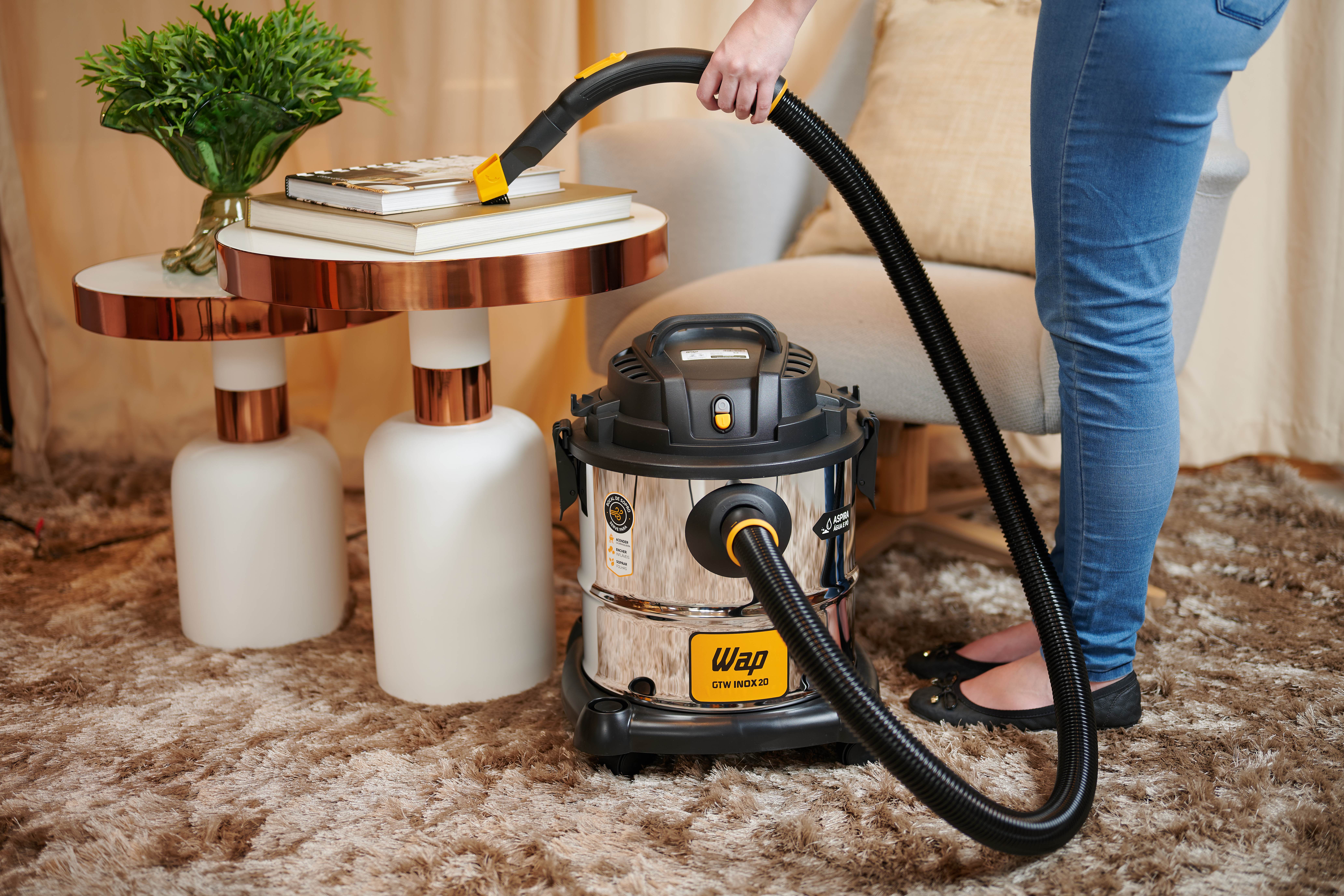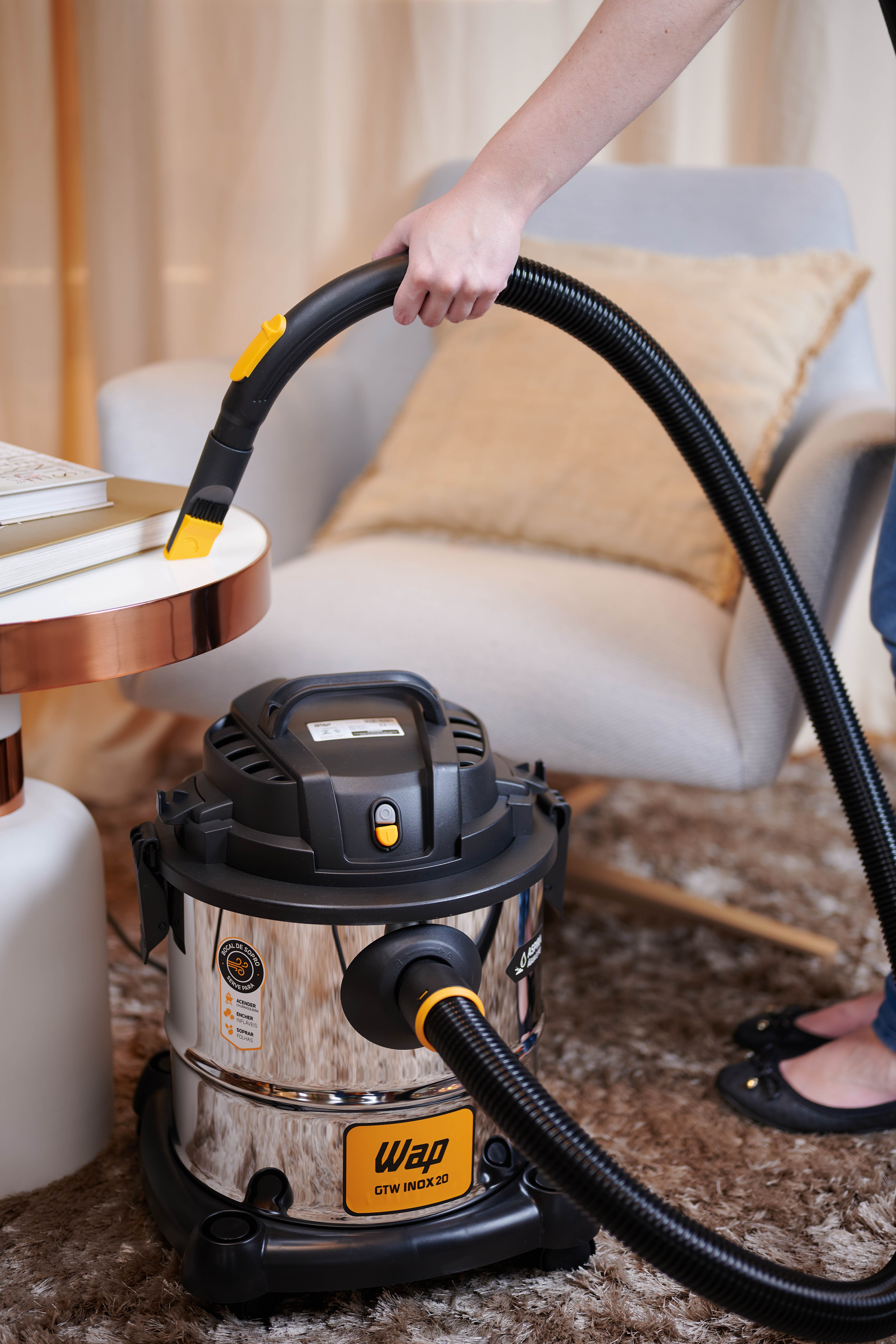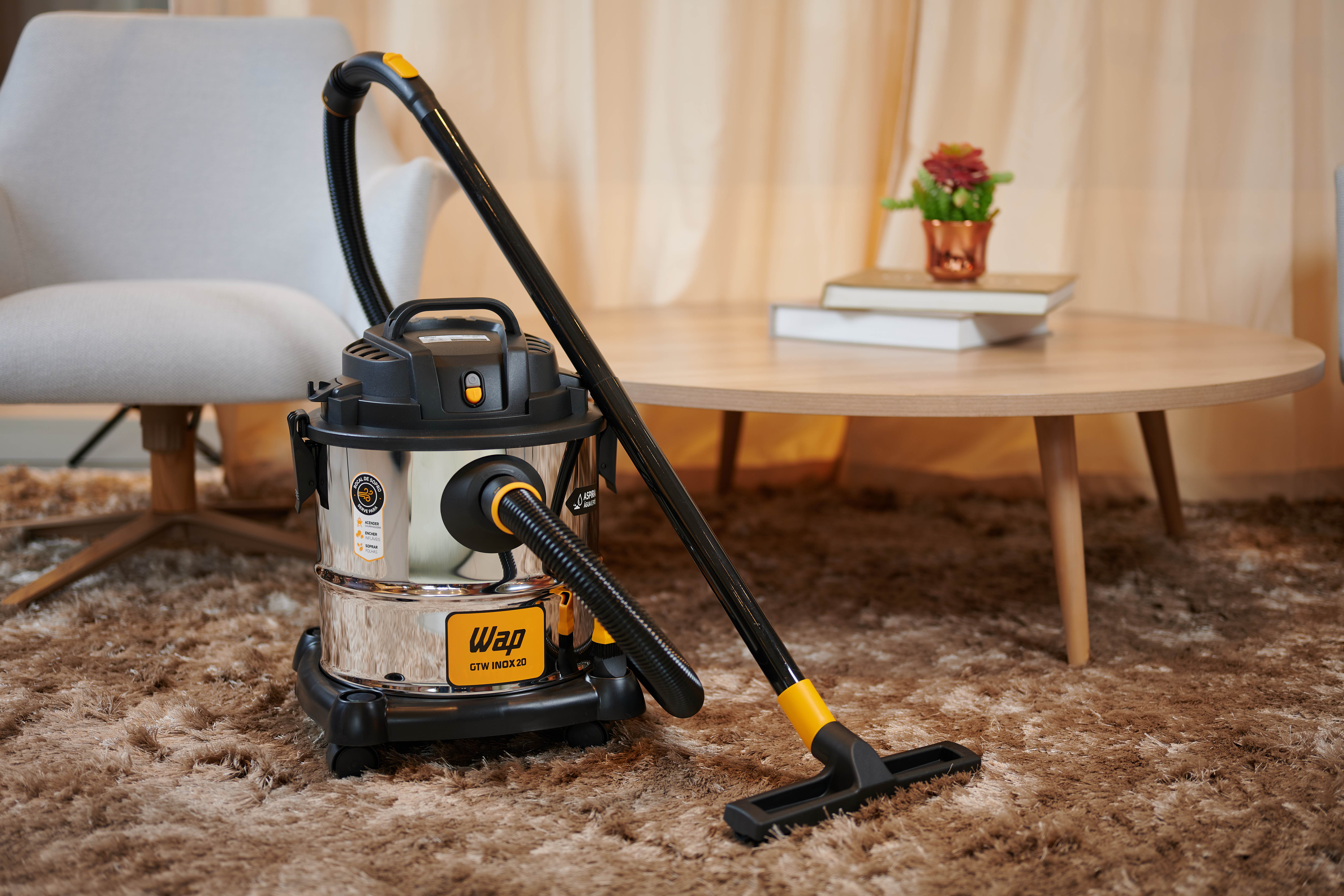 Para realizar uma limpeza rápida e eficiente, o WAP GTW Inox 20 possui bico múltiplo com acessório para carpetes, piso frio e rodo, além de bico canto e escova. O aspirador de pó e água WAP GTW Inox 20 possui bocal de sopro que, além de auxiliar na limpeza de lugares inacessíveis, ainda serve para encher infláveis, acender churrasqueiras ou soprar folhas. Muito ágil e fácil de usar, o aspirador de pó e água WAP GTW Inox 20 permite trabalhar de forma mais rápida e organizada, pois conta com porta-acessórios, alça e rodas para transporte que aumentam a sua mobilidade na hora da faxina. Robusto e eficiente, é um equipamento que pode ser usado com intensidade para dar conta da limpeza diária.
