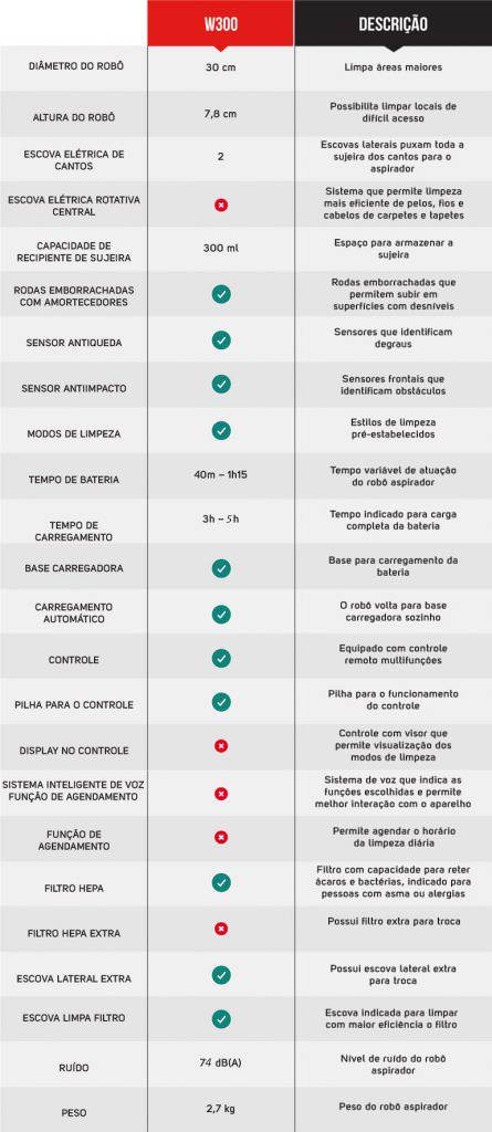 | CONTEÚDO DA EMBALAGEM: | Robô Aspirador W300 + Acessórios + Manual de Instruções. |
