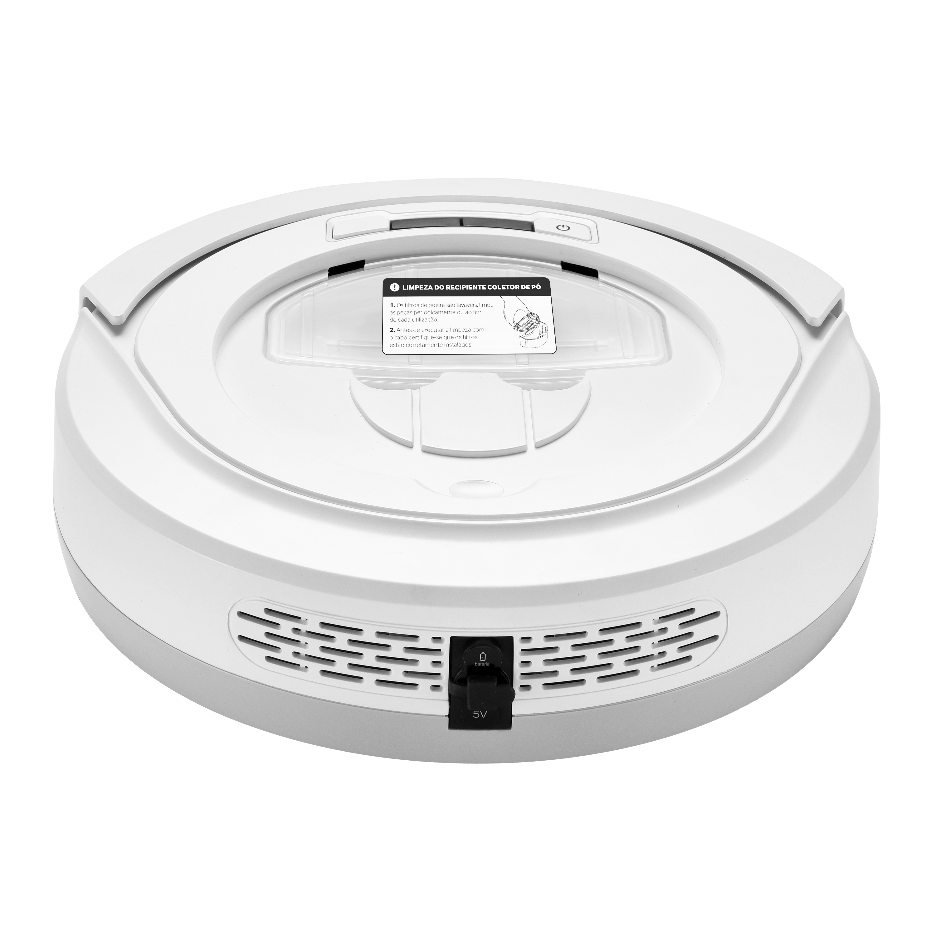 2 Rodas maiores emborrachadas. 2 Roda menores fixas Sensores eletrônicos de antiqueda. Sensores de impacto. Recipiente coletor de pó de 250 ml. 3 modos de limpeza: - Limpeza aleatória - Limpeza de cantos - Limpeza em espiral |