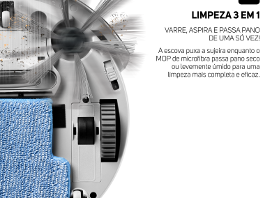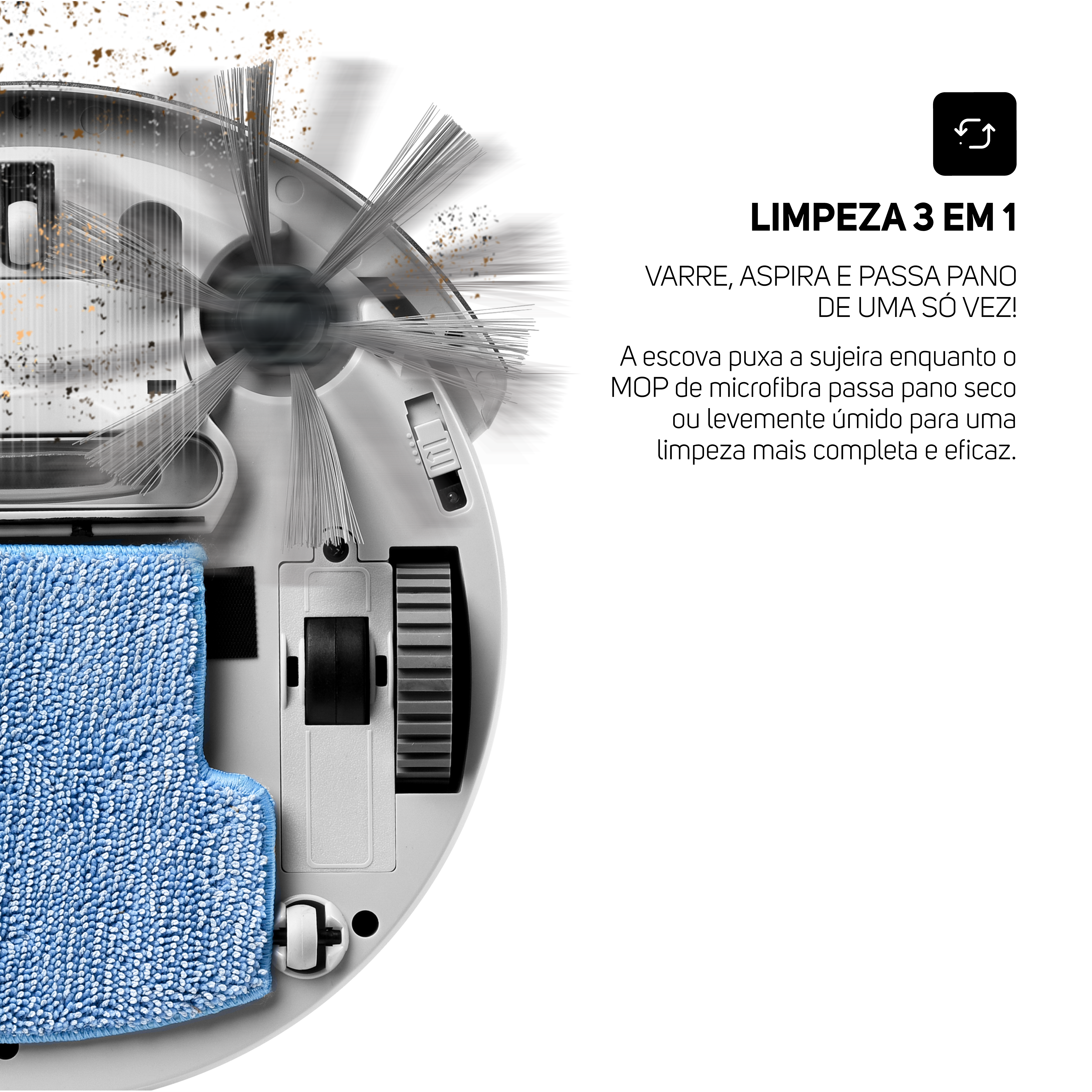 - O sistema de limpeza 3 em 1 varre, aspira e passa pano simultaneamente, simplificando a limpeza.