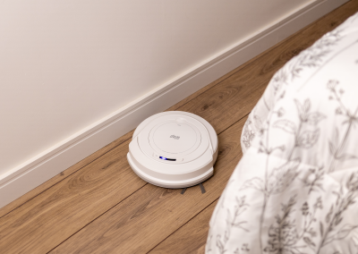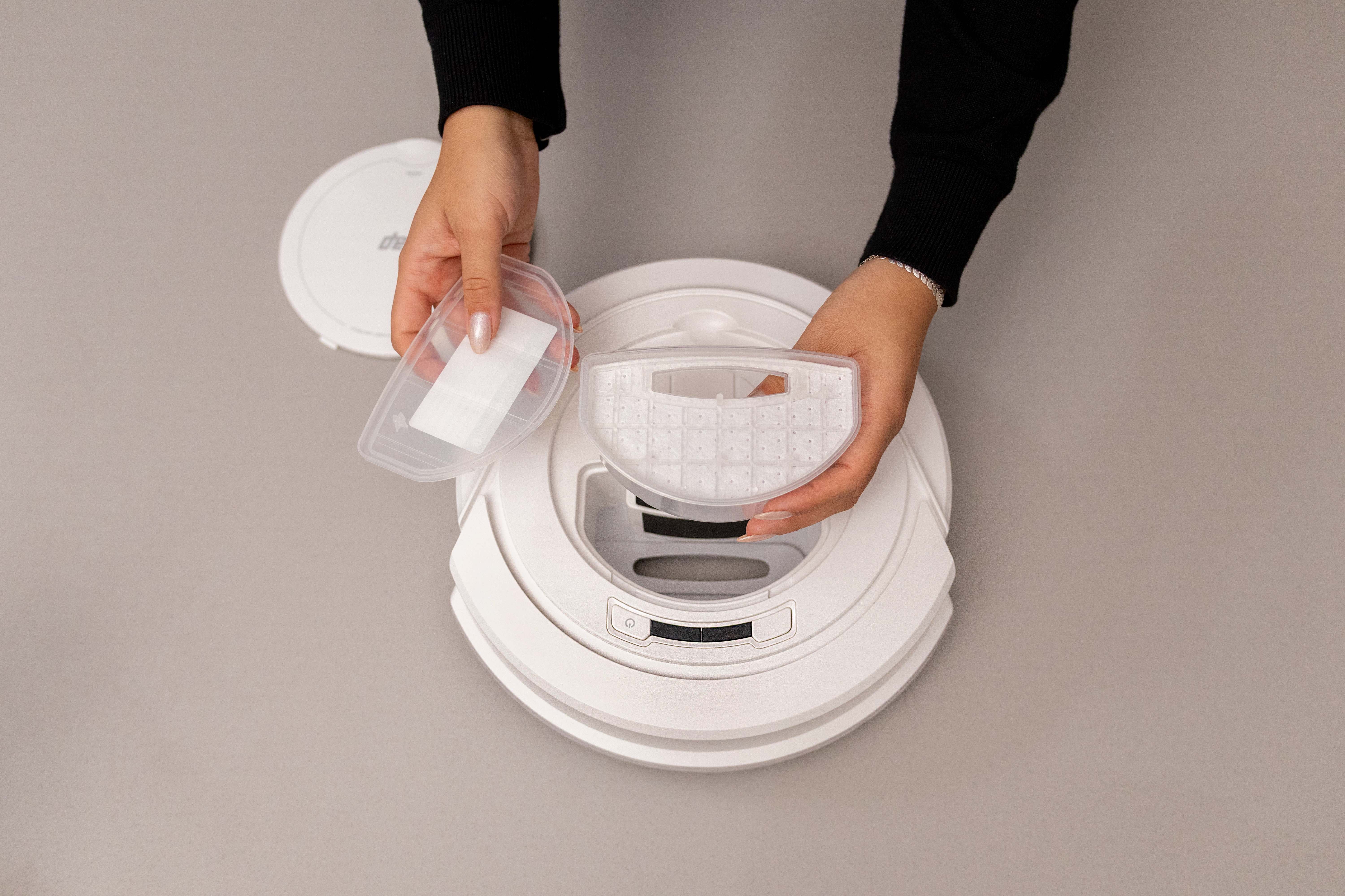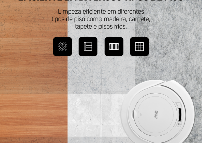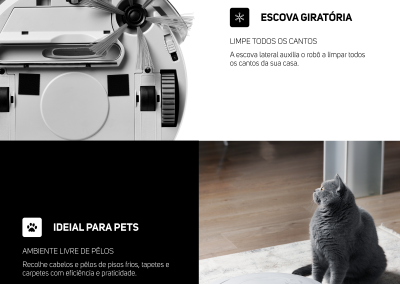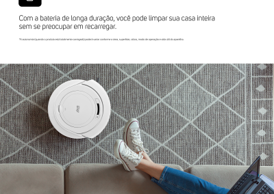 Com capacidade de 250mL para aspirar todos os cômodos, o robô, com apenas 8 cm de altura, desliza facilmente embaixo de móveis, para alcançar sujeiras invisíveis graças ao seu design slim. O filtro HEPA lavável retém as impurezas do ar, proporcionando saúde e bem-estar para sua rotina.