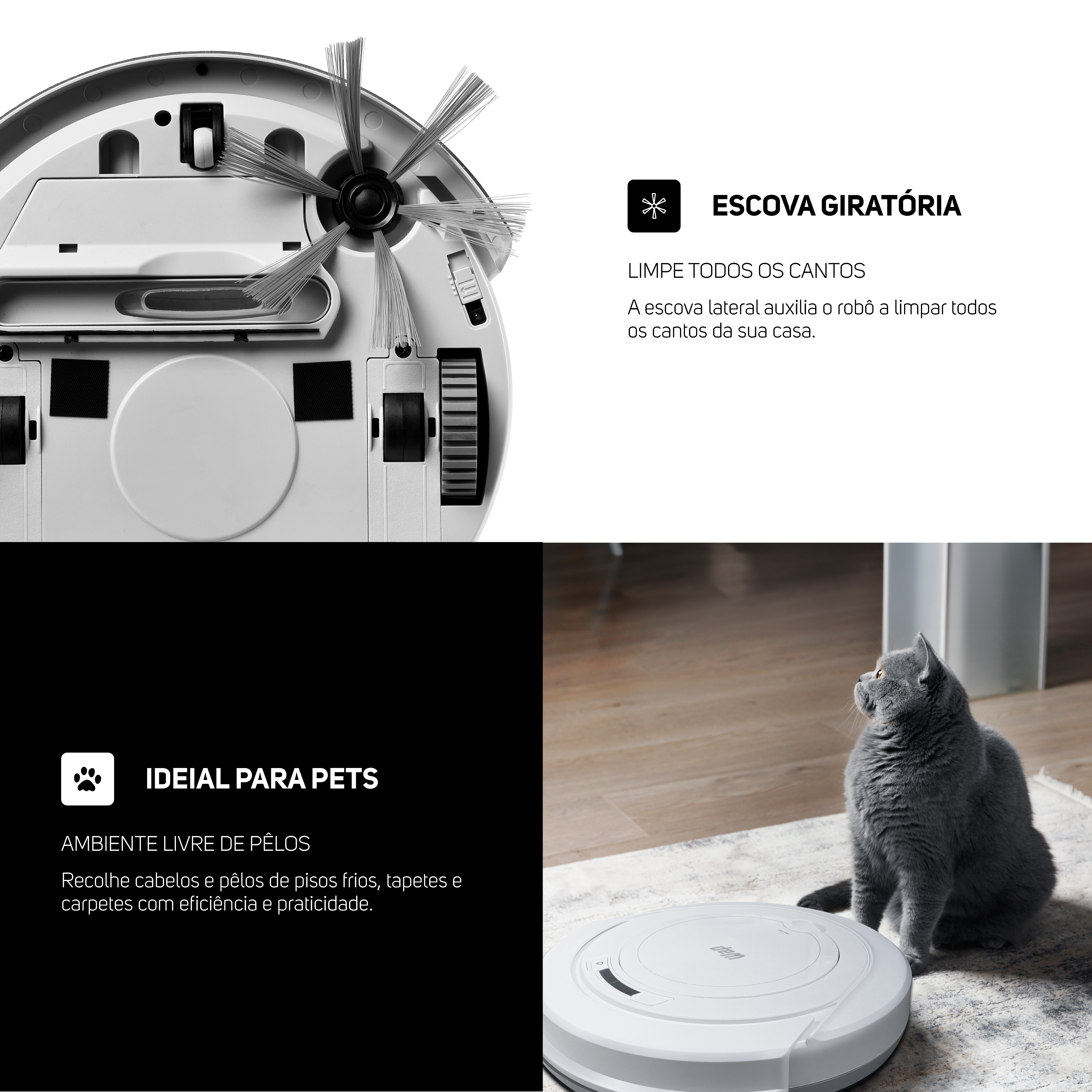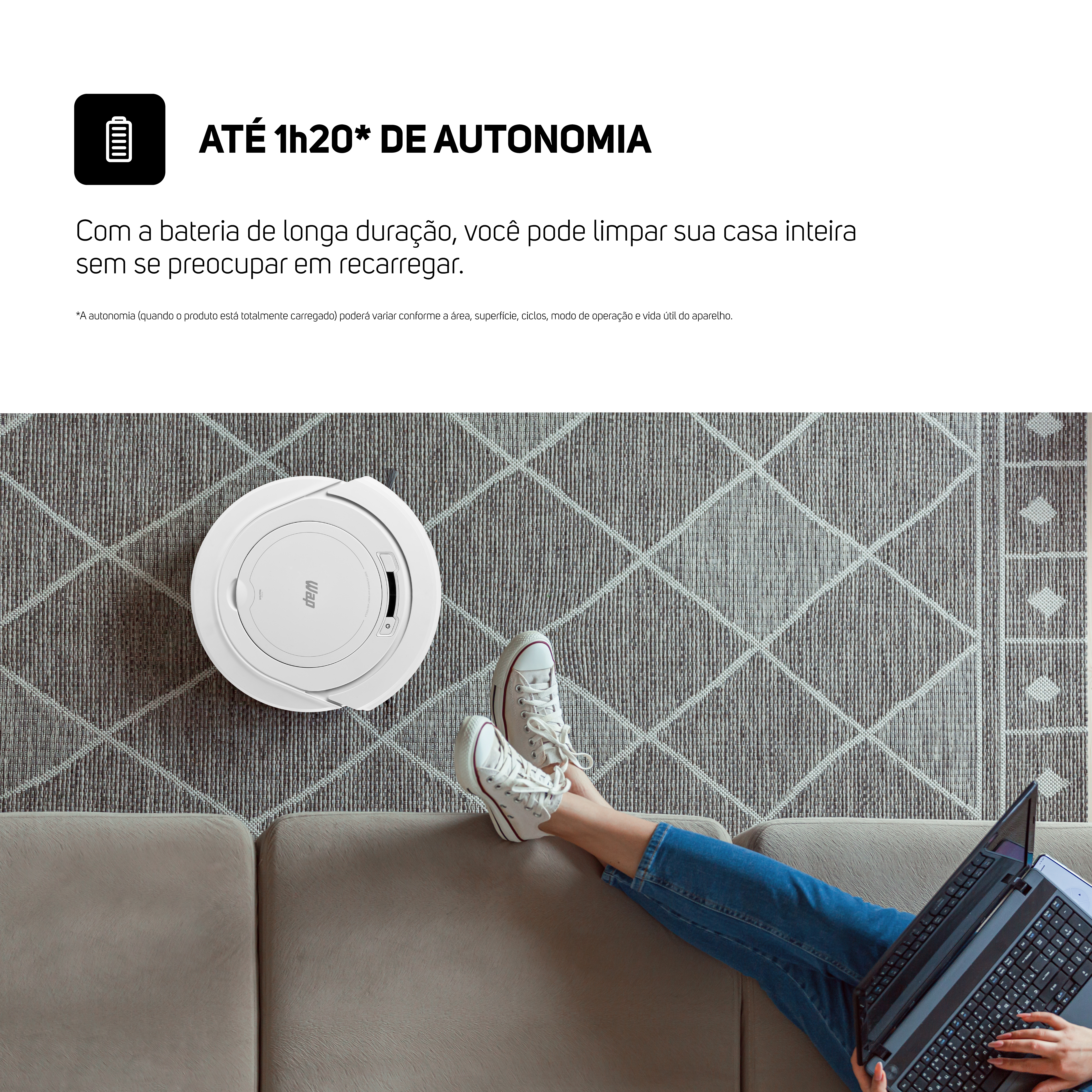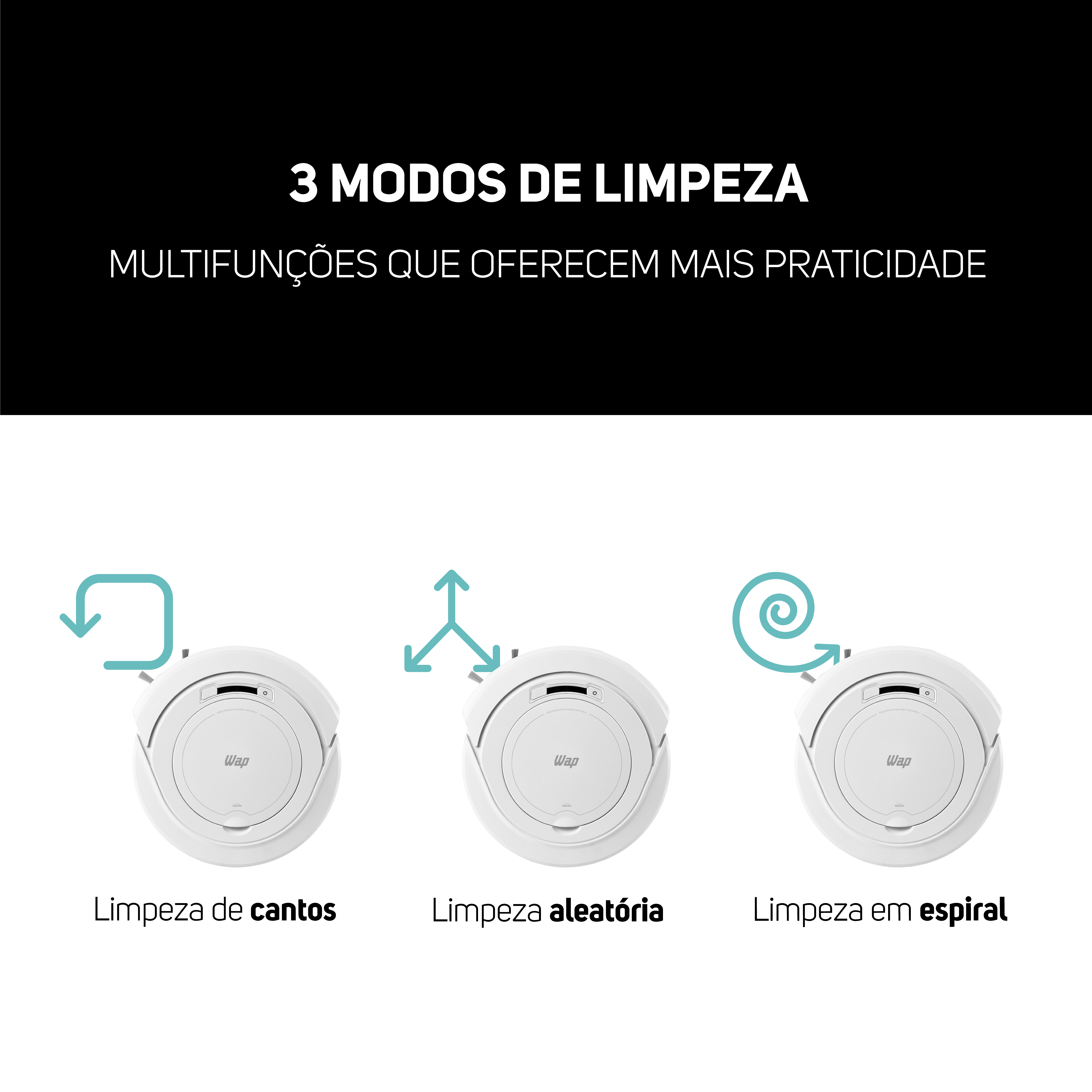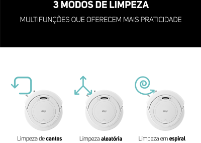 - Escolha entre os três modos de limpeza pré-programados (Cantos, Aleatória e Espiral) para garantir que seus cômodos estejam sempre limpos.