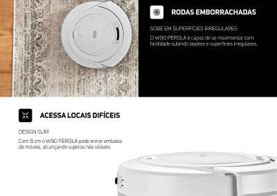 | CONTEÚDO DA EMBALAGEM: | Aspirador Robô W90 PÉROLA + Acessórios + Manual de Instruções. |