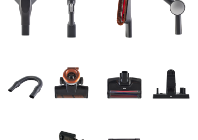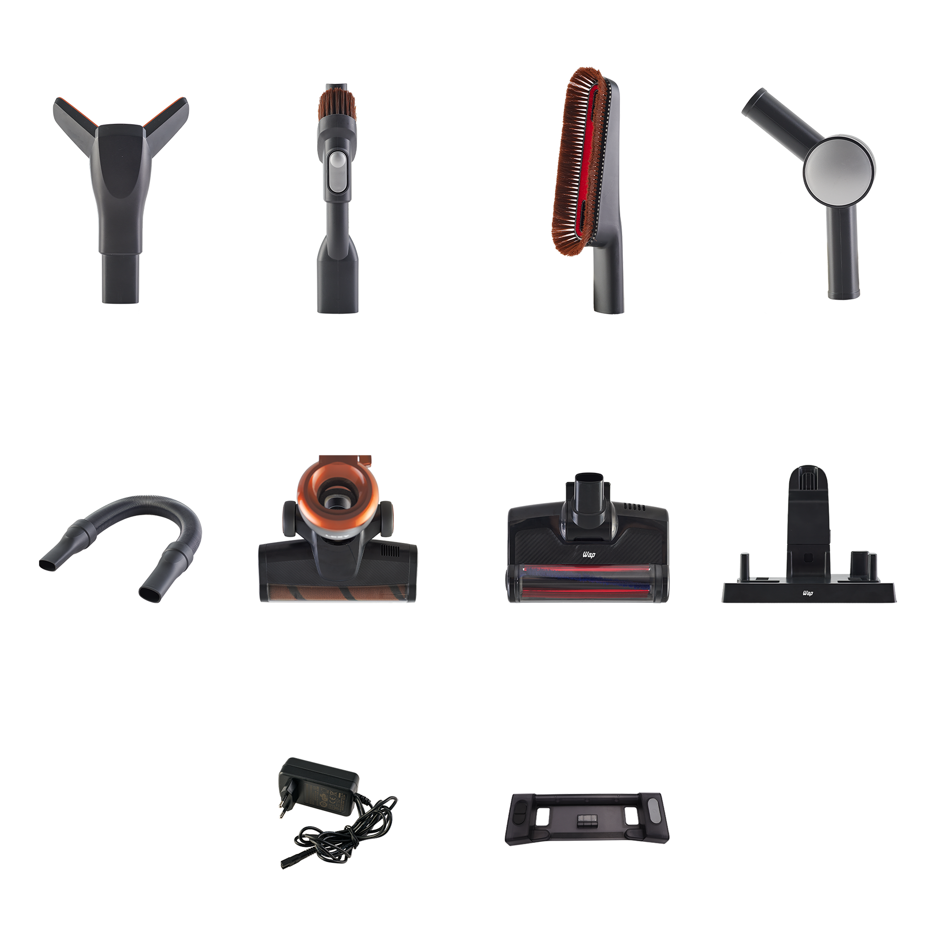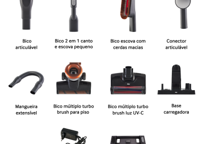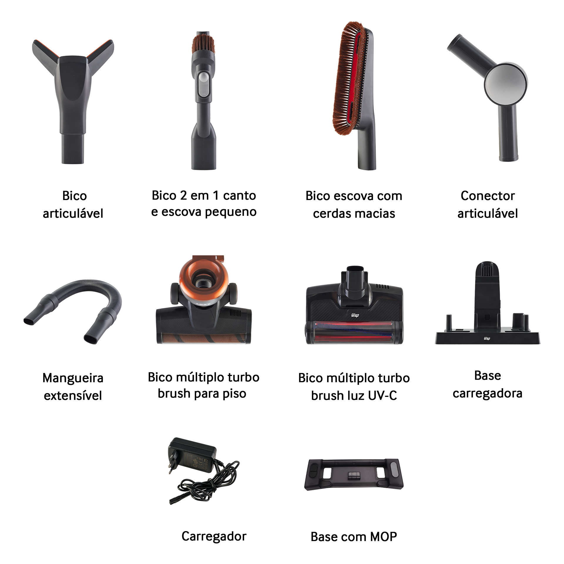 | 1 Alça Extensora Metálica; 1 Bico Articulável; 1 Bico 2 em 1 Canto e Escova Pequeno; 1 Bico Escova com Cerdas Macias; 1 Conector Articulável; 1 Mangueira Extensível; 1 Bico Múltiplo com Turbo Brush para Piso; 1 Bico Múltiplo com Turbo Brush e Luz UV; 1 Escova Rotativa; 1 Base com MOP. |
