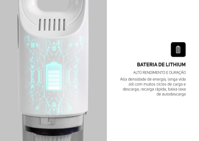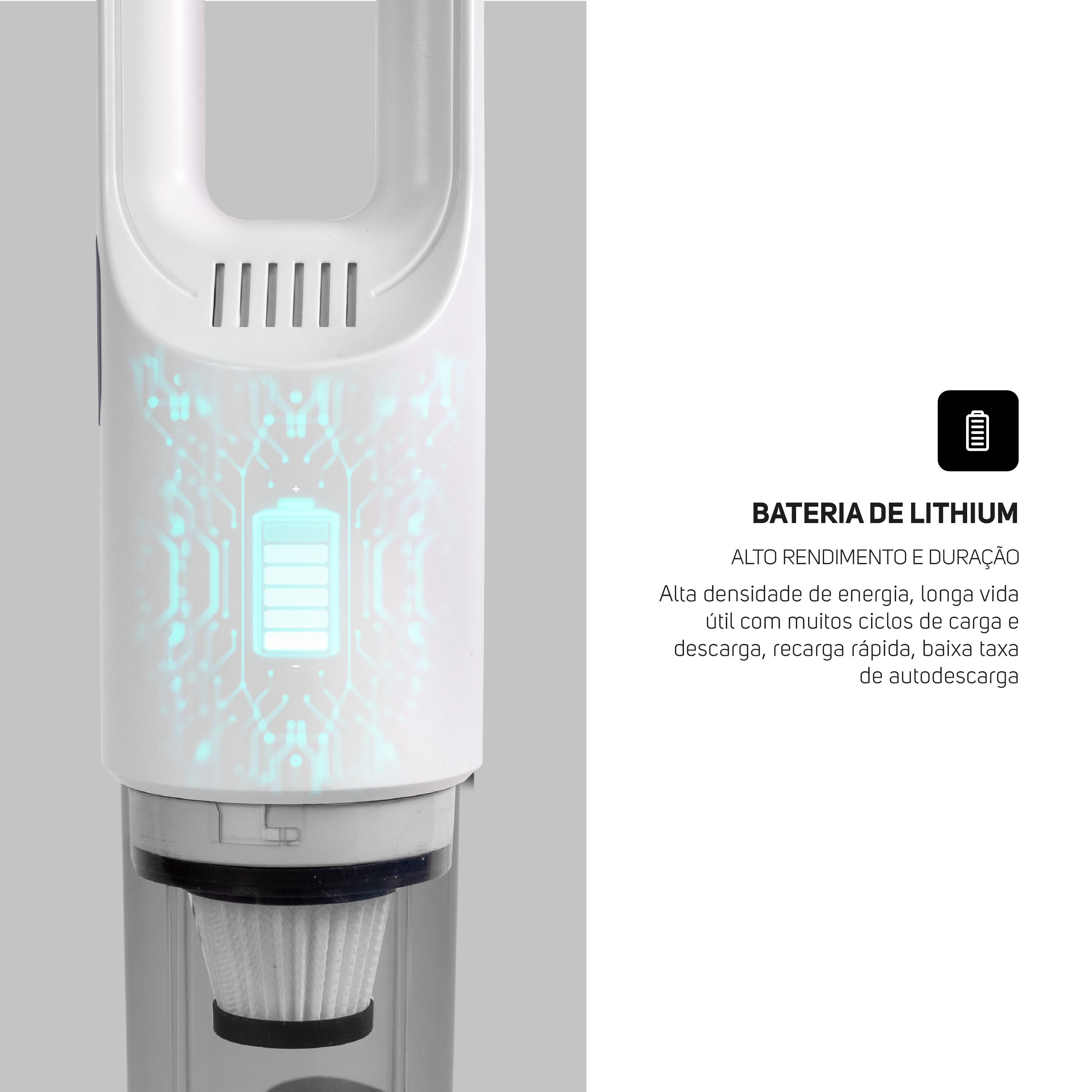 - A bateria de Lithium possui longa duração para as tarefas diárias e oferece alto desempenho para uma limpeza eficiente.