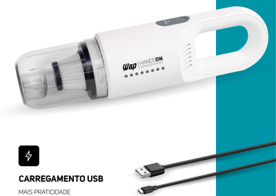 Além disso, o cabo carregador USB elimina qualquer preocupação com a recarga. Basta conectar e carregar, e o Aspirador sem fio WAP HANDSON estará pronto para agir sempre que você precisar.