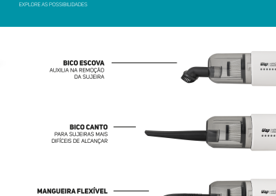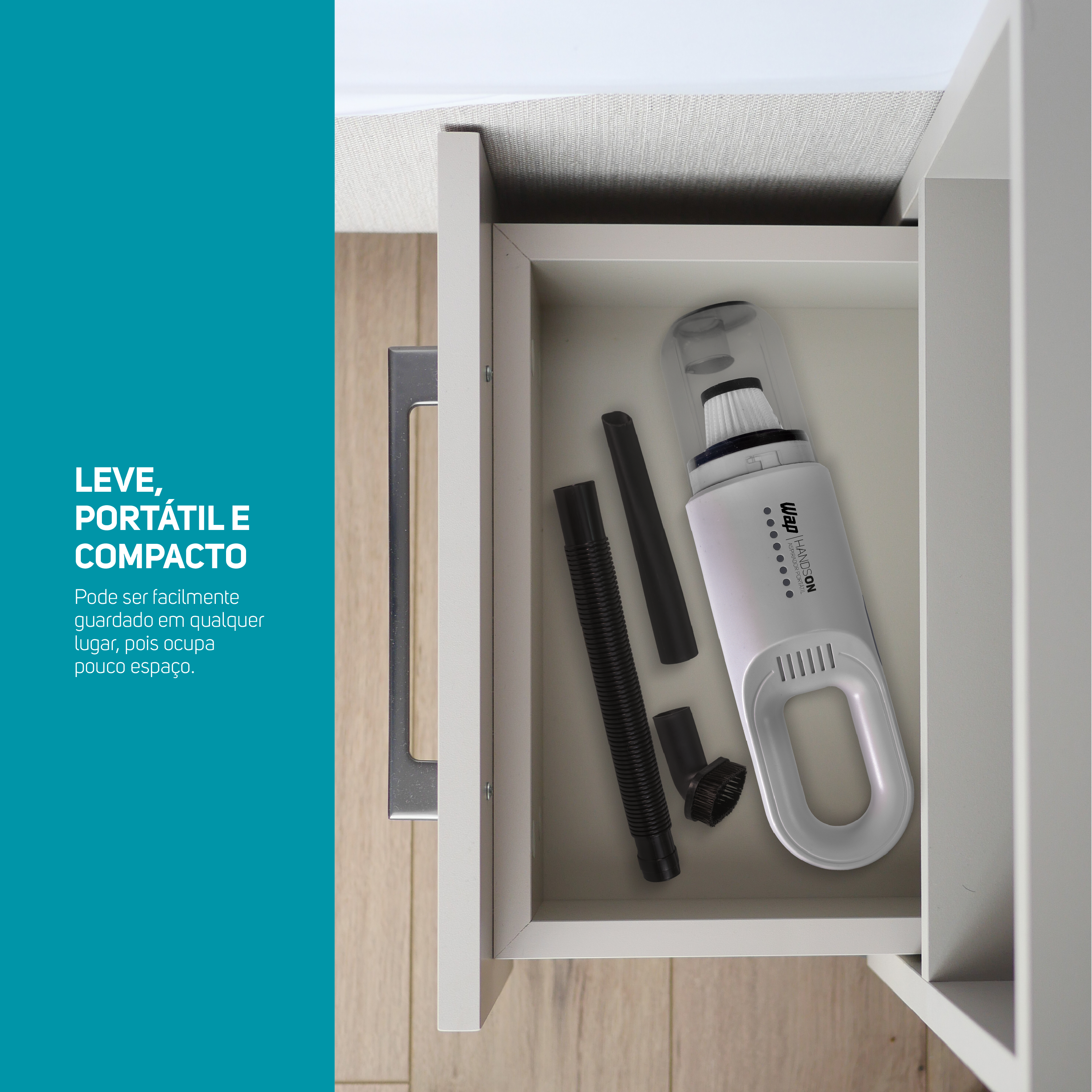 - Sem fio, o aspirador portátil oferece maior mobilidade nas tarefas de limpeza dentro e fora de casa para alcançar espaços de difícil acesso.