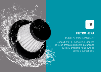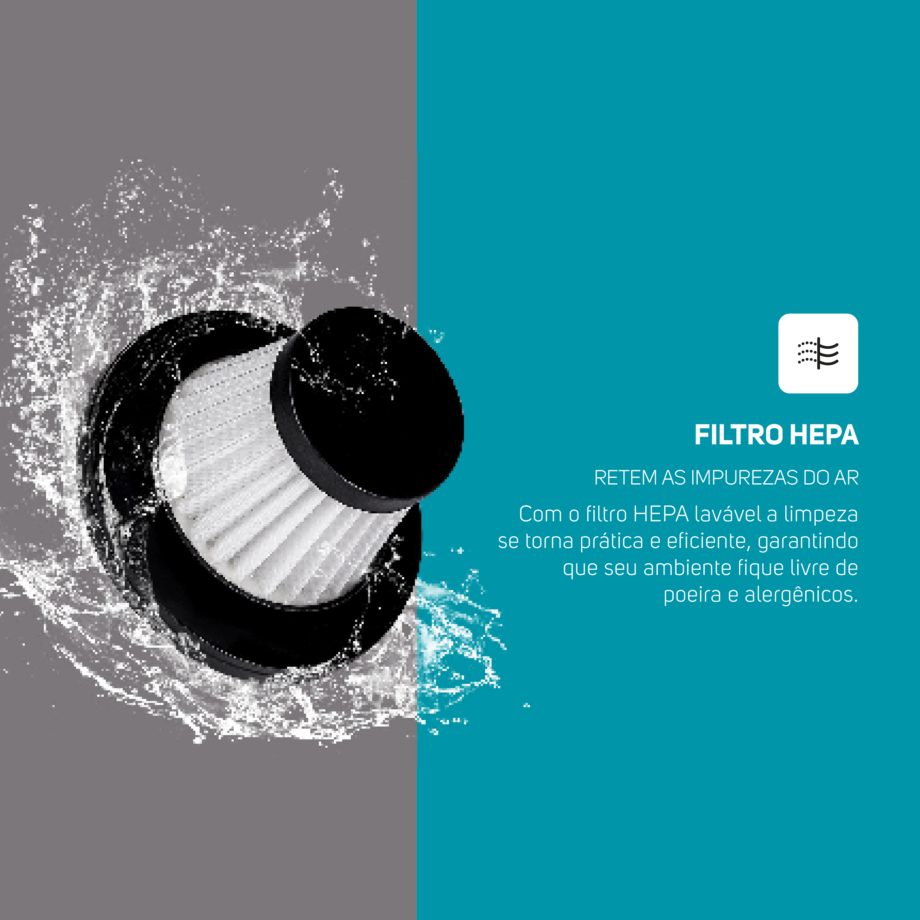 Equipado com o filtro HEPA que garante a melhor qualidade do ar, reduzindo a presença de impurezas e partículas invisíveis, como poeira e ácaros. Com ele, você não apenas limpa o ambiente, mas também cuida da sua saúde e bem-estar.