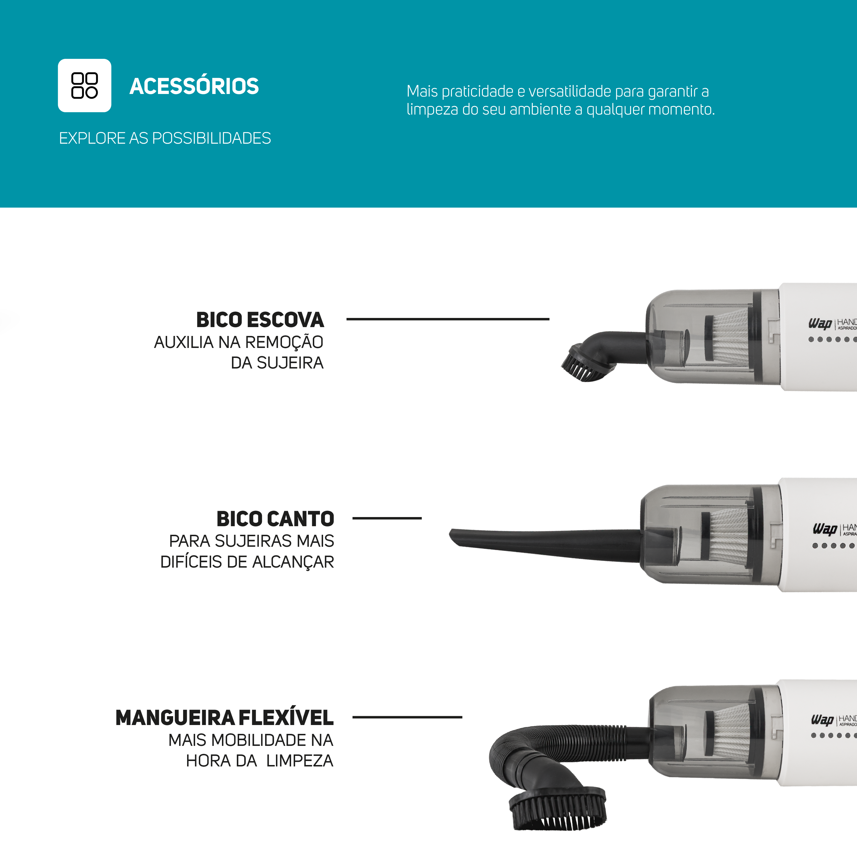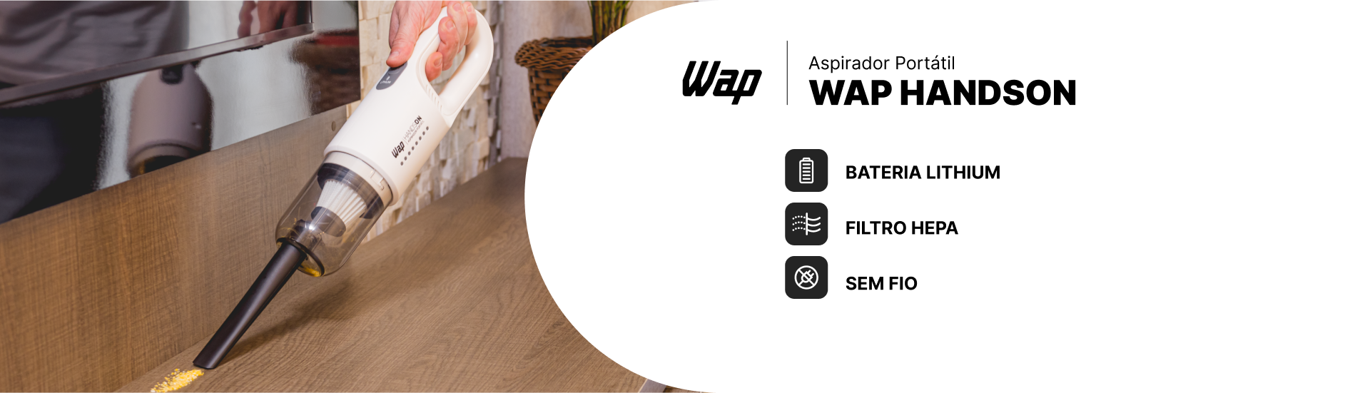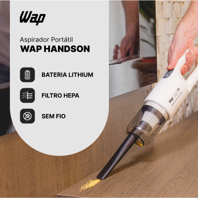 O Aspirador Portátil WAP Handson é a combinação perfeita de praticidade e autonomia que você precisa. Projetado para se adaptar perfeitamente ao seu estilo de vida, o WAP Handson é a solução para as suas necessidades de limpeza.