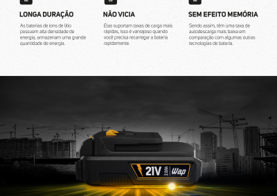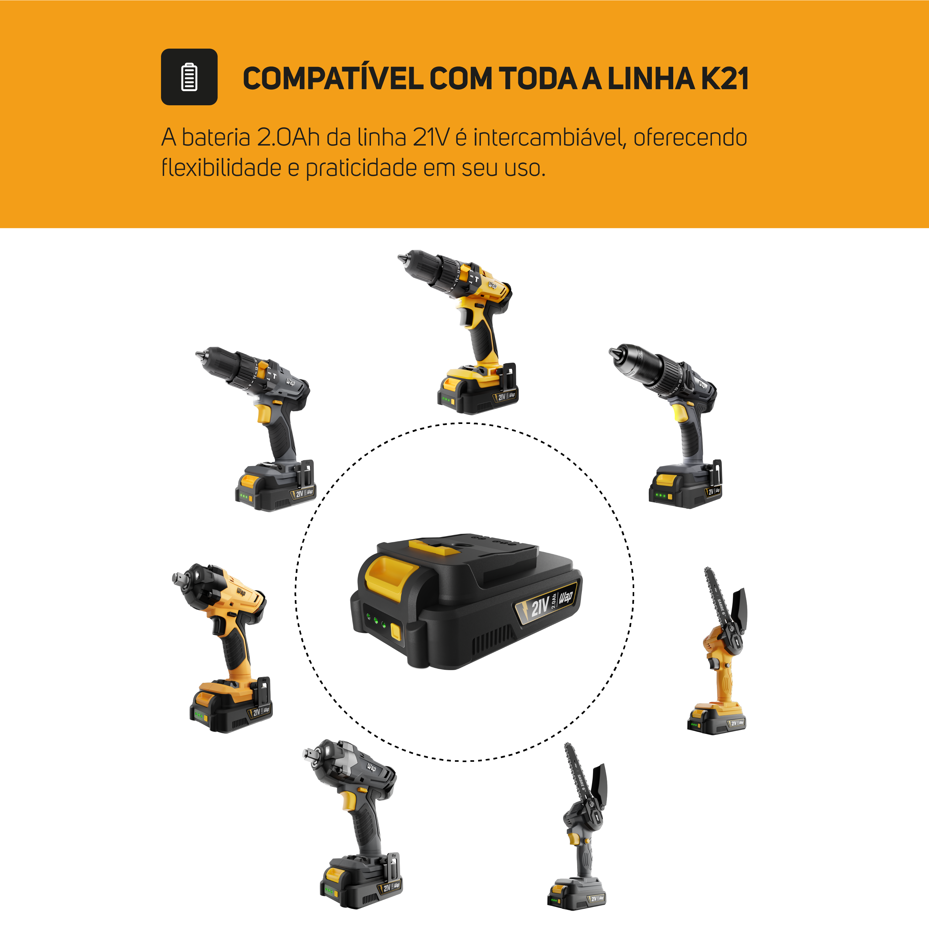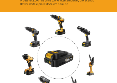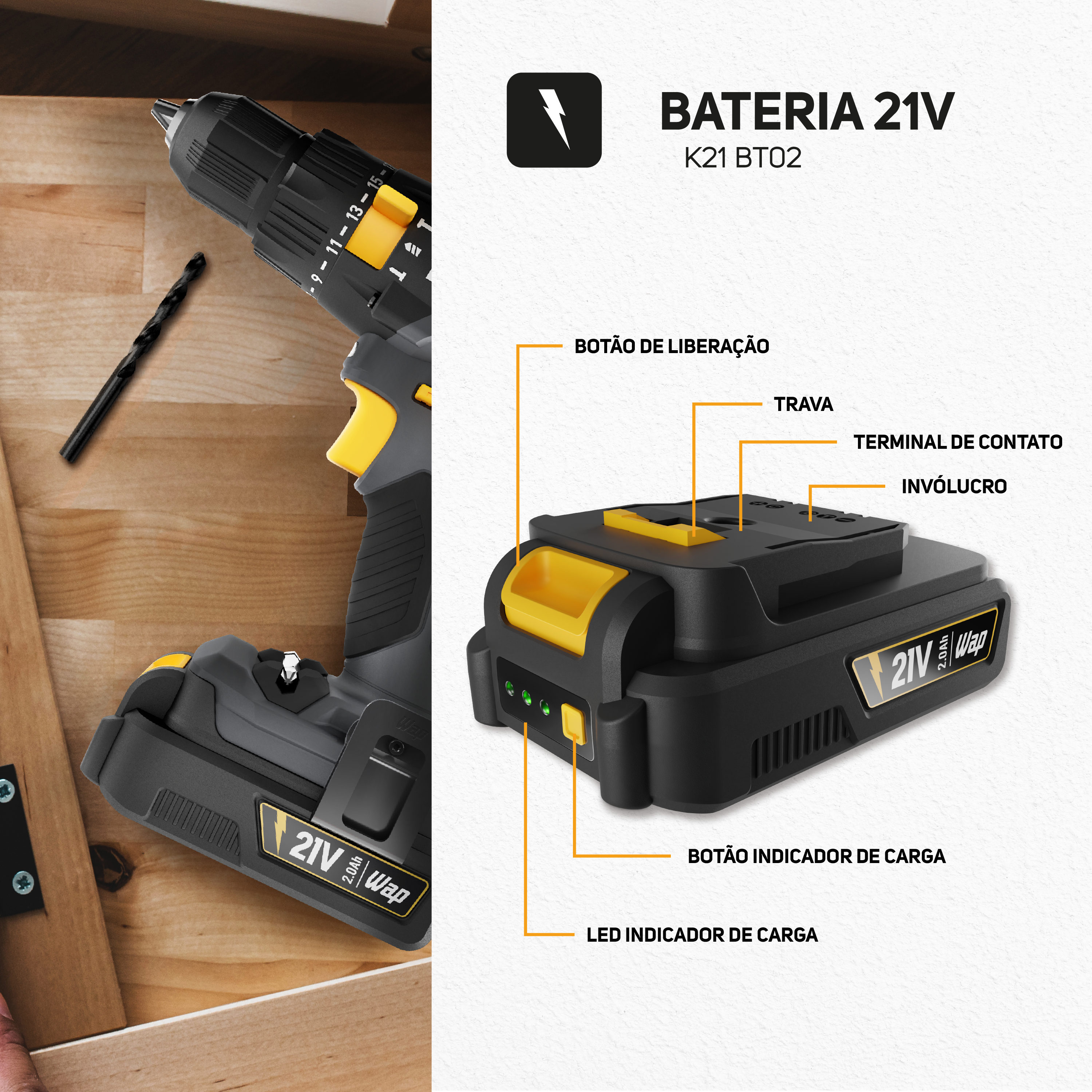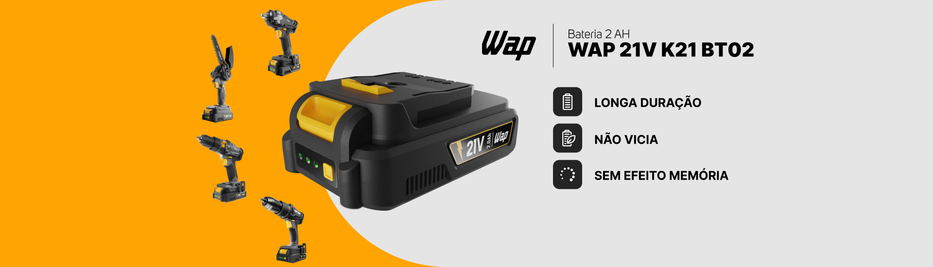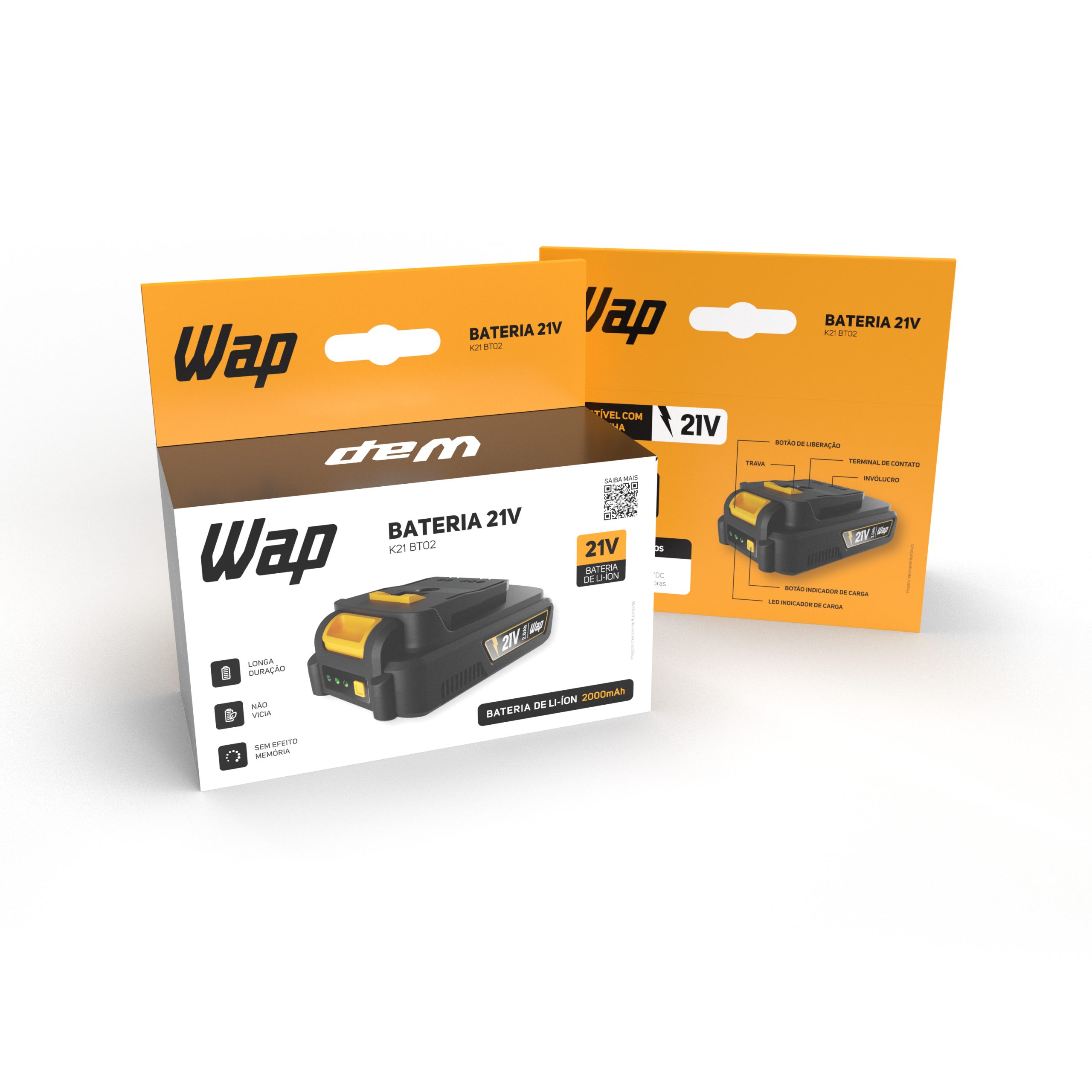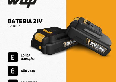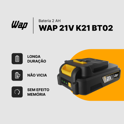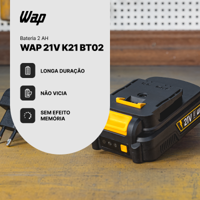 A Bateria WAP 21V K21 BT02 é compatível com todos os itens da linha 21V, oferecendo um desempenho robusto e confiável para aprimorar sua experiência.