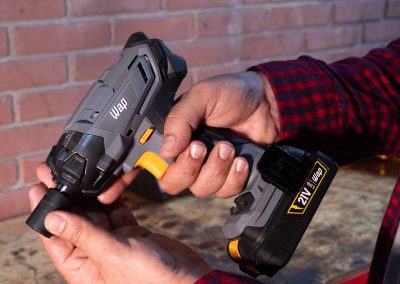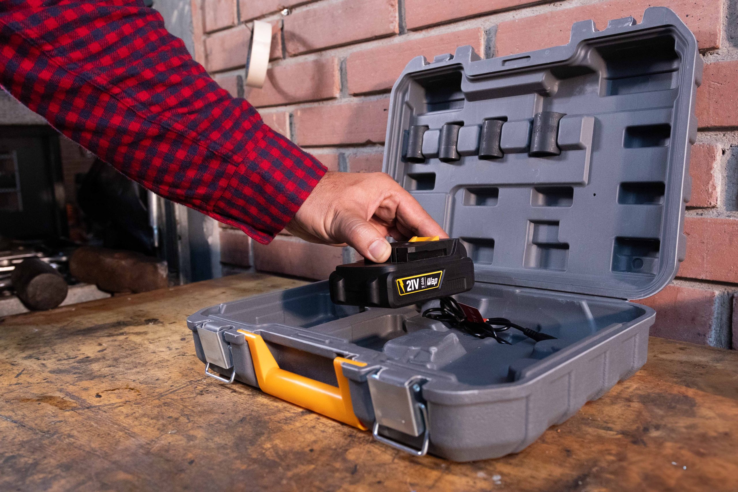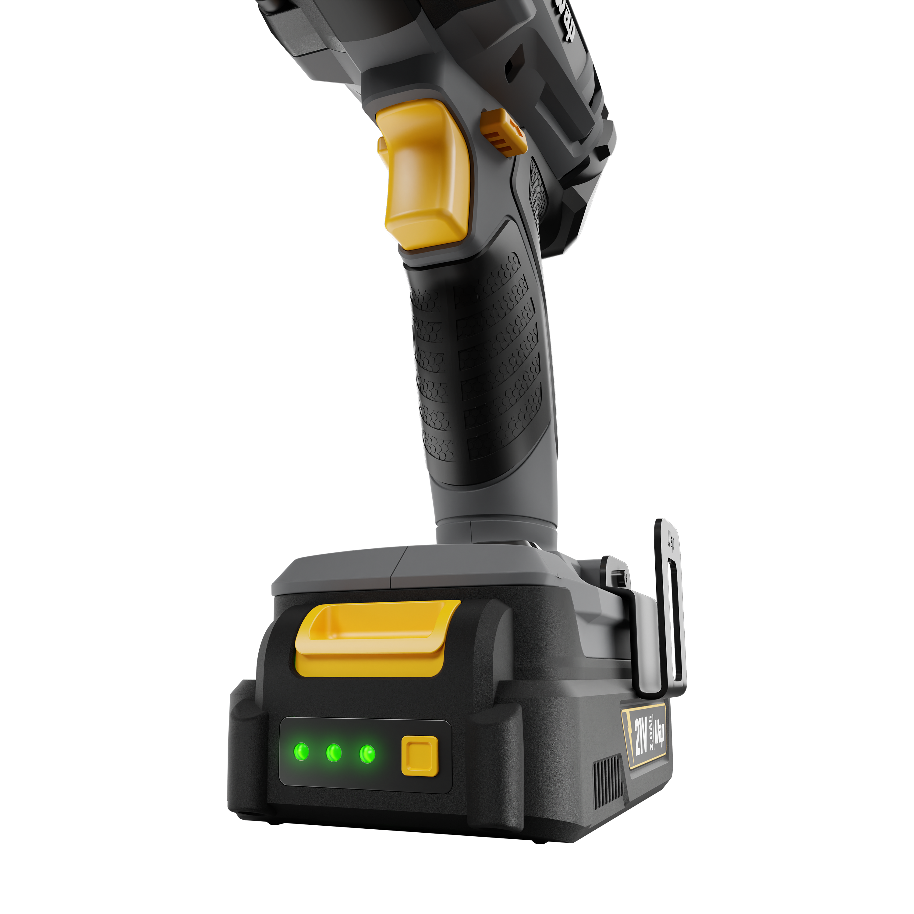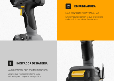 A empunhadura emborrachada proporciona conforto enquanto o seletor de reverso permite alternar facilmente entre os modos de aperto e desaperto. Possui uma bateria Li-íon removível de 21V e um indicador de bateria que mantém você informado sobre o status de energia.