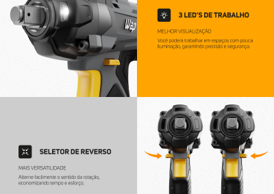 Com um torque máximo de 350Nm, a Chave de Impacto WAP K21 CH01 enfrenta desafios com facilidade, e seu design compacto e leve proporciona uma experiência confortável, mesmo durante longas sessões de trabalho.