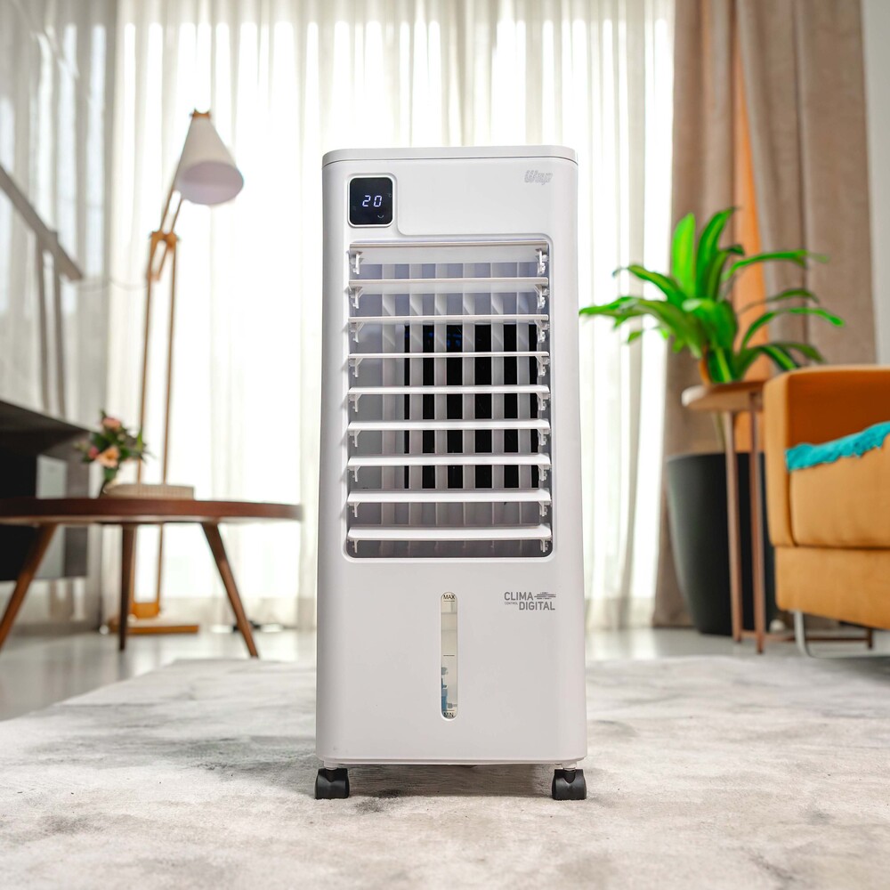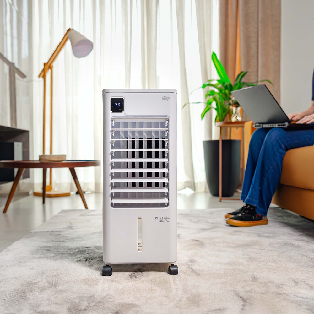 Completo para tornar os ambientes mais agradáveis, o Climatizador de Ar 3 em 1 WAP CLIMA CONTROL DIGITAL de 100W de potência, possui capacidade de 8,5 litros, mais dois blocos para congelamento, e um sistema de oscilação que garante a distribuição uniforme de ar nos cômodos, e o uso de gelo potencializa o efeito refrescante.