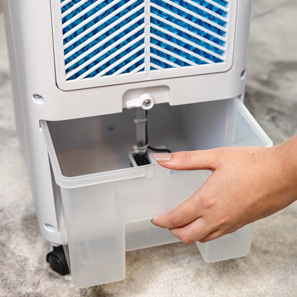 - A pega para transporte e as rodas facilitam o deslocamento do climatizador entre os cômodos.