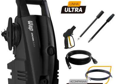 É a opção ideal para lavar quintal, calçadas, bicicletas, motos, carros e paredes com rapidez e agilidade, além de economizar até 80% de água se comparada à mangueira tradicional, enquanto a mangueira de jardim gasta aproximadamente 24 litros por minuto, a Desobstruidora e Lavadora WAP ATACAMA BLACK ULTRA consome aproximadamente apenas 4,4 litros por minuto. Portátil e Eficiente, a WAP ATACAMA BLACK ULTRA possui bomba axial com cabeçote de alumínio e pistões em aço inox.