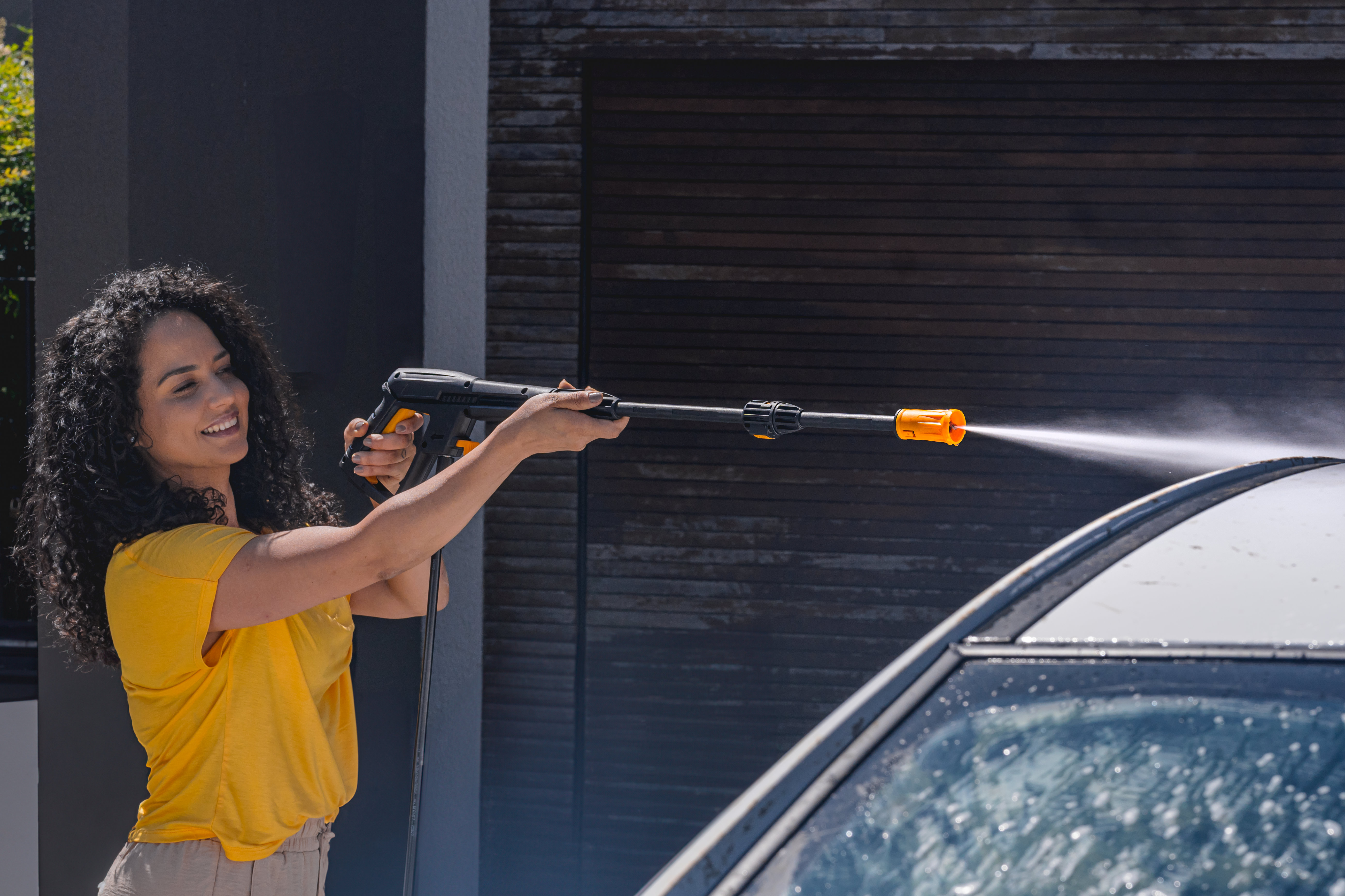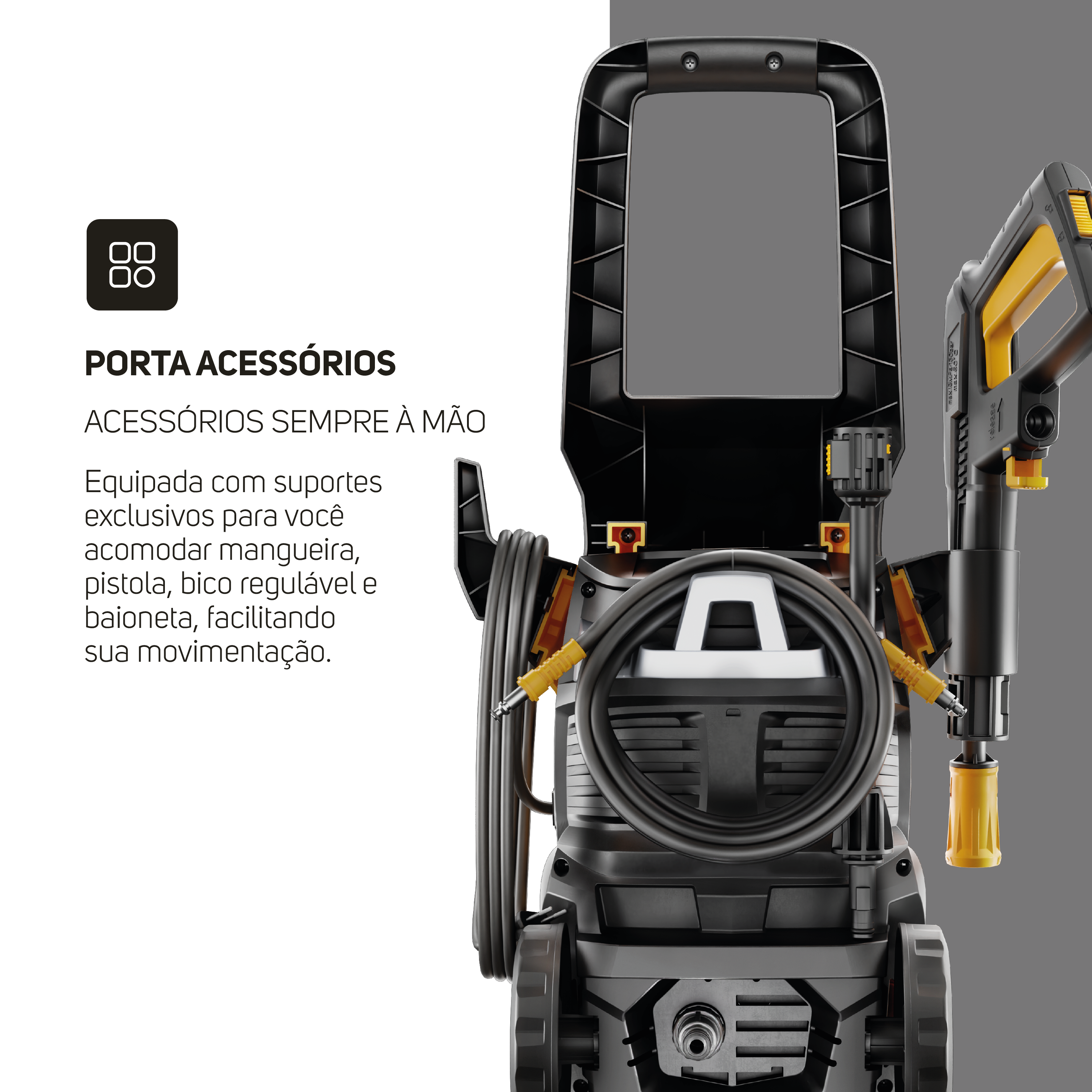 Além disso, seu design inclui um porta acessórios dedicado para a pistola de alta pressão e a mangueira de alta pressão. Isso significa que você pode manter tudo organizado e sempre à mão enquanto trabalha.