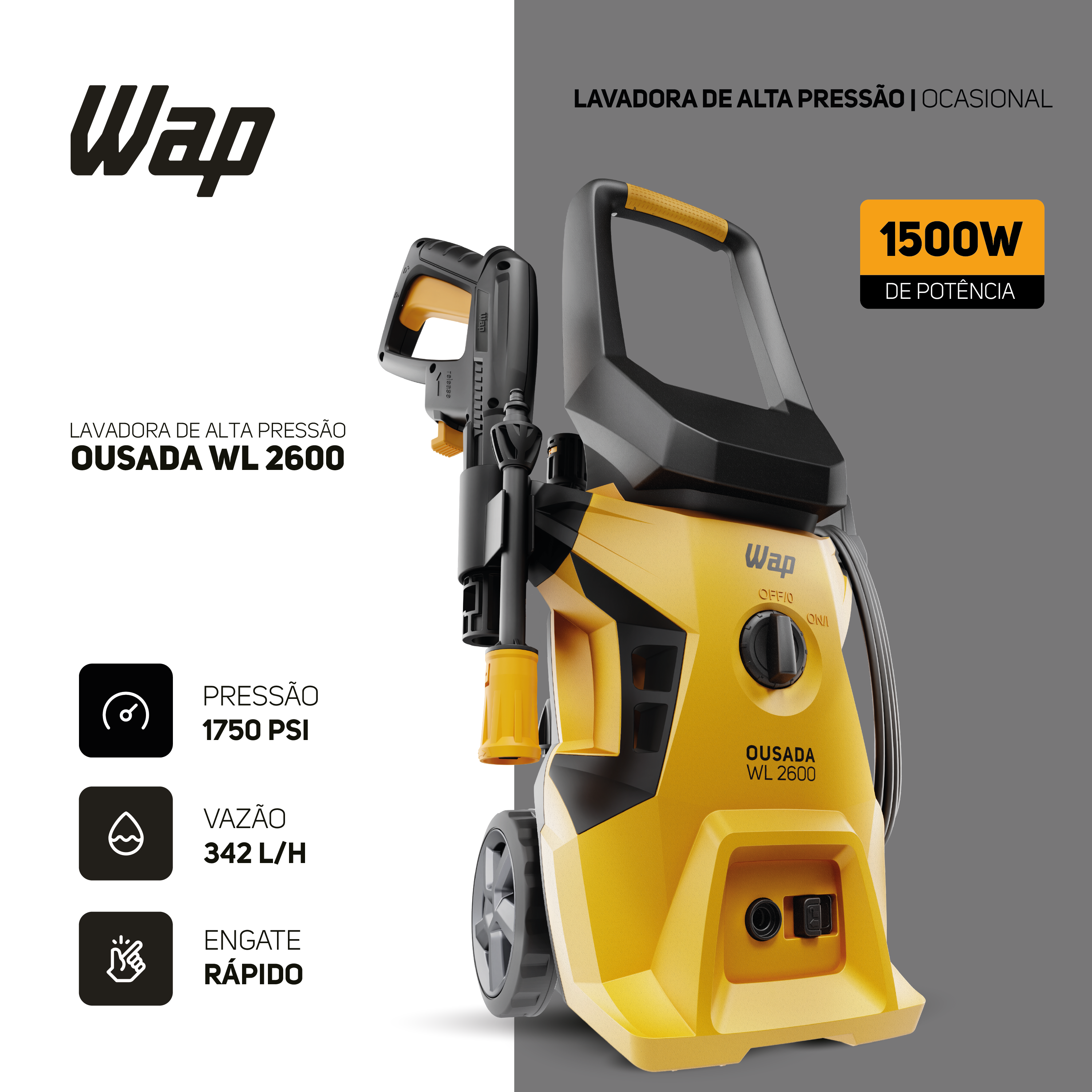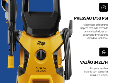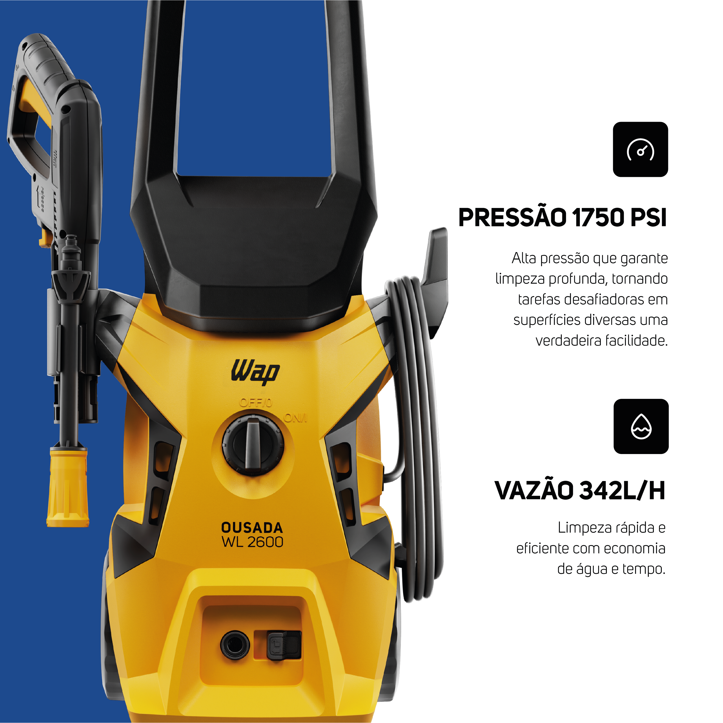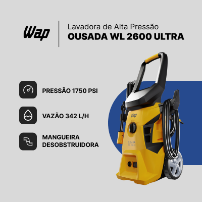 Com uma pressão de 1750 PSI e uma vazão de água de 342 litros por hora, a Lavadora e Desobstruidora de Alta Pressão WAP Ousada WL 2600 ULTRA garante resultados excepcionais em todas as superfícies que você precisa limpar.