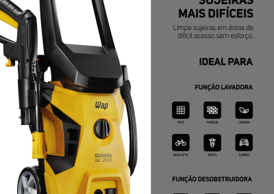Esta lavadora é versátil e se adapta a várias situações. Ideal para limpar pisos, paredes, carros, motos, bicicletas, jardins, calhas, canos, pás e até mesmo banheiros, a Desobstruidora Lavadora de Alta Pressão WAP Ousada WL 2600 ULTRA é a solução completa para todas as suas tarefas de limpeza.