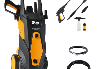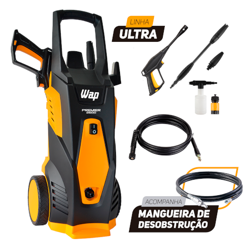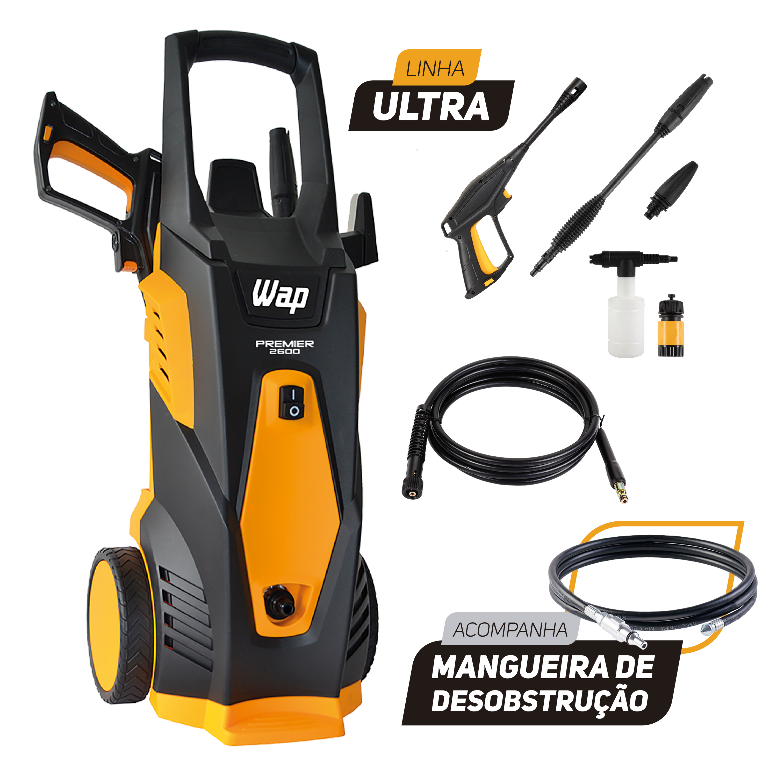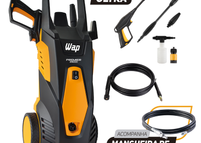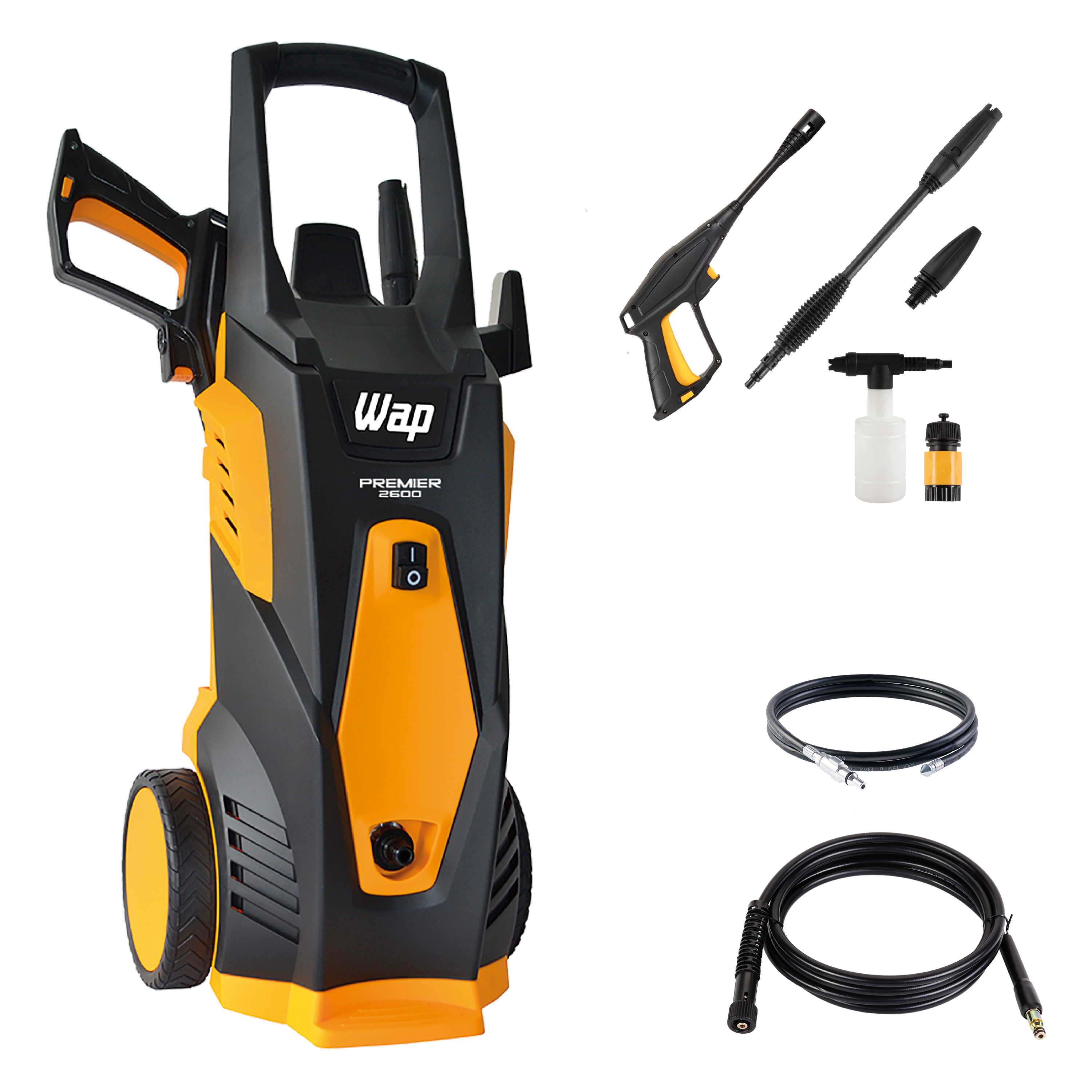 Equipada com alça e rodas que facilitam o transporte, a WAP Premier ULTRA 2600 conta com cabo elétrico de 5 metros, mangueira de alta pressão de 5 metros, mangueira desentupidora de 2 metros, trava de segurança da pistola, bico regulável (concentrado ou leque), aplicador de detergente e o sistema stop total, que corta o fluxo de água e a energia do motor ao soltar o gatilho, poupando energia e aumentando a vida útil do motor. A lavadora de alta pressão conta também com bomba axial com cabeçote de alumínio e pistões em aço inox que conferem mais durabilidade para o produto.