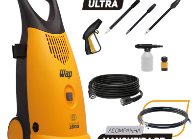 A Desobstruidora e Lavadora de Alta Pressão WAP Premium ULTRA 2600 vem com um porta-acessórios que acomoda pistola, baioneta e lança. E, para o trabalho ficar ainda mais fácil e dinâmico, ela vem equipada com o engate rápido, para você montar e desmontar a mangueira em um clique, sem a necessidade de usar ferramentas. Se você procura agilidade e praticidade para o seu dia a dia, não perca mais tempo e garanta já a sua Desobstruidora Lavadora de Alta Pressão WAP Premium ULTRA 2600.