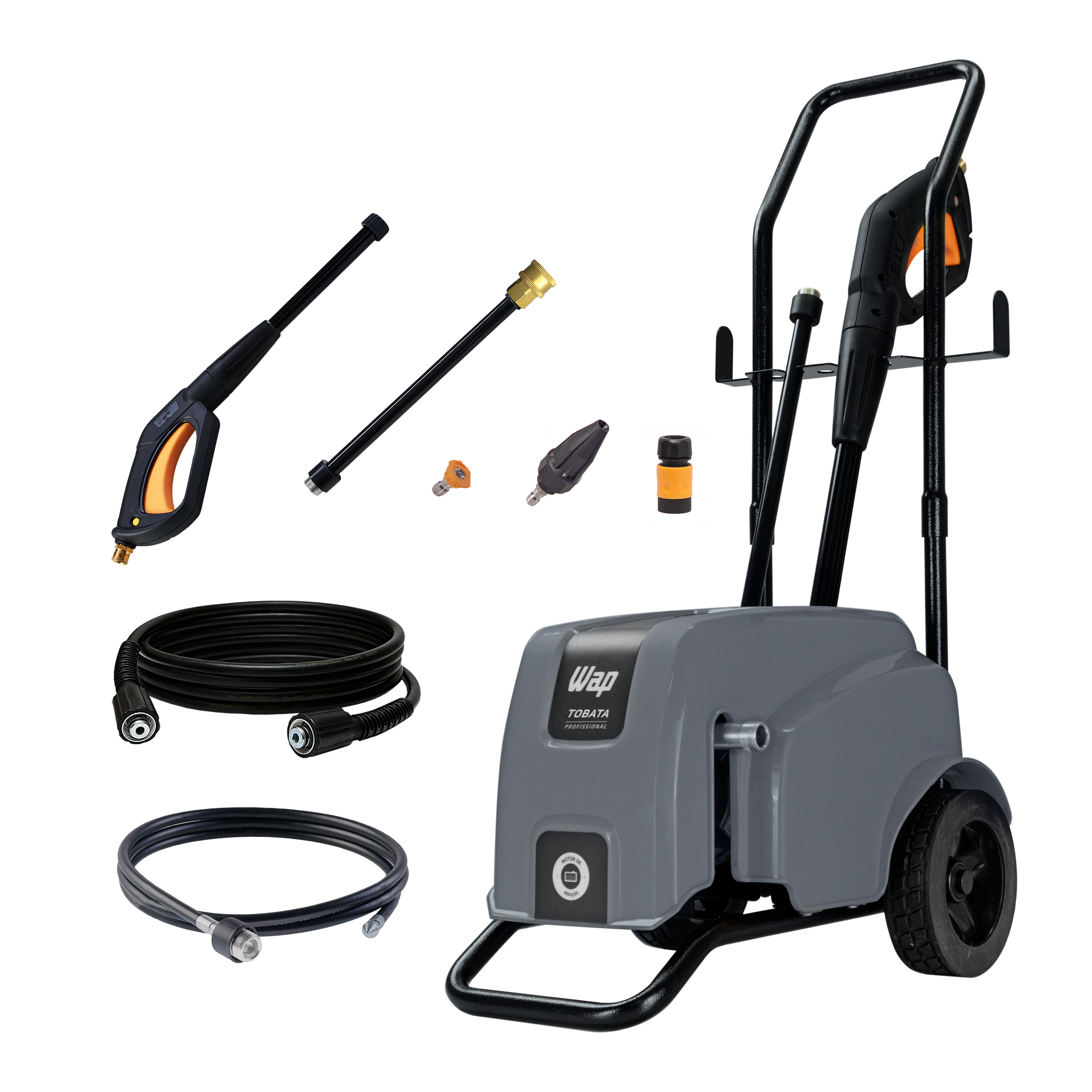 | Pistola de alta pressão Engate rápido Lança com bico de alta pressão Mangueira de alta pressão 7,5 metros Mangueira desentupidora de 2 metros. Suporte da lança Suporte da pistola Suporte da mangueira Suporte cabo elétrico Bico Turbo |