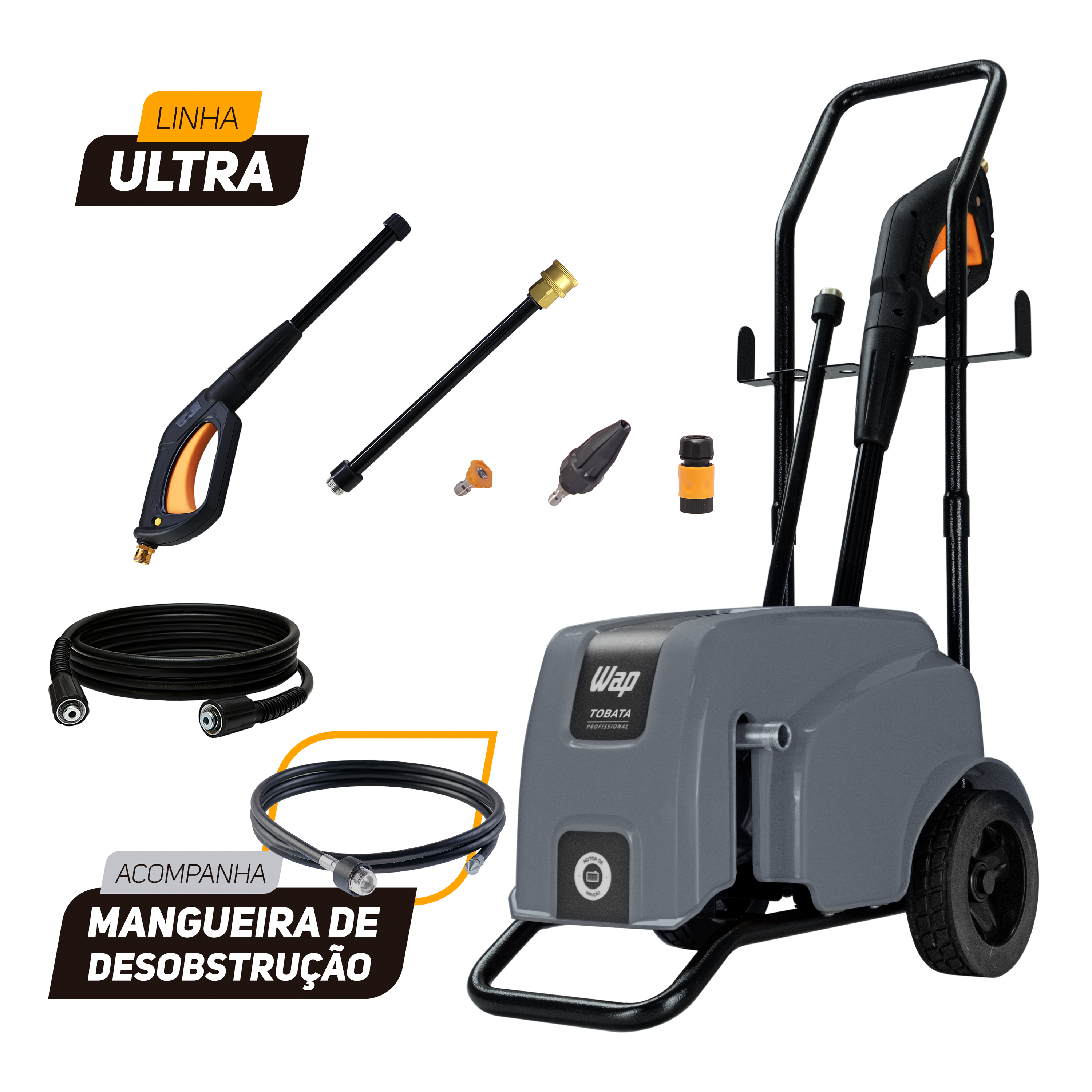 DESOBSTRUIDORA WAP TOBATA TURBO ULTRA é uma maquina compacta, durável, robusta e super prática para carregar na caixa de transporte de motocicletas, possui motor de indução e não necessita de nenhuma instalação elétrica especial, basta ligar na tomada e pronto, a máquina está pronta para o uso. Possui um exclusivo porta acessórios, que ajuda na organização do produto para guardar, bico turbo para sujeiras mais difíceis, mangueira de alta pressão de 7,5m além da bomba axial com cabeçote em alumínio, pistões em aço inox e potência de até 2,2 kW e vazão de 500l/h, o que garante maior poder de arrasto da sujeira. Além disso, a versão WAP ULTRA vem equipada com uma incrível mangueira desentupidora de 2 metros para desentupir canos, calhas e tubulações com facilidade utilizando jato de água.