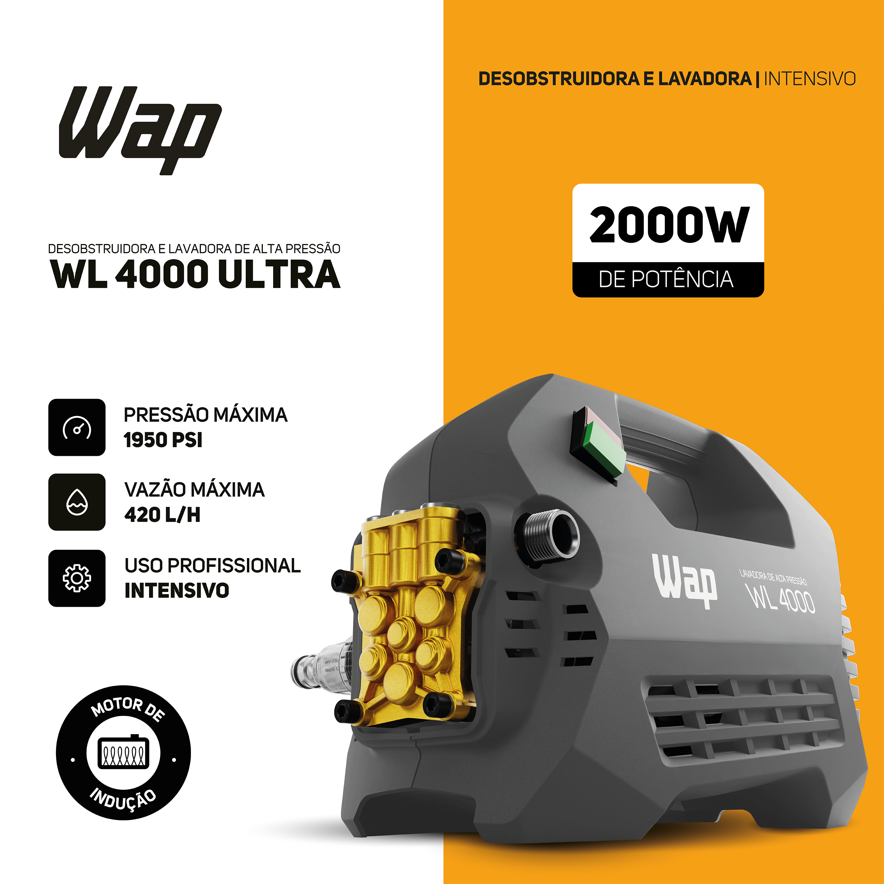 A Desobstruidora e Lavadora WAP WL 4000 ULTRA é alimentada por um motor de indução de alta eficiência, garantindo durabilidade e desempenho consistentes mesmo durante as tarefas mais exigentes.
