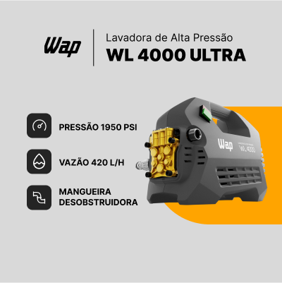 Com a Desobstruidora e Lavadora de Alta Pressão WAP WL 4000 ULTRA você tem a solução para suas demandas de limpeza profissional intensiva. Com uma potência de 2000W, vazão máxima de 420L/h e pressão máxima de 1950 PSI, ela oferece um poderoso jato de água capaz de eliminar sujeira, graxa e detritos incrustados de maneira eficaz e rápida, além de desentupir canos, calhas e tubulações com facilidade utilizando jato de água!