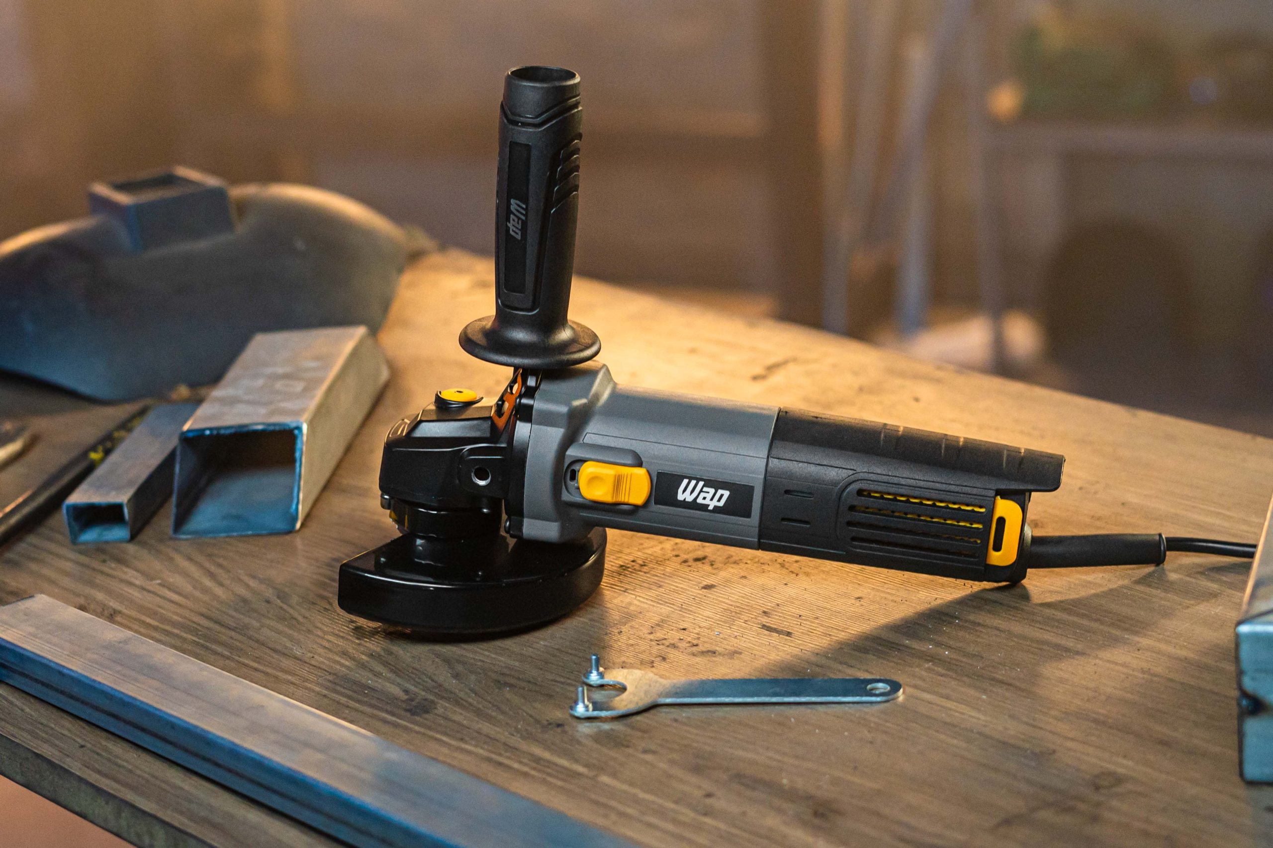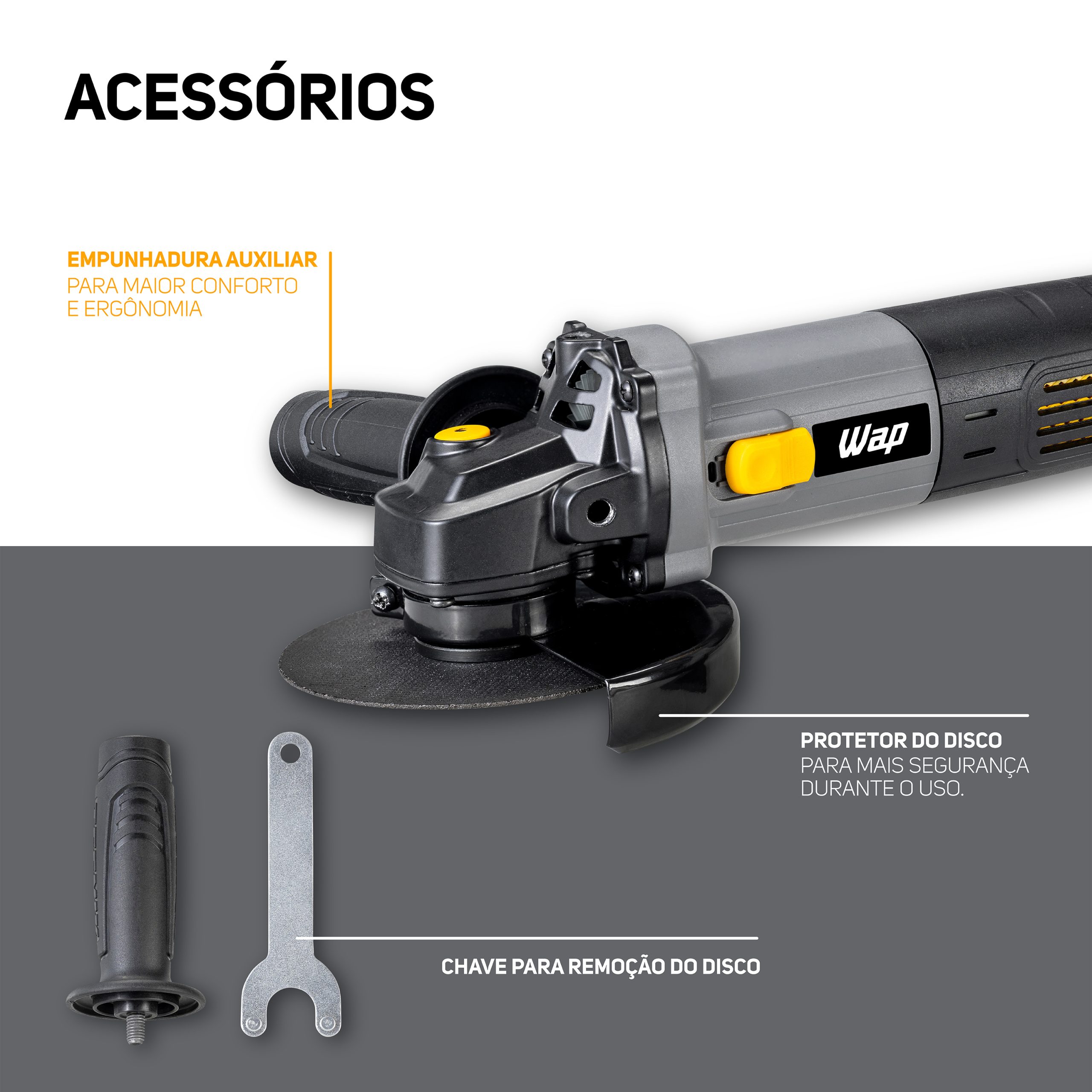 A WAP ESMERILHADEIRA ANG 5" WF ES01 conta com acessórios que facilitam sua rotina de trabalho. Além da empunhadura auxiliar, você pode usar a chave de troca de disco para ajustar a ferramenta e o protetor de disco, que oferece mais segurança ao desviar faíscas, poeira e detritos durante o uso.