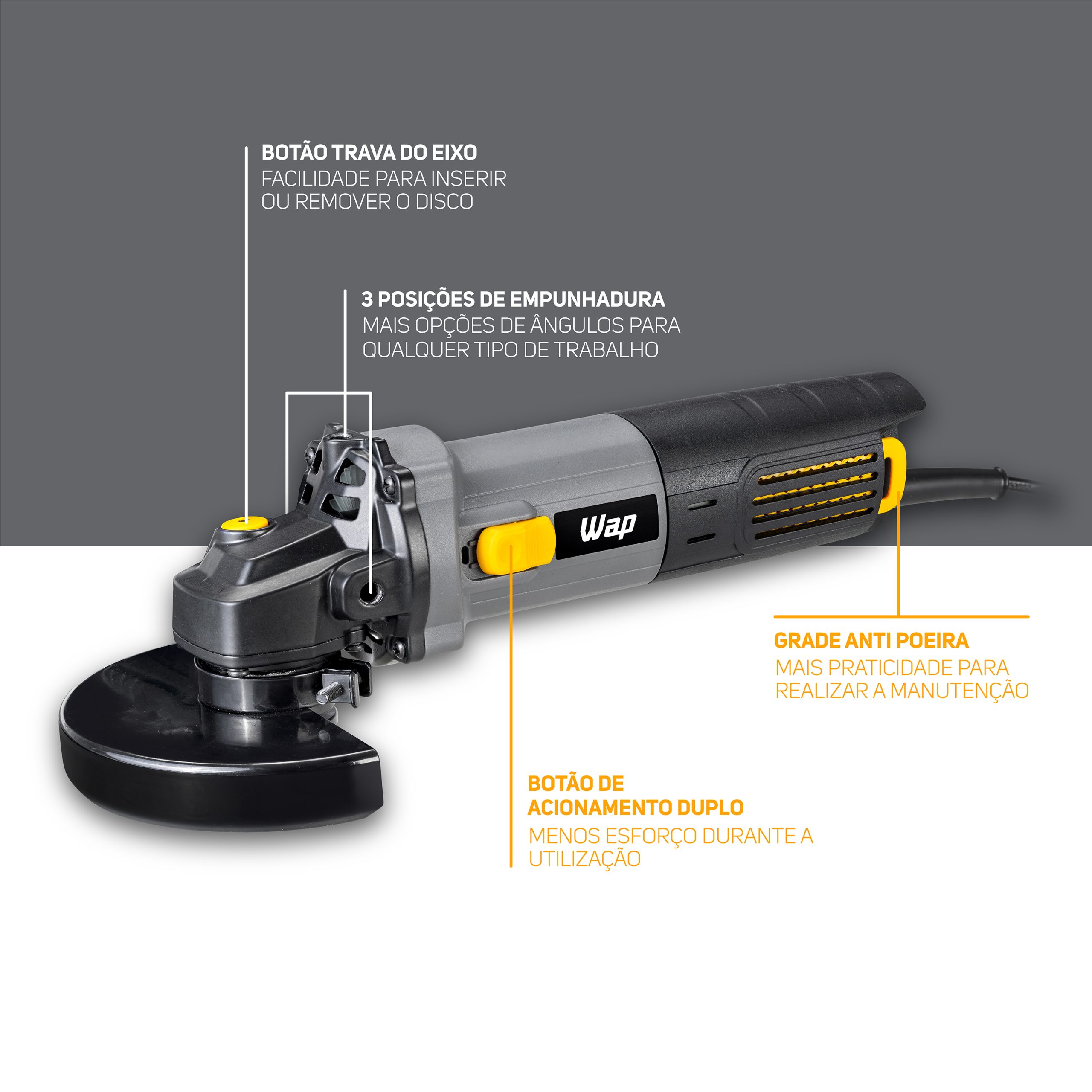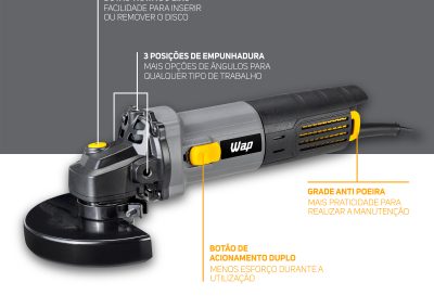 WAP ESMERILHADEIRA ANGULAR 5” WAP WF ES01 Com Empunhadura Auxiliar E Grade Anti-Poeira 127V