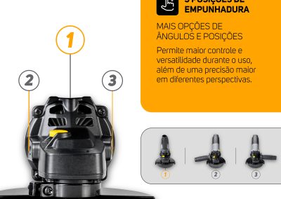 Desenvolvida para proporcionar controle total e menos fadiga durante a utilização, a empunhadura auxiliar da ferramenta conta com três opções de posições, que permitem o manuseio em diferentes perspetivas. Compacto e ergonômico, o equipamento eleva sua experiência de trabalho com segurança, praticidade e flexibilidade em todos os ângulos.