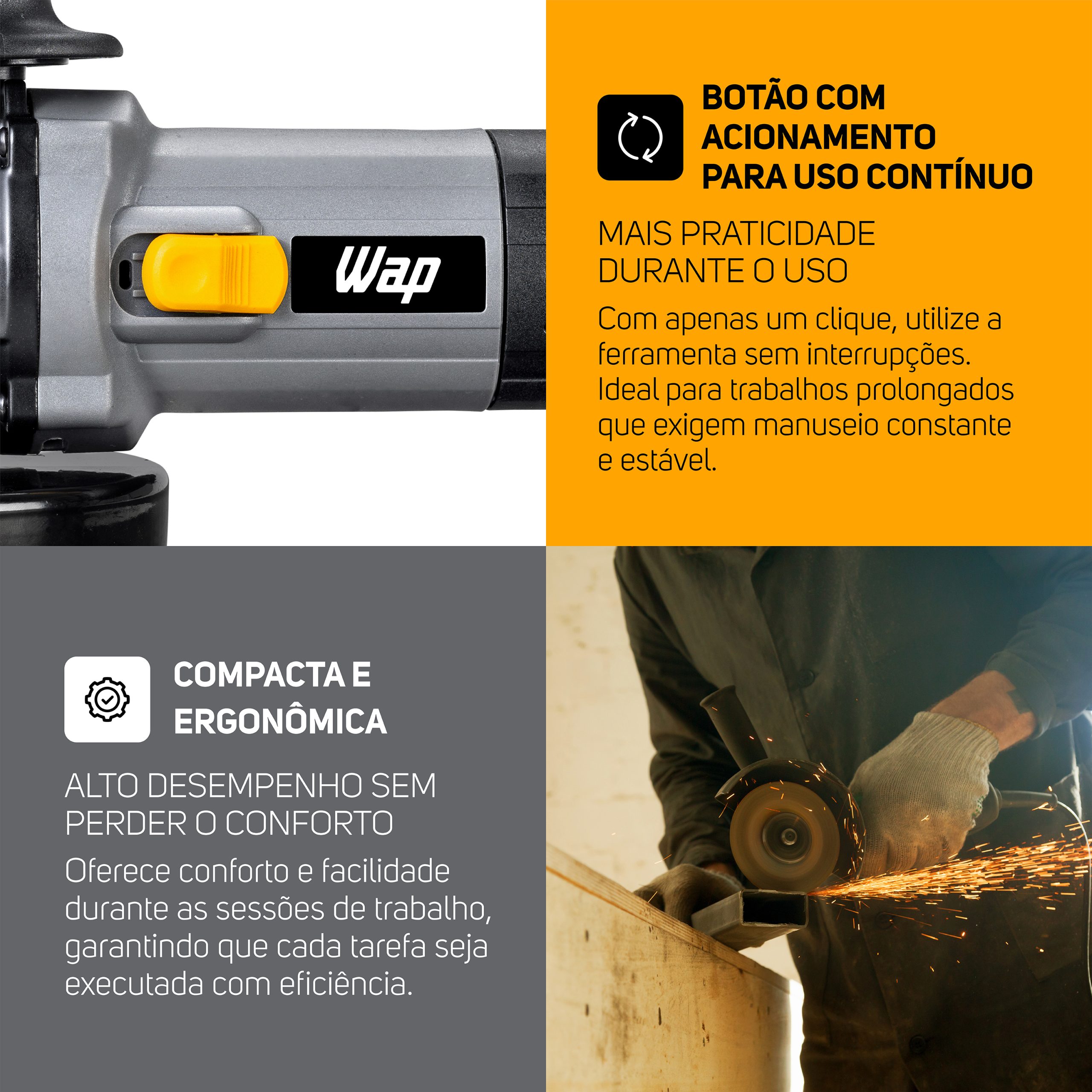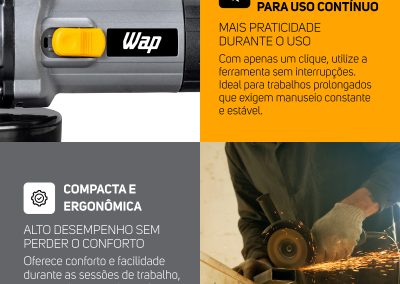 Com 13.000RPM, o disco giratório se movimenta em alta velocidade para realizar cortes precisos em diferentes materiais, garantindo acabamento de qualidade. O botão de trava de eixo facilita a troca de utensílios de forma segura e ágil. A esmerilhadeira angular WAP é versátil, pois desempenha diferentes funções na sua rotina, conforme o disco escolhido.