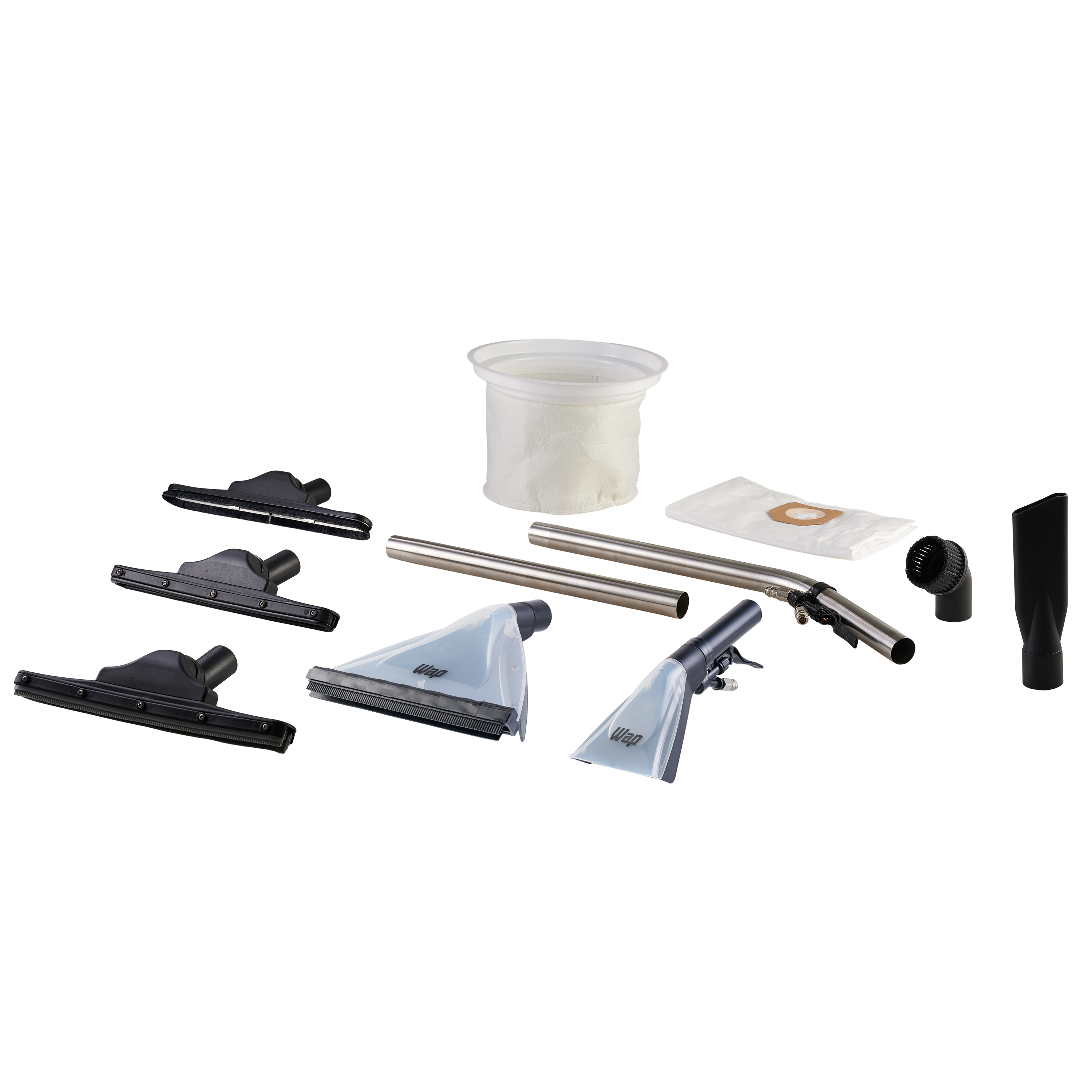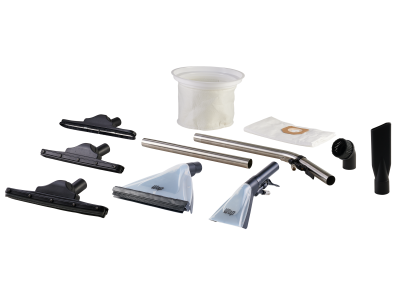 | 1 Extensão reta em aço inoxidável. 1 Extensão curva em aço inoxidável. 1 Bico extrator grande com rodo e escova para piso frio, tapetes e carpetes. 1 Bico extrator pequeno para estofados. 2 Bicos para limpeza de pisos frios 1 Bico para tapetes e carpetes 1 Bico com cerdas para estofados 1 Bico canto 1 Mangueira flexível de 2,5 metros. 1 Filtro descartável. 1 Filtro espuma. 1 Filtro chapéu lavável. |