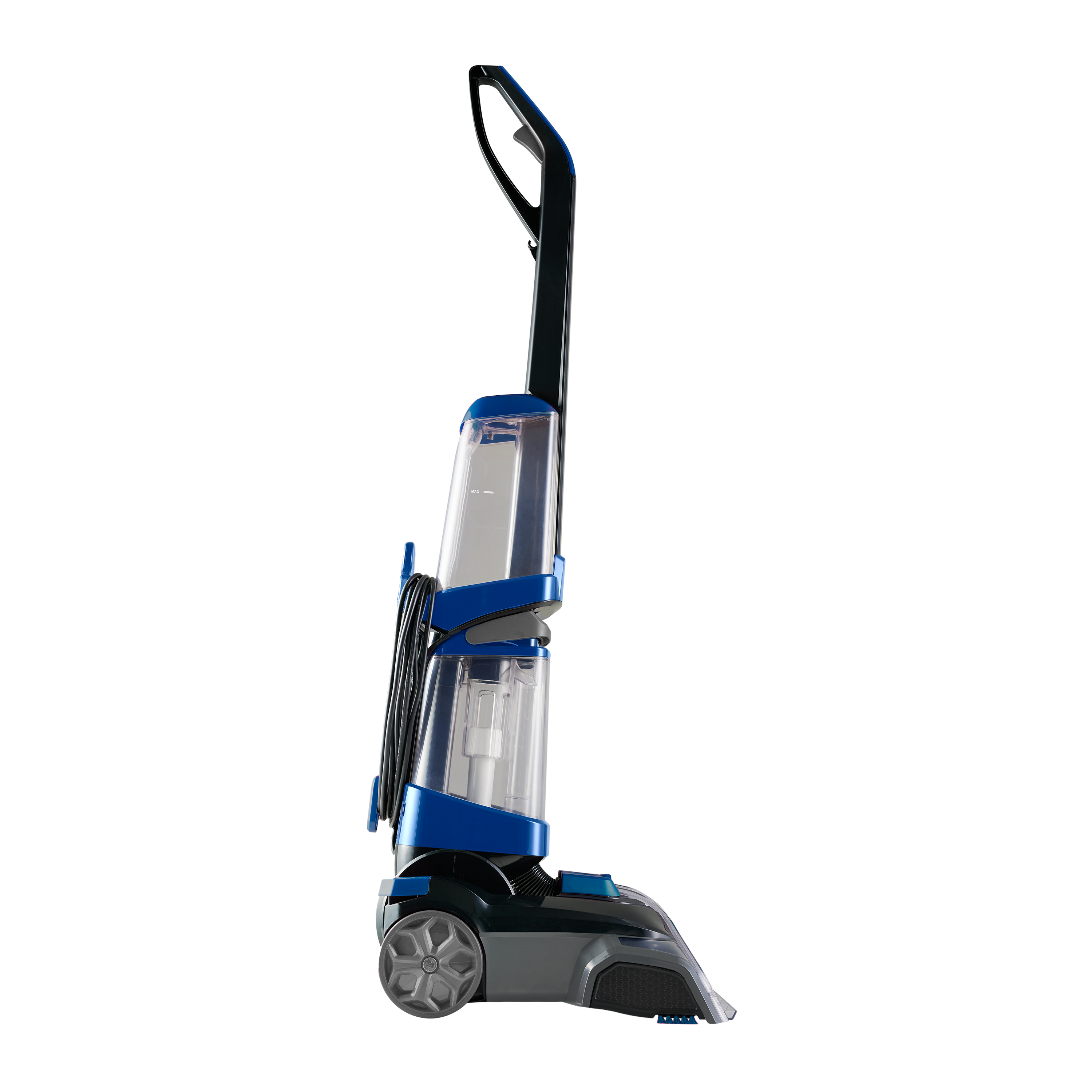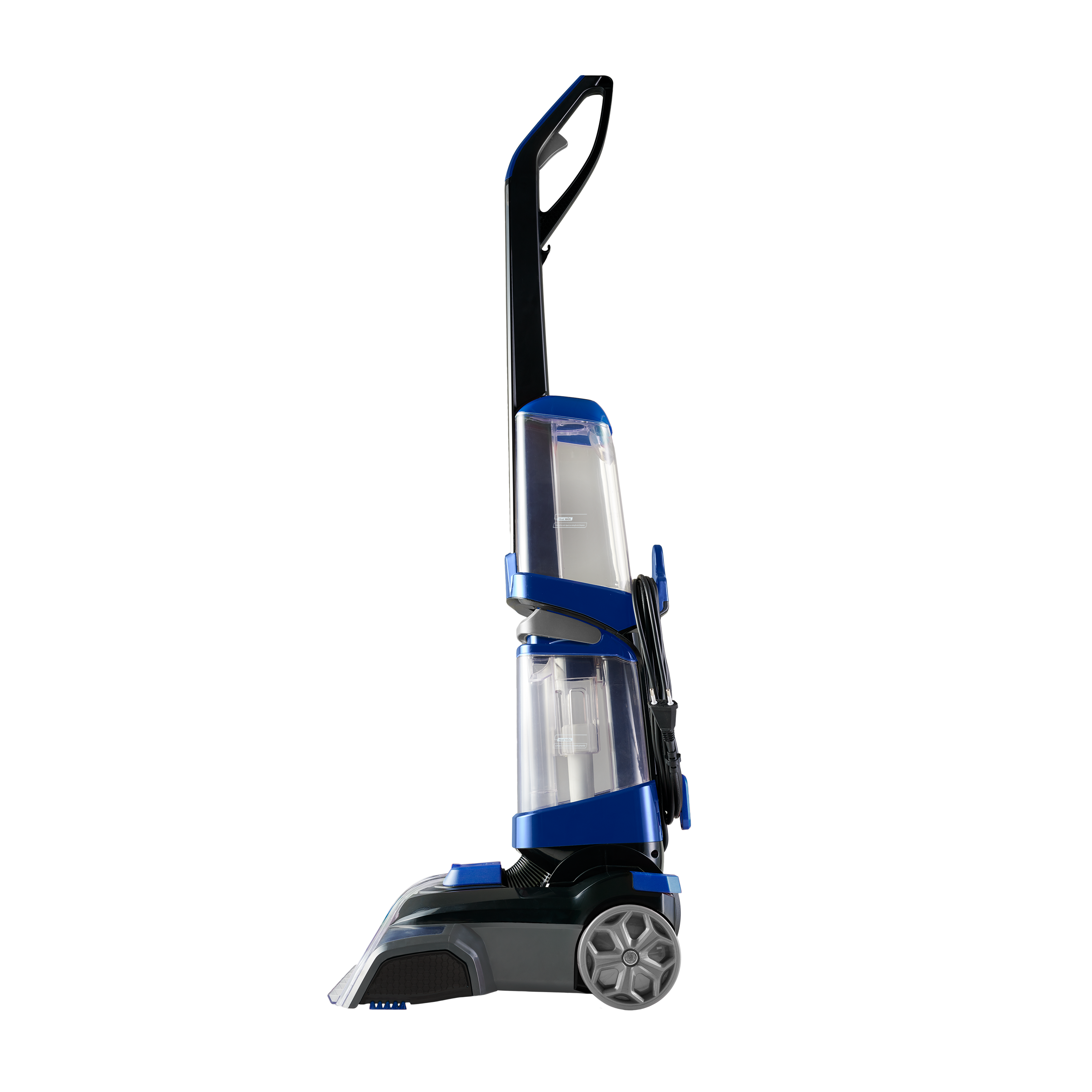 2 Rodas grandes Alça de transporte com gatilho spray Enrolador para cabo elétrico Cabo elétrico de 7 metros Recipiente para água limpa com capacidade de 1,5 litros Recipiente para água suja com capacidade de 1,5 litros Escova oscilante para tapetes e carpetes |