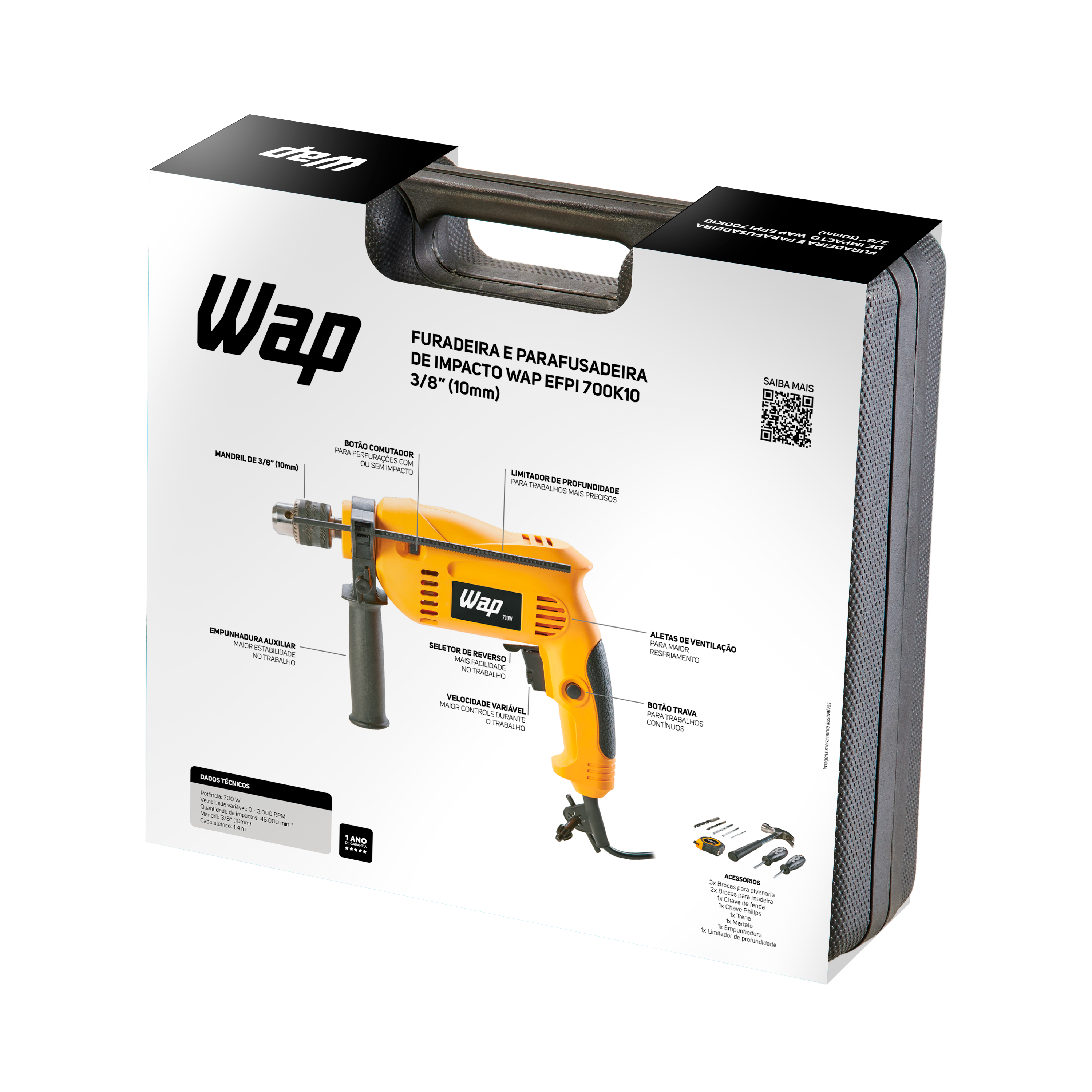 A qualidade e a confiabilidade da marca WAP está presente na Furadeira e Parafusadeira de Impacto EFPI 700K10. Para quem procura eficiência e força para os trabalhos esta é a opção ideal para perfurar aço, concreto e madeira com facilidade. Seu design ergonômico garante perfurações segura e prática. A Furadeira e Parafusadeira de Impacto EFPI 700K10 possuí empunhadura ergonômica e tem o punho auxiliar multidirecional, adaptando-se facilmente às características de cada usuário. A WAP EFPI 700K10 possui um motor potente de 700W e mandril de (3/8”) com capacidade para brocas de até 10mm, esta ferramenta oferece excelente capacidade de perfuração. A furadeira e parafusadeira de impacto WAP possui botão comutador que permite executar perfurações com ou sem impacto, aumentando a versatilidade da ferramenta, que pode ser usada em serviços mais pesados.