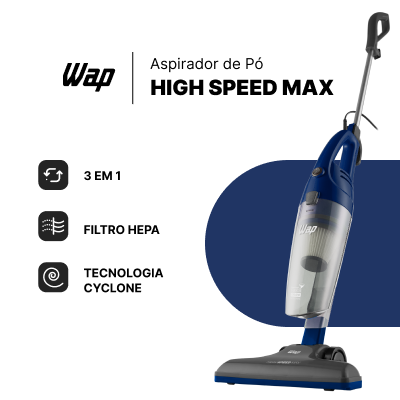 Um dos atributos que destacam o WAP High Speed Max é a tecnologia cyclone, que compacta toda a sujeira, aumentando o seu poder de sucção e aspirando com muito mais eficiência. Ele também conta com o filtro HEPA, que pode ser removido e lavado. Através da ação dele, o ar fica mais puro, livre de alergênicos, ácaros, fungos e bactérias.